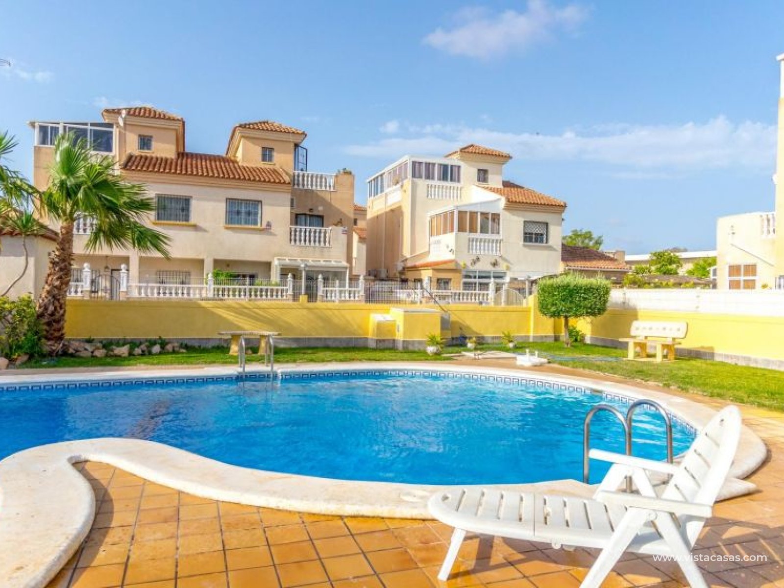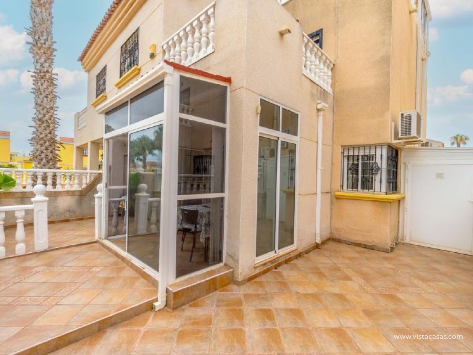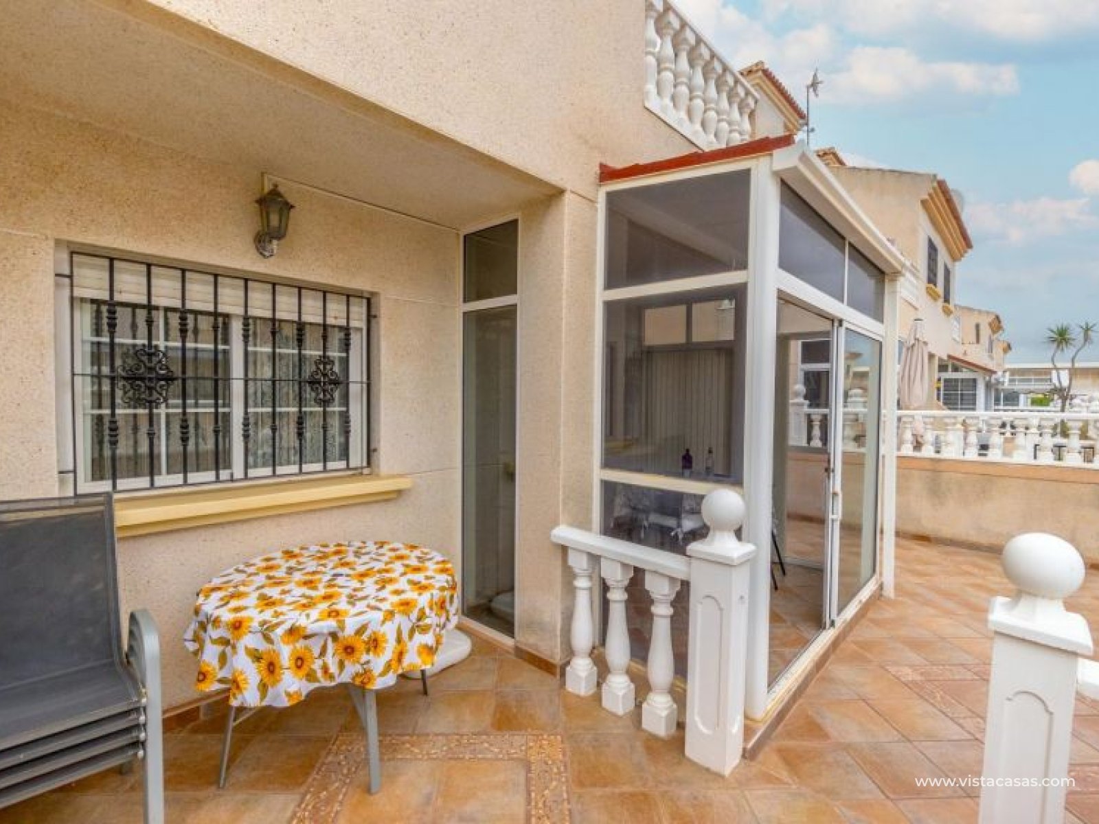 Your new home on the Costa Blanca is waiting for you! Imagine living under the Mediterranean sun in a bright, comfortable home, ready to move in from day one. This beautiful quad-style townhouse in Residencial El Coral II, Torrevieja, has everything you need: space, location, and an ideal setting for year-round living, holidays, or a solid investment. The property is distributed over two floors plus a private roof terrace. At the entrance, you’ll find a spacious tiled garden, perfect for relaxing or entertaining outdoors. There’s also off-street parking on the plot and a practical storage room. The ground floor features a bright glazed terrace – where you can enjoy sunny breakfasts – a light-filled living-dining room, a fully equipped independent kitchen, a closed utility room, and a guest toilet. On the first floor, there are two bedrooms, one with a private terrace, and a renovated bathroom with a walk-in shower. The roof terrace has been enclosed and converted into a third bedroom or multipurpose room. A marble staircase adds a touch of elegance. The home is sold furnished and ready to move into. The community offers a communal pool and is located in a peaceful yet well-connected area: supermarkets, schools, pharmacy, restaurants, sport zones, cinemas, and the beautiful La Siesta park nearby. And best of all: only 2.5 km from the beaches, 600 meters from the Pink Lake, and 40 km from Alicante airport. Don’t miss this opportunity – come and visit with no obligation. Call or message us today to schedule your viewing. Your new home in Torrevieja is waiting!