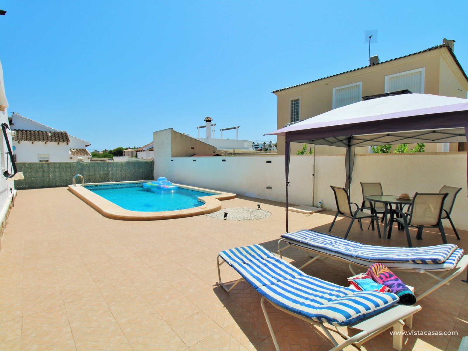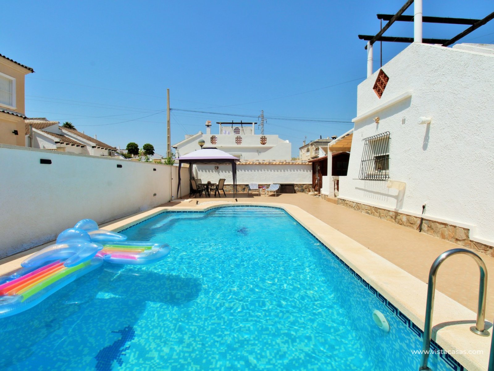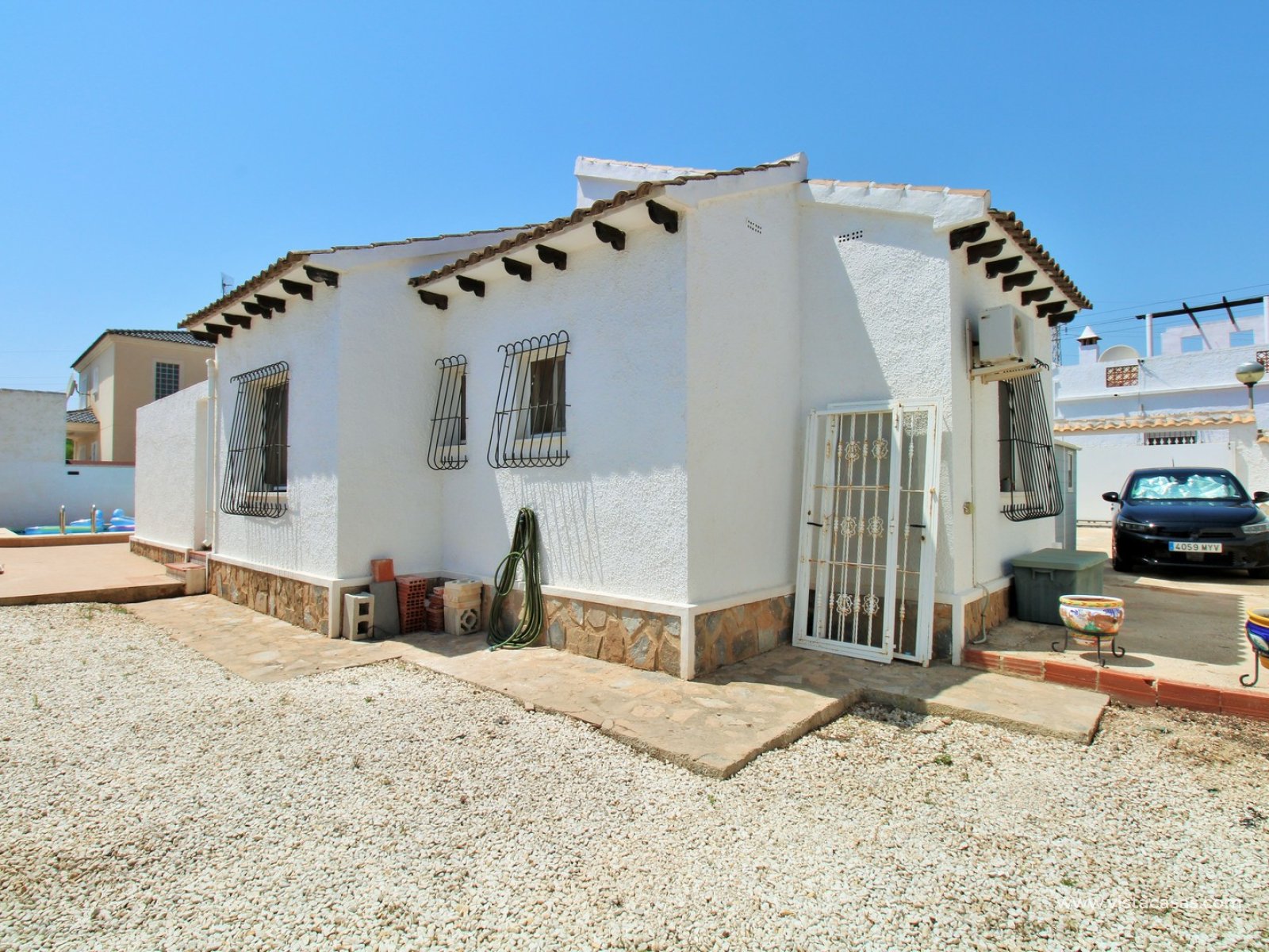 A beautifully presented three-bedroom, two-bathroom detached villa with a generous private swimming pool, set within the sought-after Eagles Nest neighbourhood, just minutes from Villamartin Plaza and its renowned golf course. Occupying a substantial 420m2 plot, the property offers extensive outdoor space designed for both relaxation and entertaining, with ample off-road parking secured by an electric gate. A short stroll brings you to local amenities, including the popular Cheers Bar and the San Miguel Bowls Club.