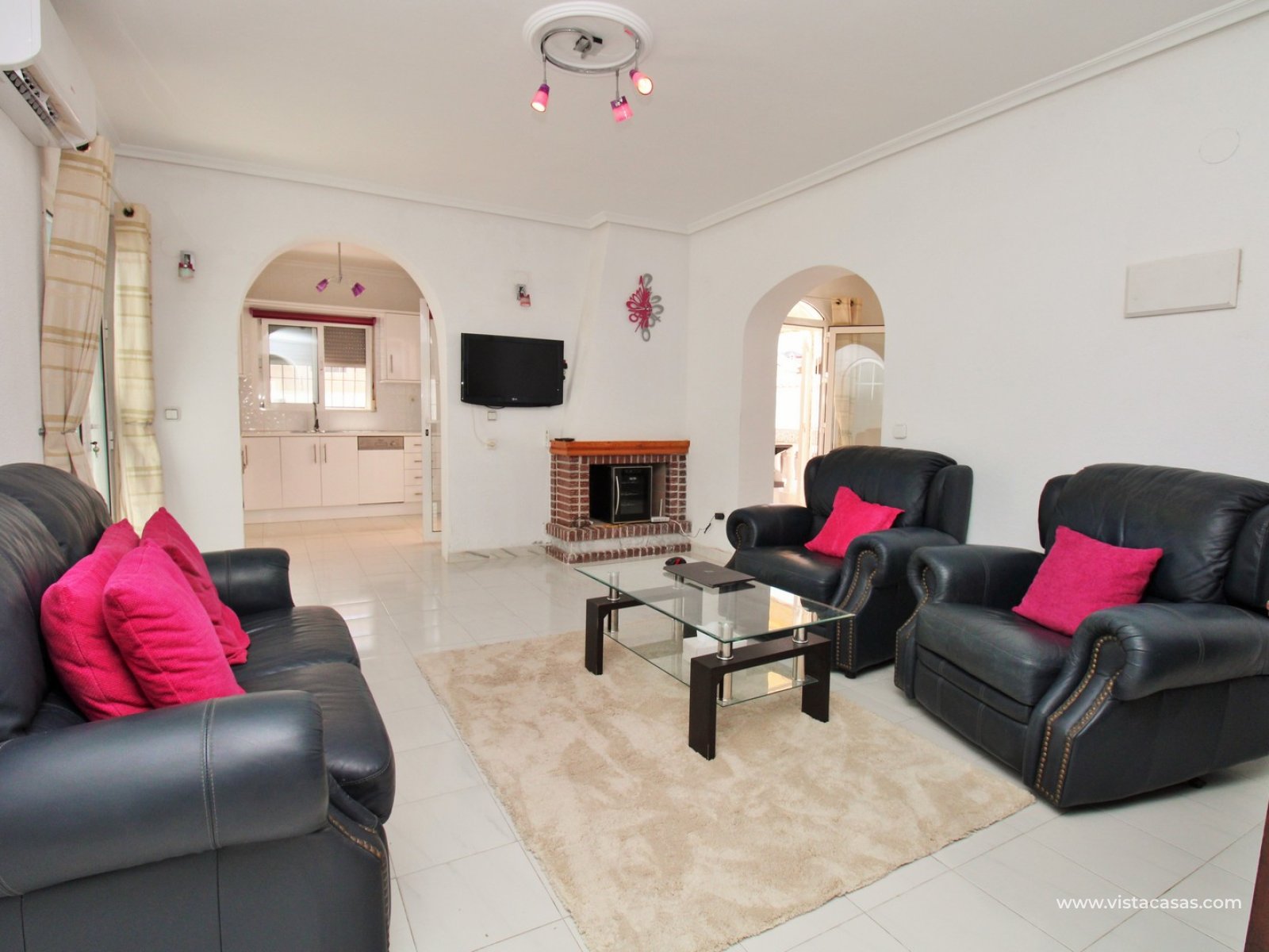 The villa’s accommodation is thoughtfully arranged across a single level. An inviting entrance terrace doubles as an outdoor dining area, leading into a spacious and light-filled living room with a feature fireplace and dining room. The modern open-plan kitchen is well-appointed with built-in appliances, and seamlessly integrates with the main living space. There are three double bedrooms, each with fitted wardrobes, and two renovated bathrooms finished to a high standard.