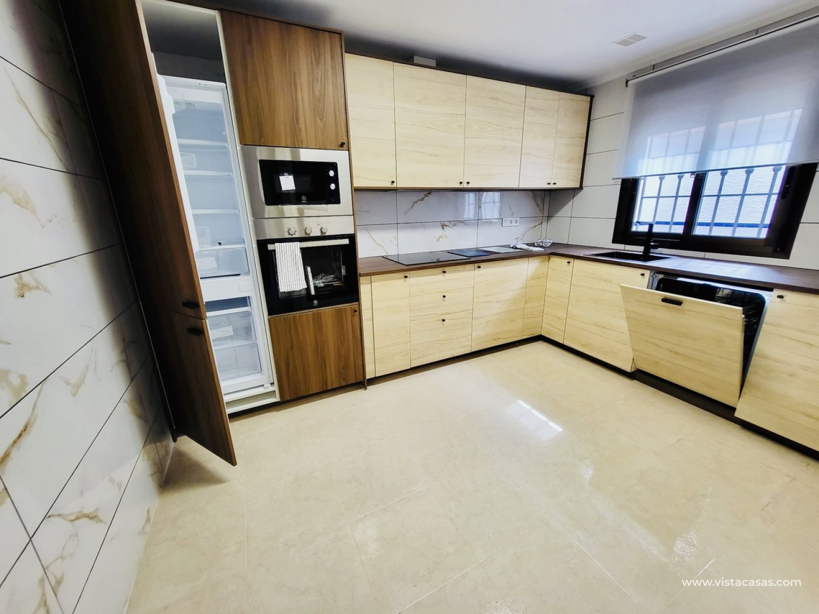 Elegant, fully renovated townhouse offering 3 spacious bedrooms and 3 modern bathrooms. The property features a generous, contemporary kitchen equipped with brand-new appliances, along with all-new, high-quality furnishings — all included in the sale price. The bright and open-plan living and dining area creates an inviting atmosphere, while each bedroom is fitted with built-in wardrobes for optimal storage. The villa sits on a plot of approximately 100 m² with a private garden, and residents can enjoy access to a communal swimming pool and landscaped green areas. Additionally, there is the option to purchase an underground parking space and a storage room of around 12 m².