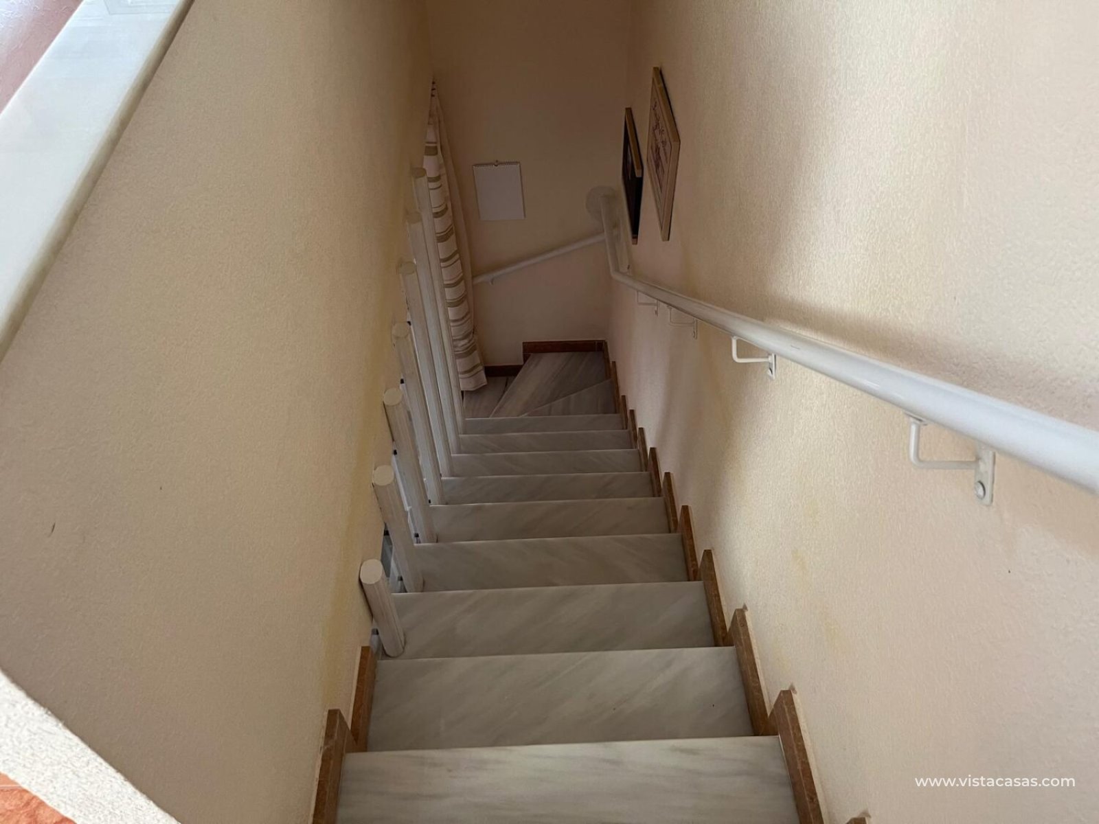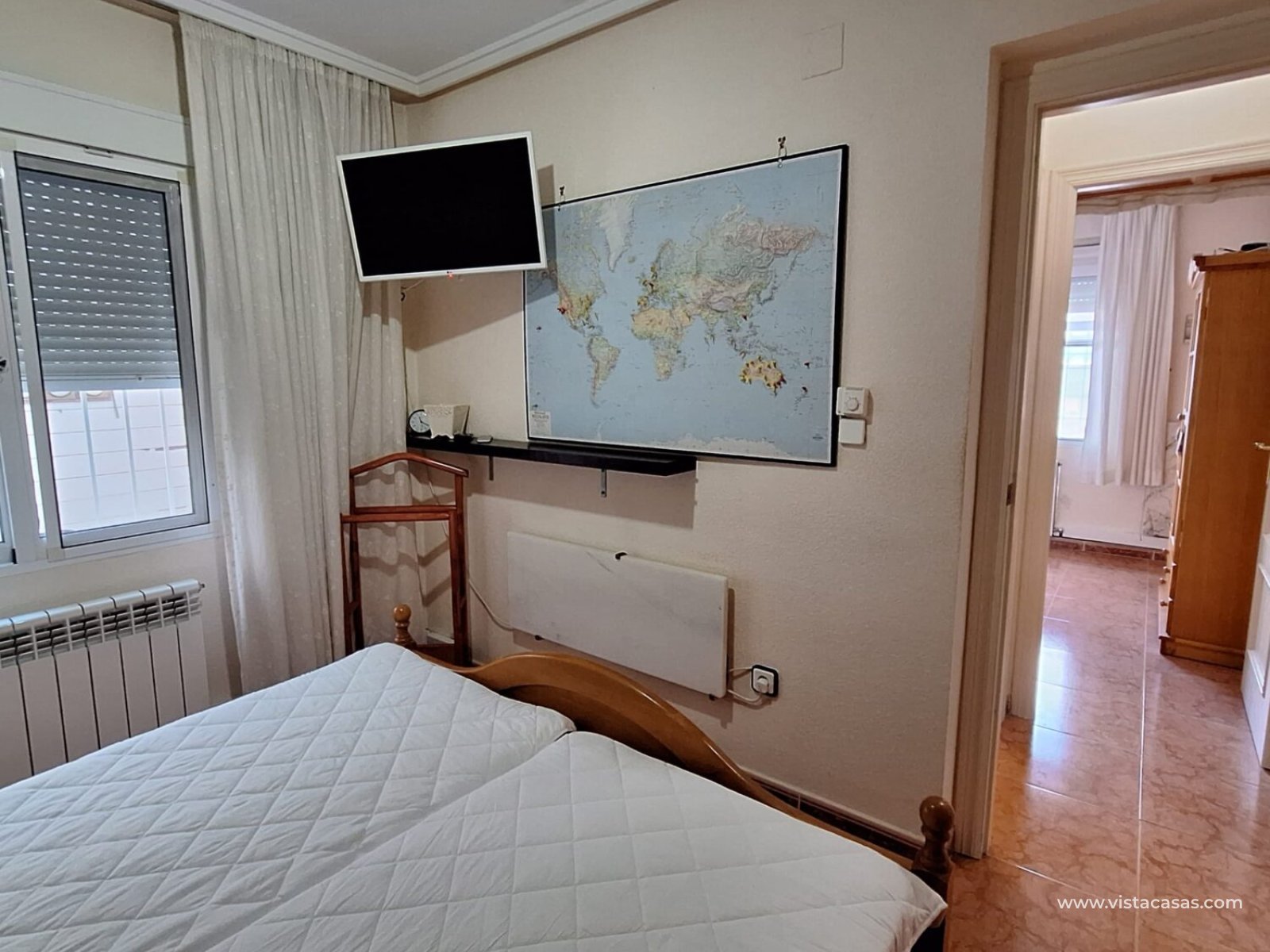 The upper floor comprises a third bedroom, a bright conservatory, and a spacious terrace. From here, stairs lead up to a rooftop tower with stunning sea views. The home is part of a friendly residential community that offers two communal swimming pools. Price: 209.000€