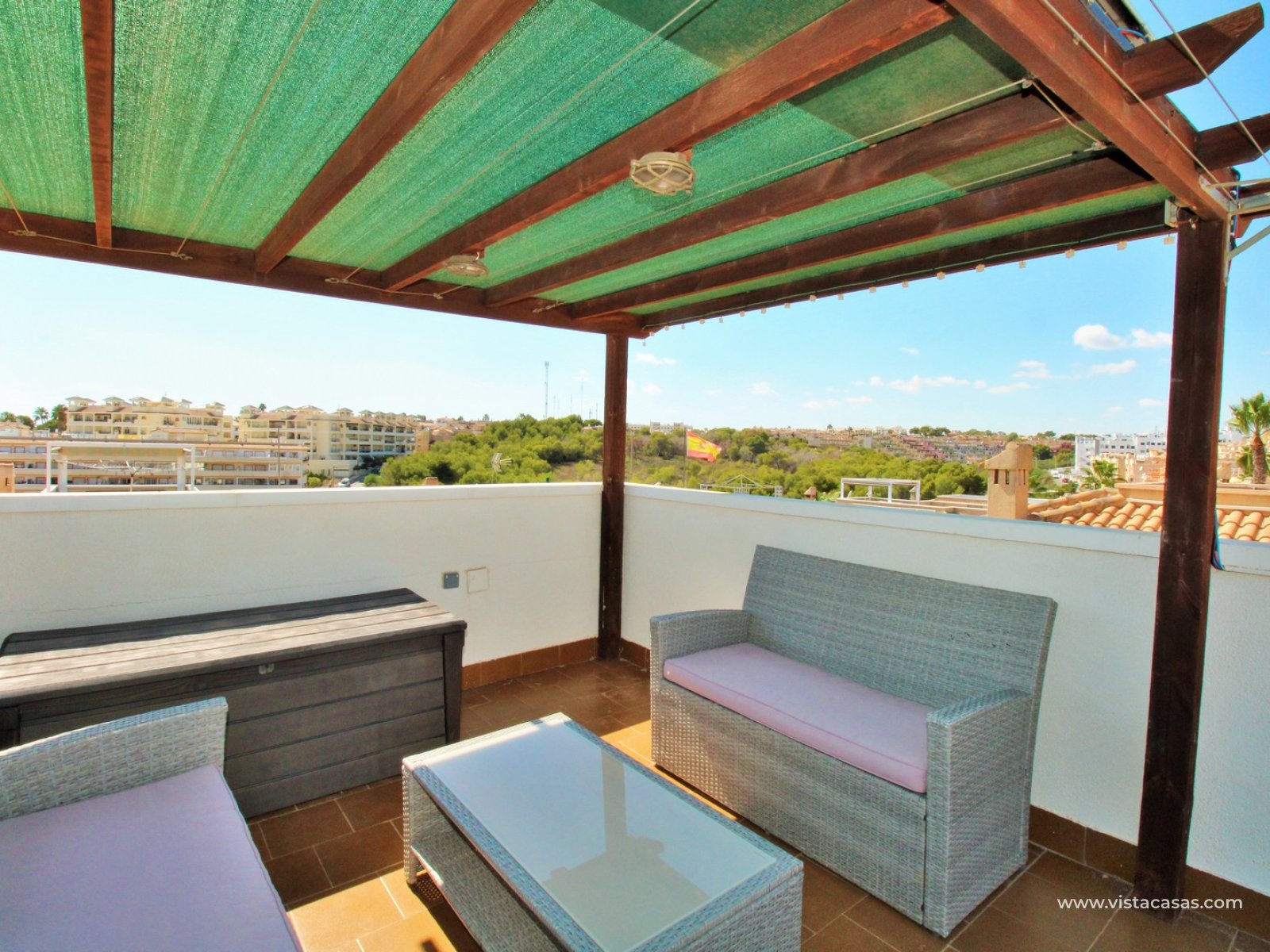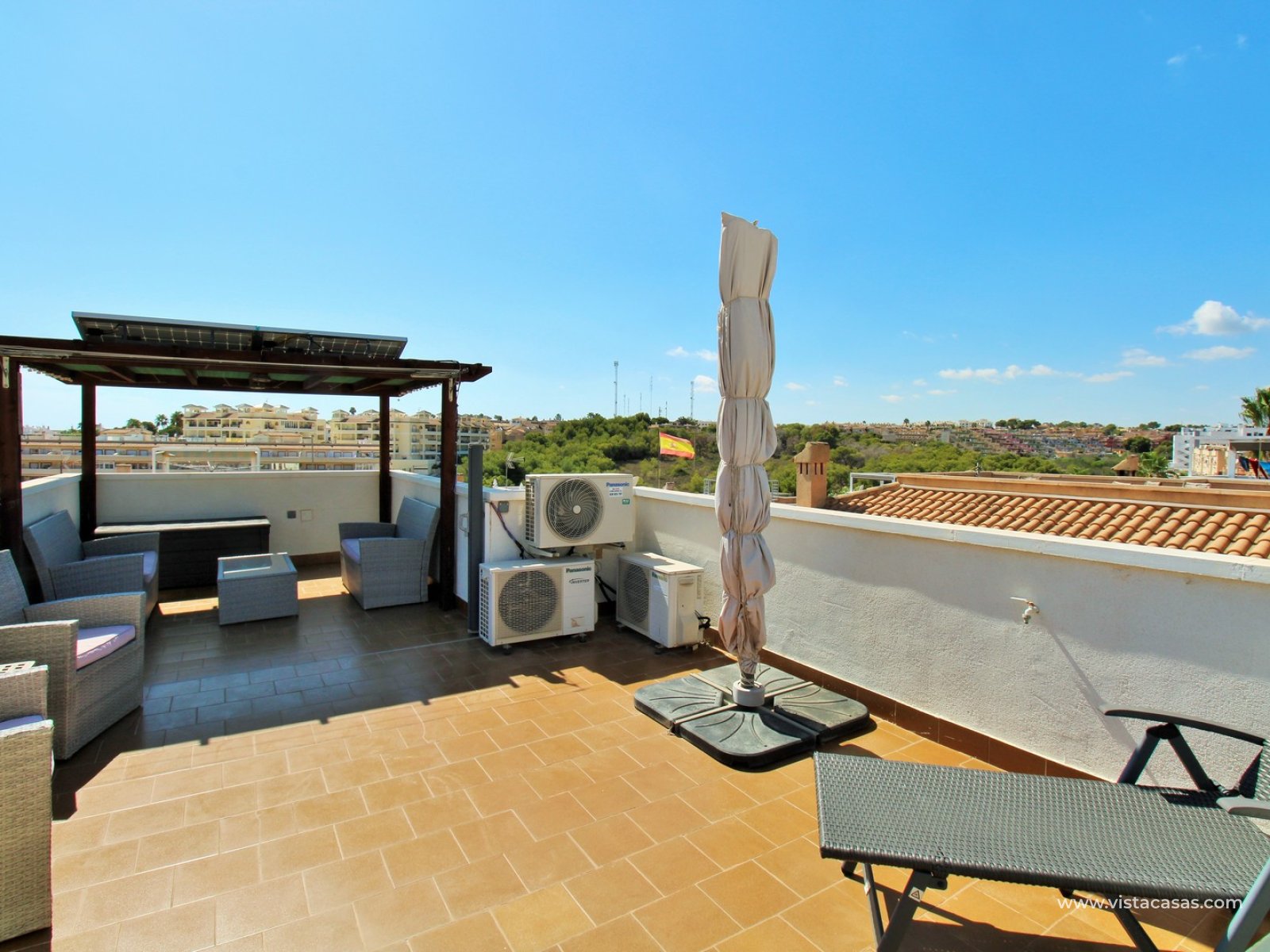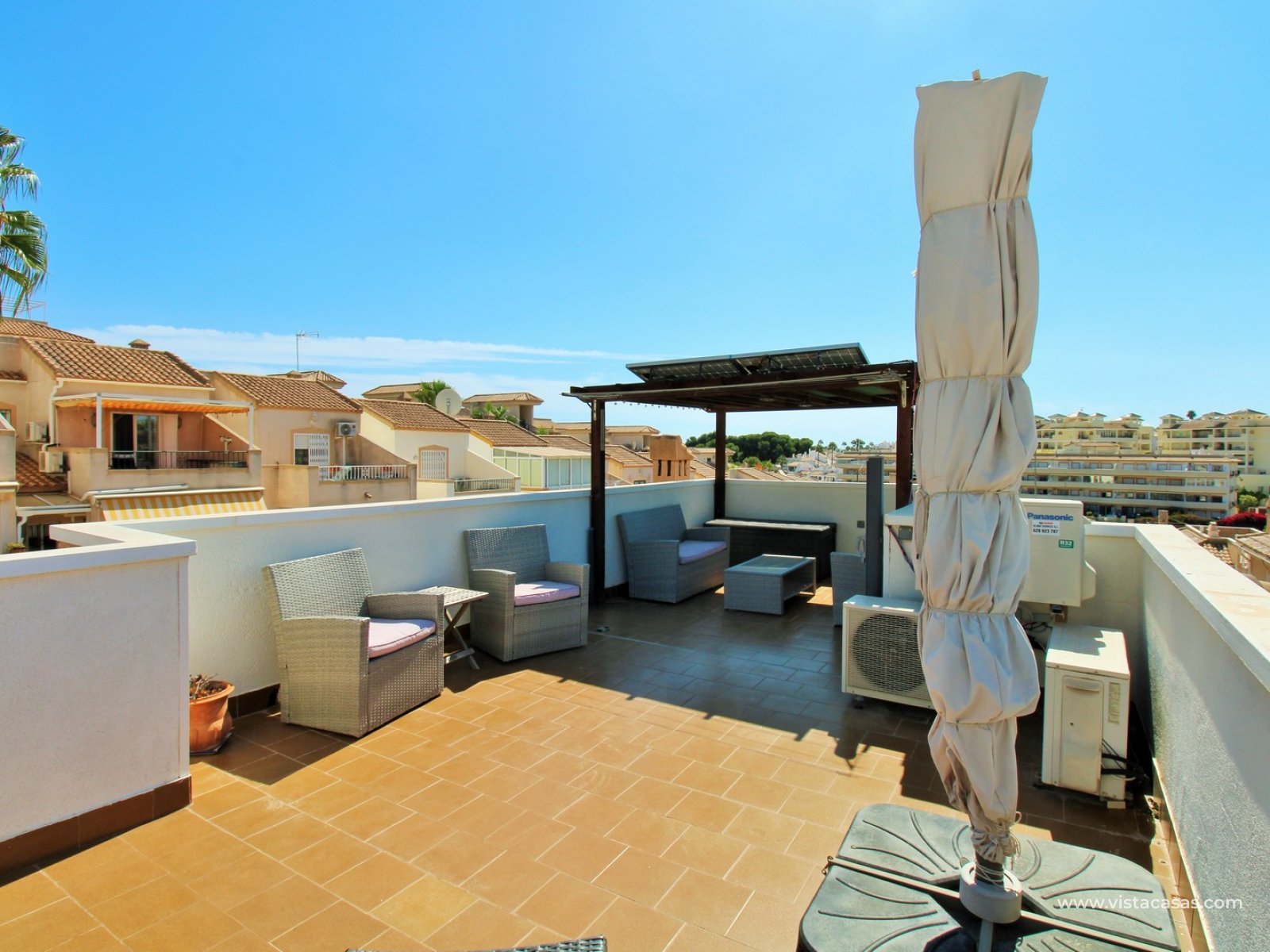 The main floor is bright and welcoming, with a comfortable lounge and dining area leading to a fully fitted kitchen, two double bedrooms, and two modern bathrooms. From the lounge you step out onto a private roof terrace complete with pergola, the ideal place to enjoy warm Mediterranean evenings. A glazed balcony, doubling as a conservatory, adds to the living space and provides a pleasant spot to relax with a book or morning coffee throughout the year.