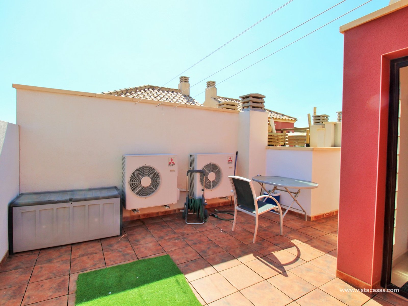 The ground floor comprises an entrance hallway, a spacious lounge with access to a covered balcony overlooking the pool, a separate fitted kitchen with utility room, and a guest toilet. Upstairs are two bedrooms that share a generous family bathroom with both bath and shower. The master bedroom benefits from its own private terrace with open views of the gardens. Internal stairs lead to a large private roof solarium with a built-in BBQ area – perfect for outdoor entertaining.