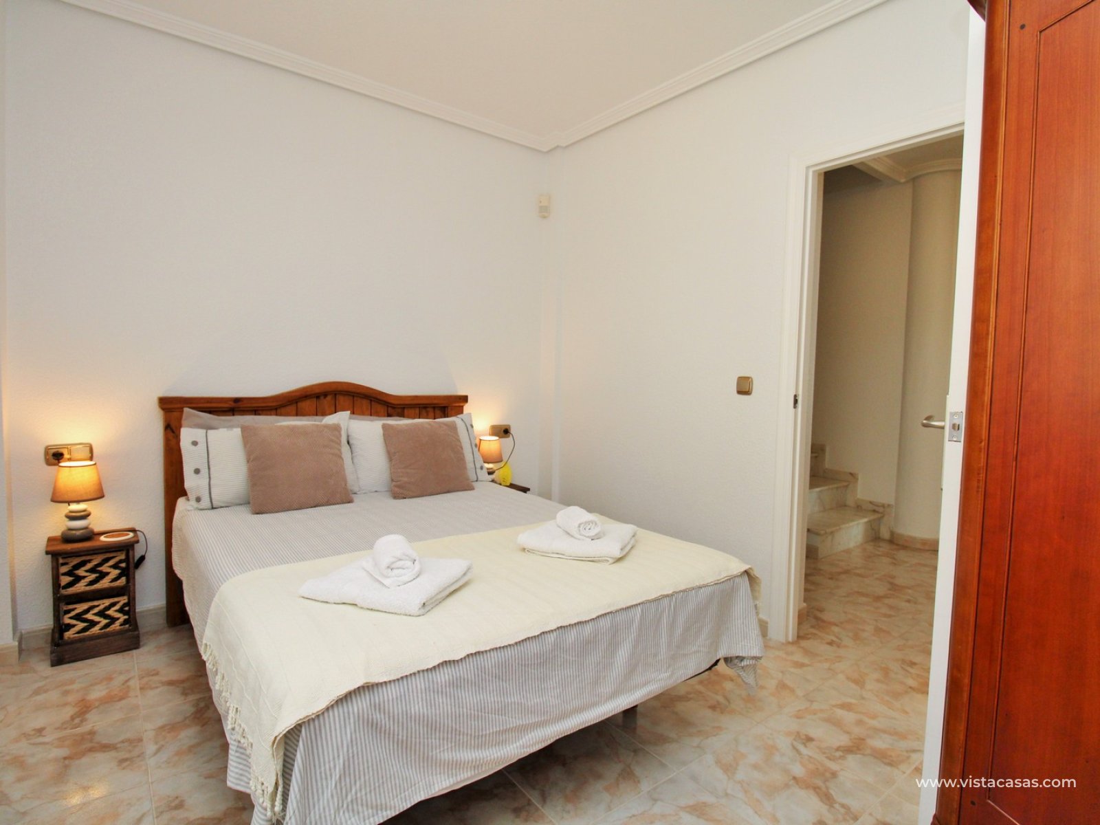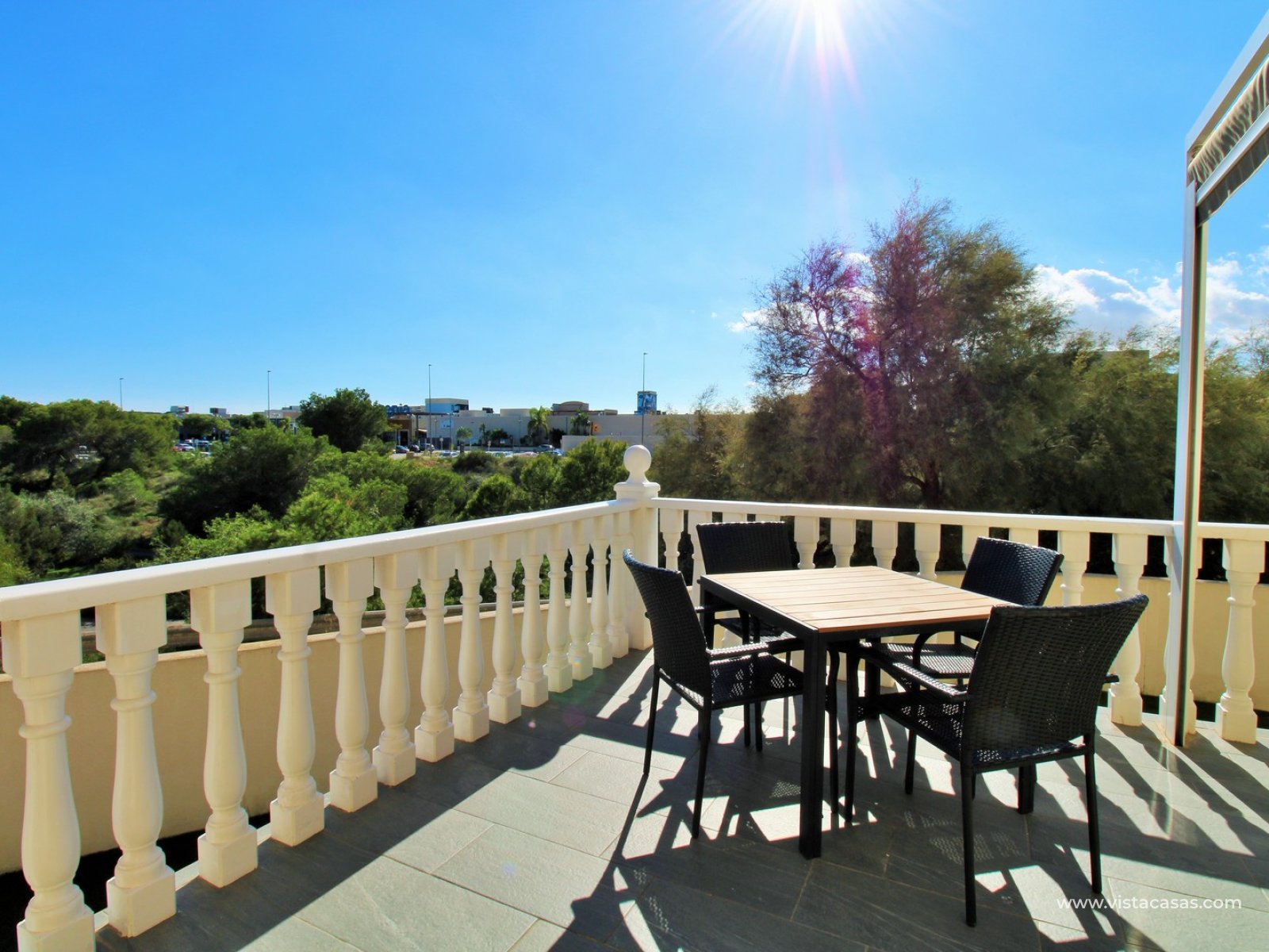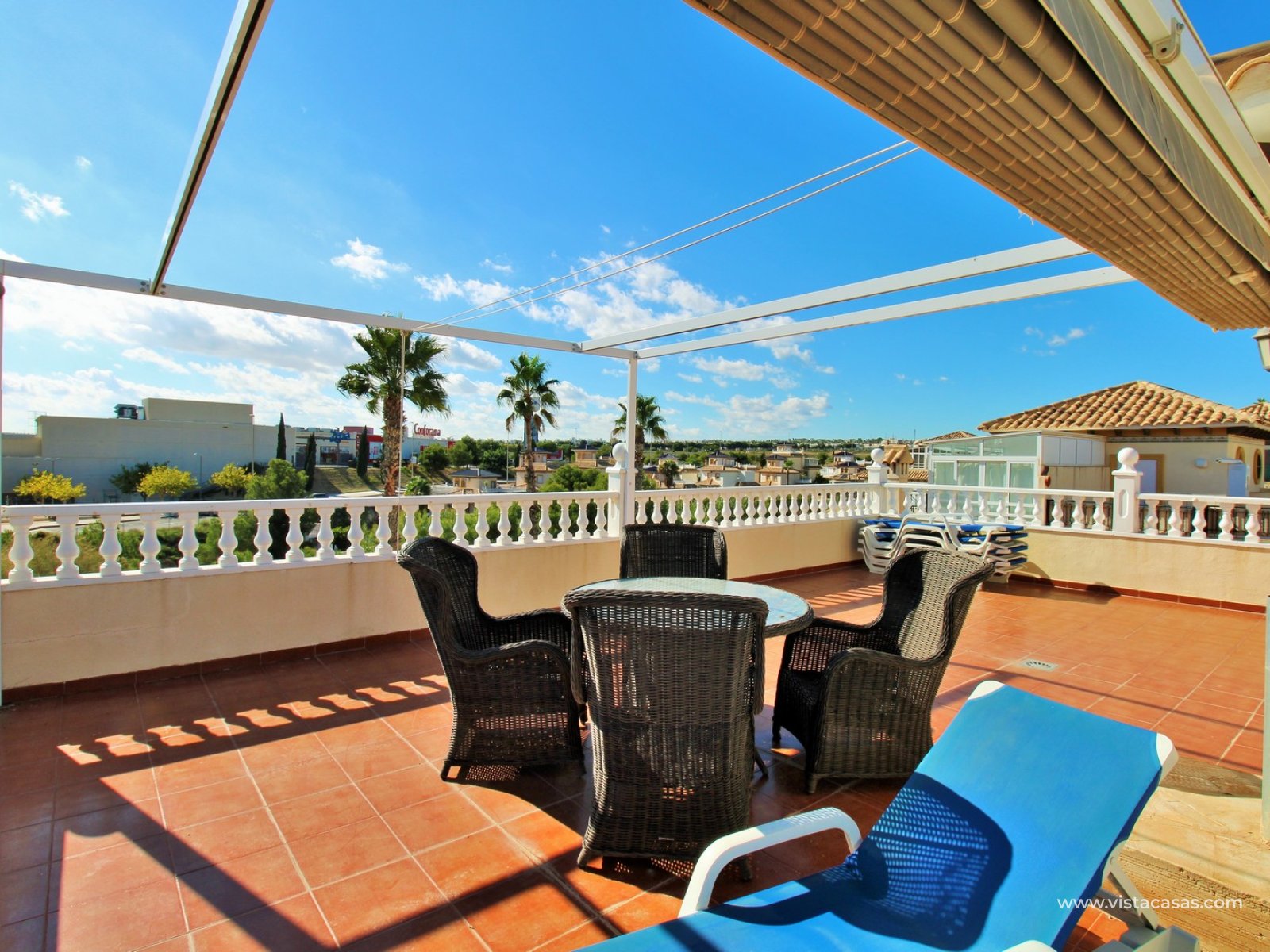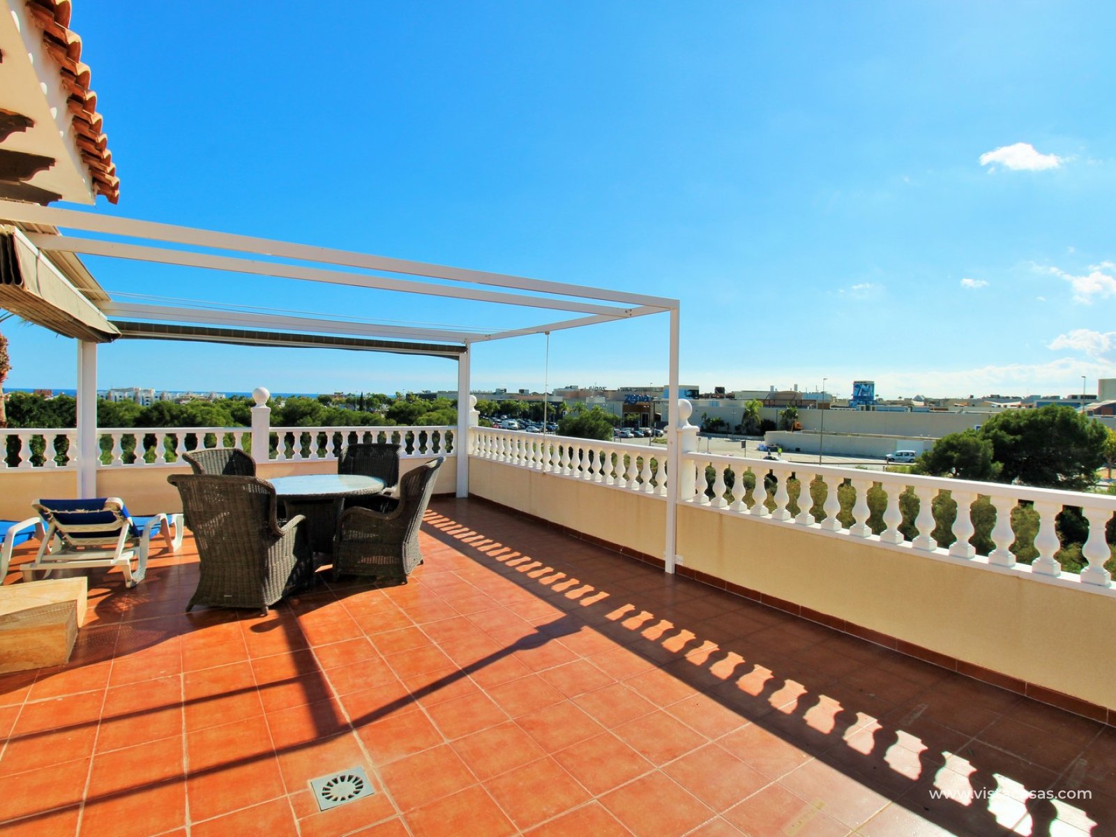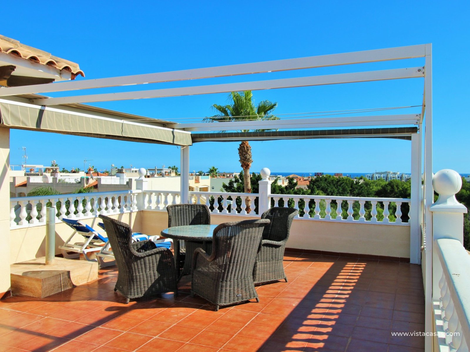 Inside, the ground floor features a bright and airy living and dining area, a large independent kitchen with access to the terrace, plus a double bedroom and a bathroom with walk-in shower. Upstairs, there are three double bedrooms with fitted wardrobes and a family bathroom. The master bedroom benefits from an en-suite bathroom and access to a private balcony with pool views. Internal stairs lead up to the generous roof solarium, complete with a retractable awning and lovely open views of the sea and surrounding area.