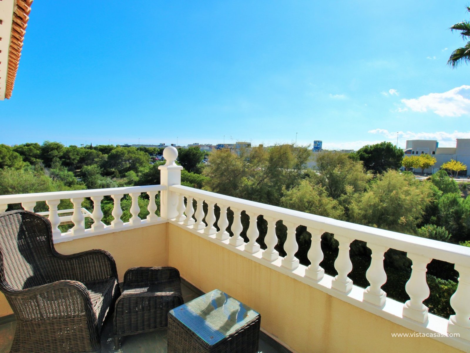The villa offers an impressive amount of outdoor space, including a tiled garden, driveway, raised front terrace, balcony overlooking the pool, and a large private roof solarium with sea and pool views — ideal for relaxing or entertaining.