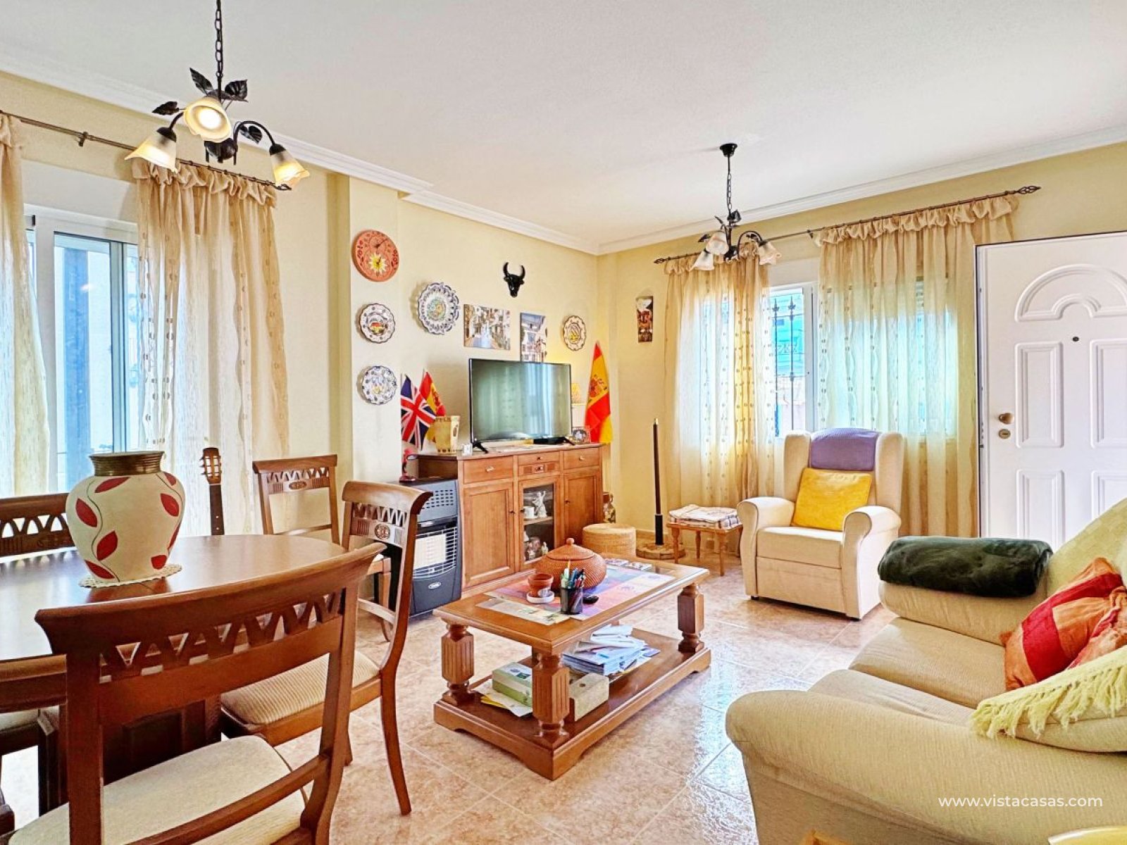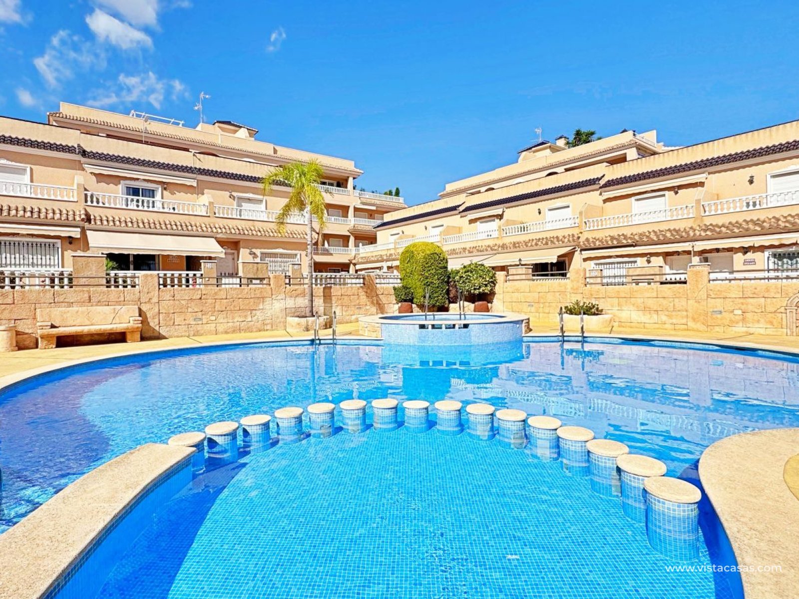 Beautiful corner quad-style duplex located in the exclusive Vista Azul Residential, one of the most desirable developments in Villamartin, Orihuela Costa. This home perfectly combines Mediterranean style, comfort and an excellent location within a quiet, family-friendly environment close to all essential amenities. With 90 m² of built area on a 120 m² plot, the property enjoys a southwest orientation, providing plenty of natural light all day long. The ground floor offers a bright living-dining room with direct access to the terrace, a fully equipped independent kitchen, one bedroom ideal for guests or a home office, and a complete bathroom. The upper floor features two bedrooms with fitted wardrobes, a second bathroom, and access to a 20 m² private solarium, perfect for sunbathing, relaxing or enjoying open views. The property is in excellent condition and equipped with air conditioning, awnings, security door and private parking inside the plot. The spacious terrace surrounding the house provides several outdoor dining and chill-out areas, ideal to enjoy the Mediterranean climate all year round. The Vista Azul complex offers exceptional communal facilities including two swimming pools (one covered), jacuzzi, sauna and gym, making it one of the most complete and sought-after communities in Villamartin. Located next to Villamartin Golf Course, close to La Zenia Boulevard and Playa Flamenca, and only 3 km from the beaches of Orihuela Costa, this home is perfect for those looking to buy a duplex in Villamartin or invest in a property for sale on the Costa Blanca. A charming property, ready to move into — ideal as a permanent home, a holiday residence or a real estate investment in Orihuela Costa.