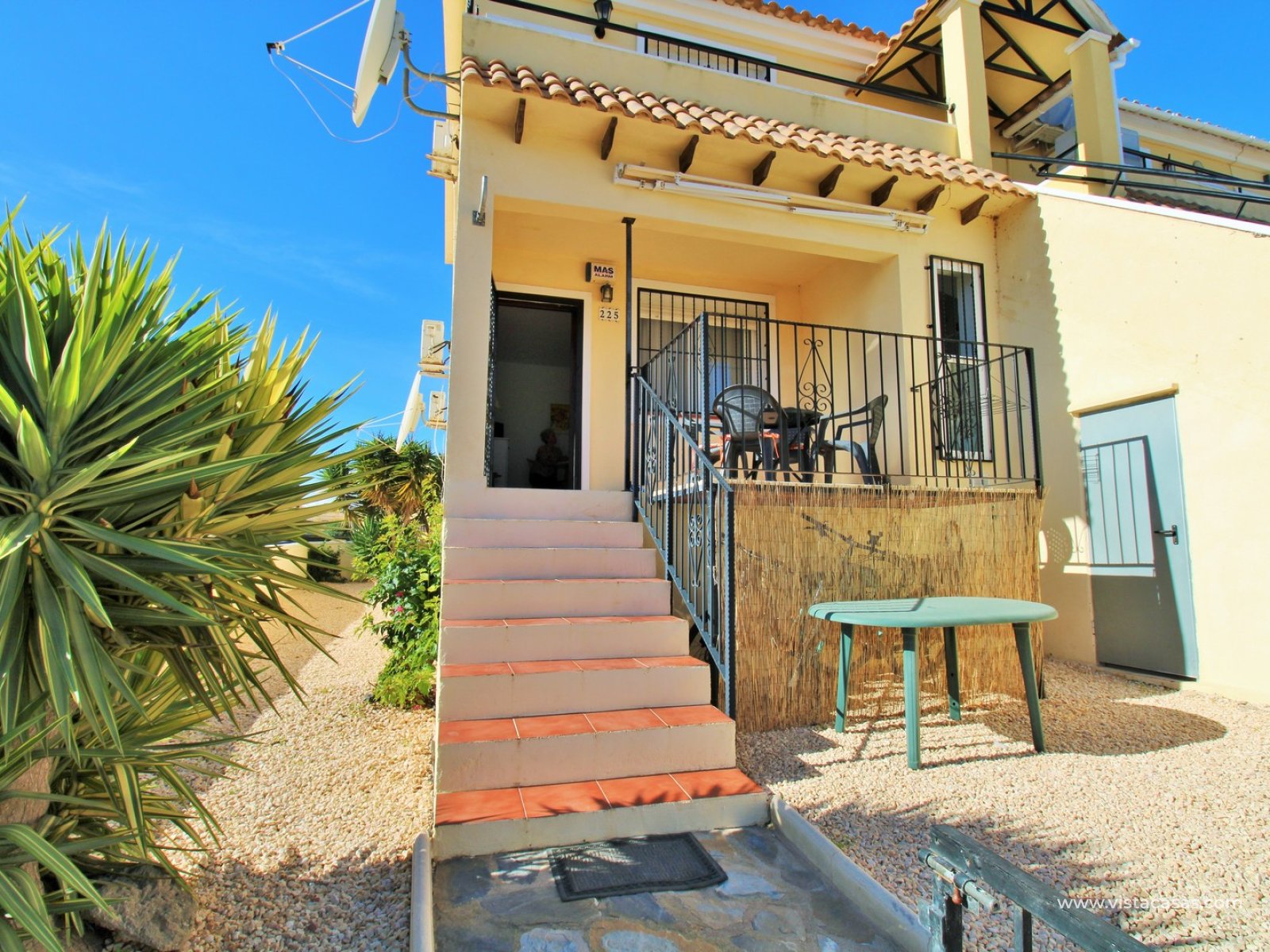 The property features a raised front terrace overlooking one of the pools, perfect for relaxing or dining outdoors. Inside, you are welcomed into a bright living and dining area, a separate fitted kitchen with utility room, 2 double bedrooms, and a modernised bathroom with a walk-in shower. The master bedroom provides direct access to the sunny corner garden, offering plenty of outdoor space to enjoy the Mediterranean weather. The apartment is sold furnished and includes air-conditioning, making it ready to move straight into.