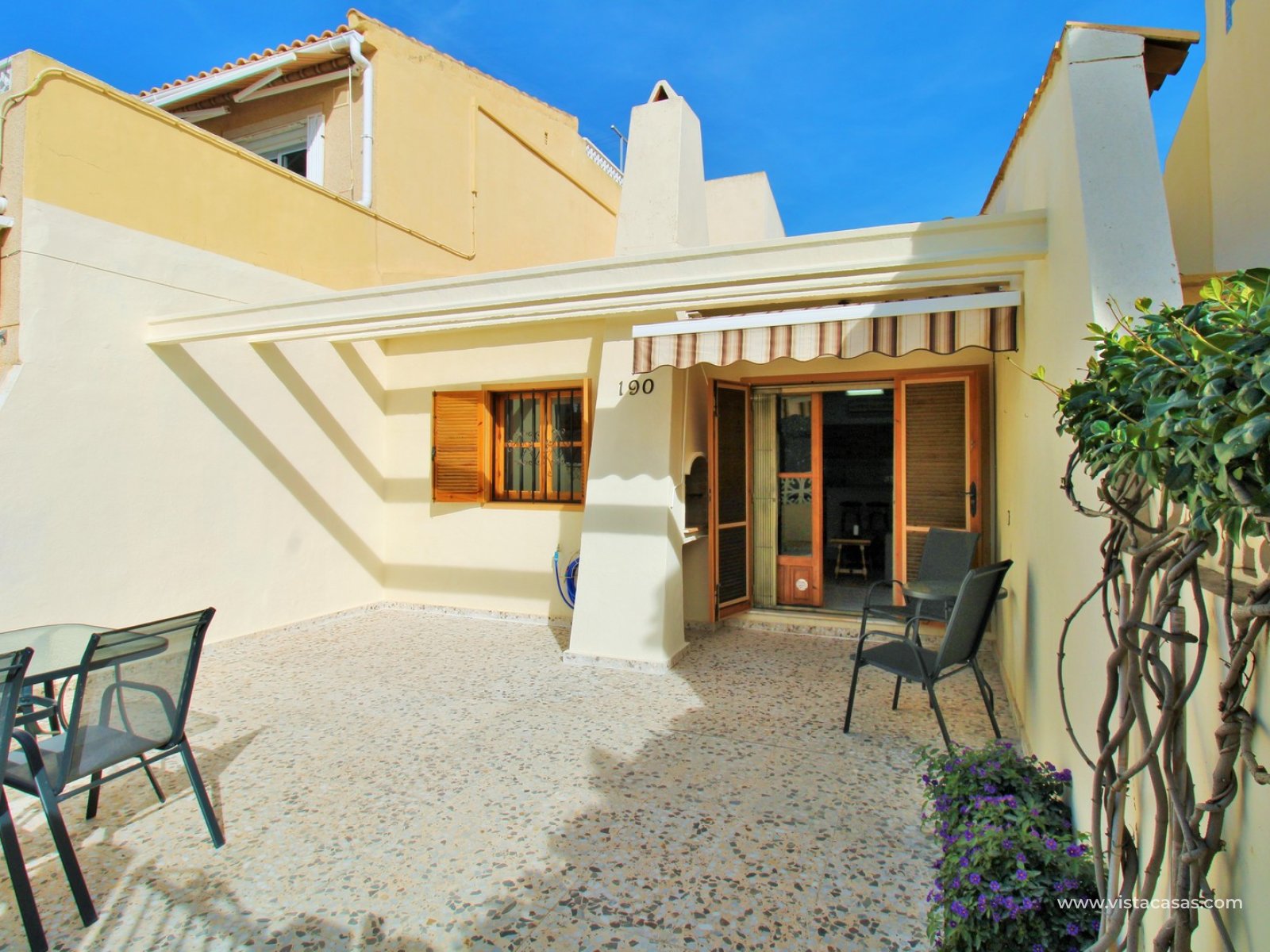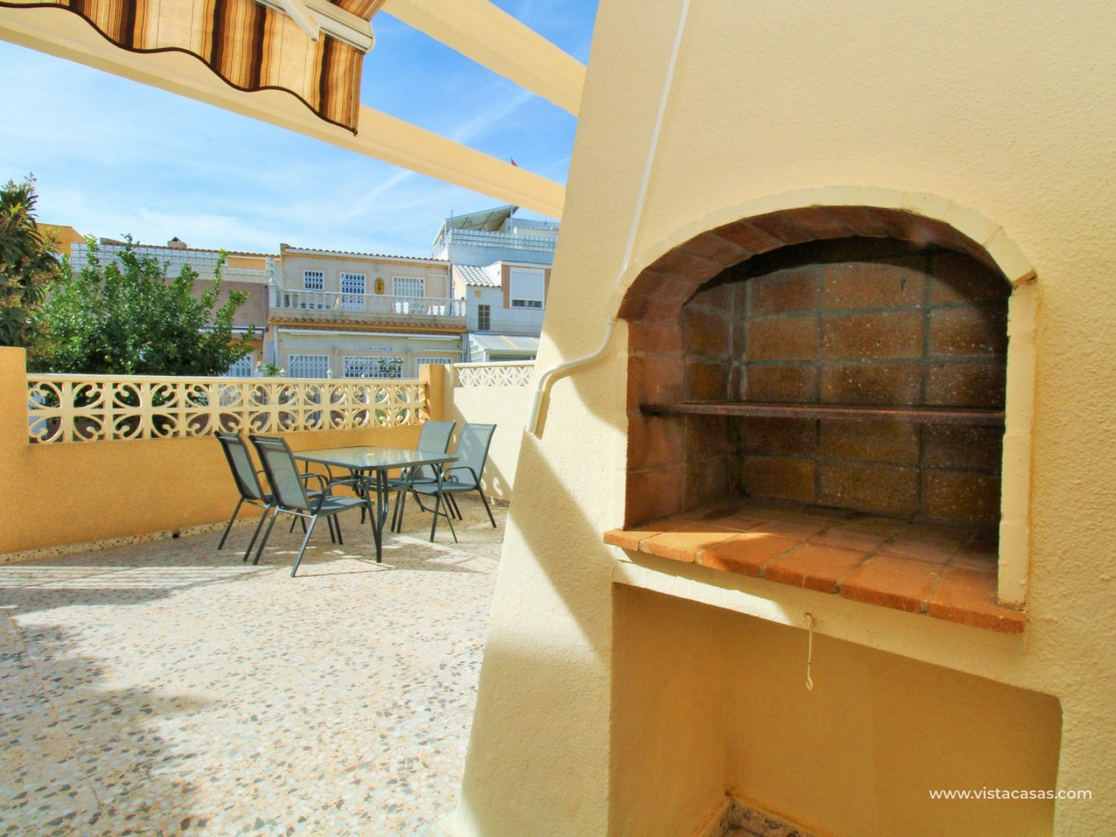 Vistacasas presents this exceptional end-of-terrace bungalow offering superb value in the gated community of Manzana 7, La Chismosa (Playa Flamenca). Enjoying a desirable south-west orientation, the home benefits from sunshine throughout the day and features a generous front terrace complete with built-in BBQ and retractable awnings—perfect for relaxing or entertaining. Residents also have access to beautifully maintained communal green areas.