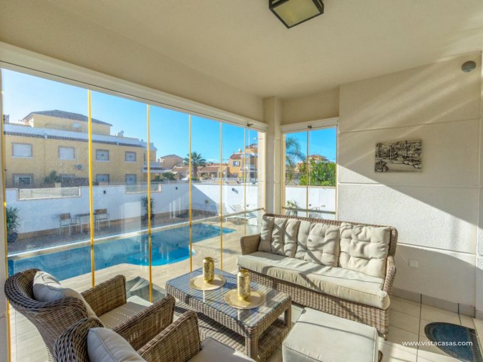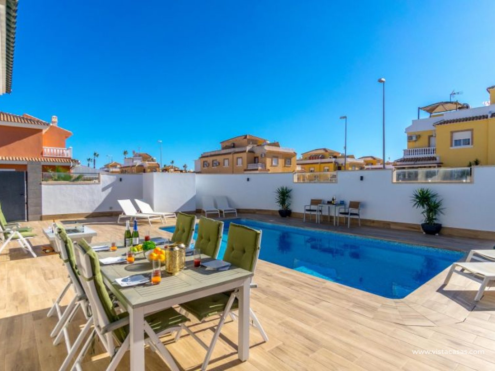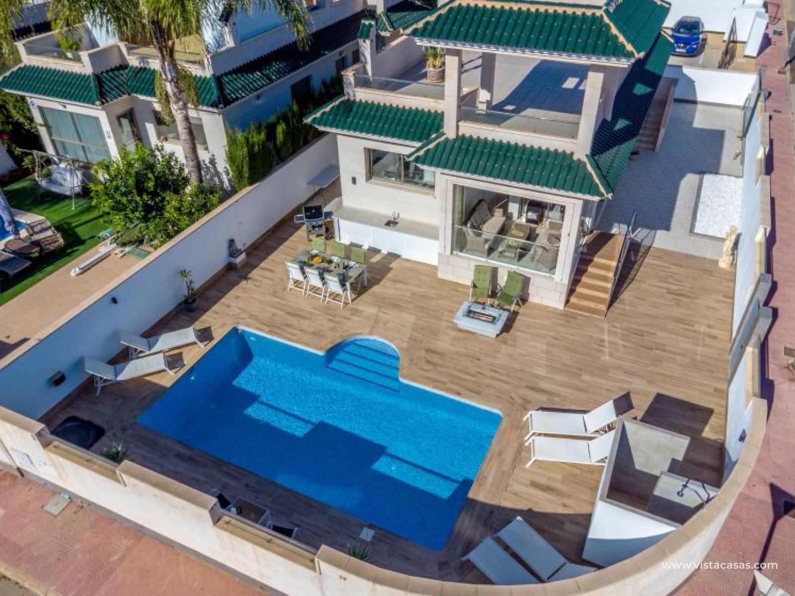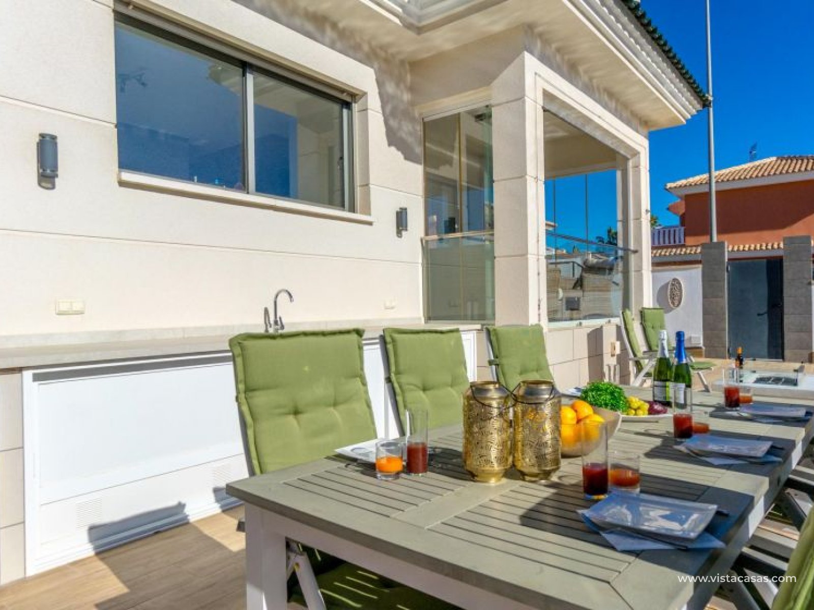 Discover this stunning detached villa in Ciudad Quesada- Lo Marabú — a home that perfectly blends Mediterranean charm with modern contemporary design. Set on a 420 m² plot with 104 m² of built area all on one level, this property offers a bright, comfortable lifestyle ideal for year-round living or holidays. Located in a privileged area surrounded by all amenities — supermarkets, pharmacy, restaurants, bars and more — this villa is perfect as a permanent residence or holiday home. Ciudad Quesada is known for its warm, international and vibrant atmosphere, offering an excellent quality of life. The property is located just steps away from La Marquesa Golf Course, an ideal setting for golf enthusiasts to enjoy relaxed rounds surrounded by nature. It is also only a short drive from the beautiful beaches of Guardamar and La Mata, known for their wide stretches of fine sand, clear waters, and a perfect atmosphere for relaxation or outdoor activities. The plot is fully tiled, offering various relaxing spaces. The summer kitchen is perfect for outdoor dining with family or friends, and the highlight of the exterior is its private swimming pool, a true delight during warm summer days. The property also features on-plot parking, a pergola, an automatic gate, and a storage room. From the garden, an external staircase leads to a spectacular 100 m² rooftop solarium, fully equipped with another summer kitchen and barbecue — an ideal setting for long evenings outdoors. Inside, a cozy glazed terrace with folding glass panels opens into a spacious living-dining area with a fully equipped open-plan kitchen. Everything is conveniently located on one floor: three bedrooms, including one with an en-suite bathroom, plus an additional guest bathroom. The property is sold fully furnished and in impeccable condition, ready to move into. Its south-facing orientation ensures natural light all day long. Just minutes from the beautiful beaches of Guardamar and close to the centre of Ciudad Quesada, this home offers space, elegance, modernity and comfort. Come and experience it for yourself — book your viewing today!