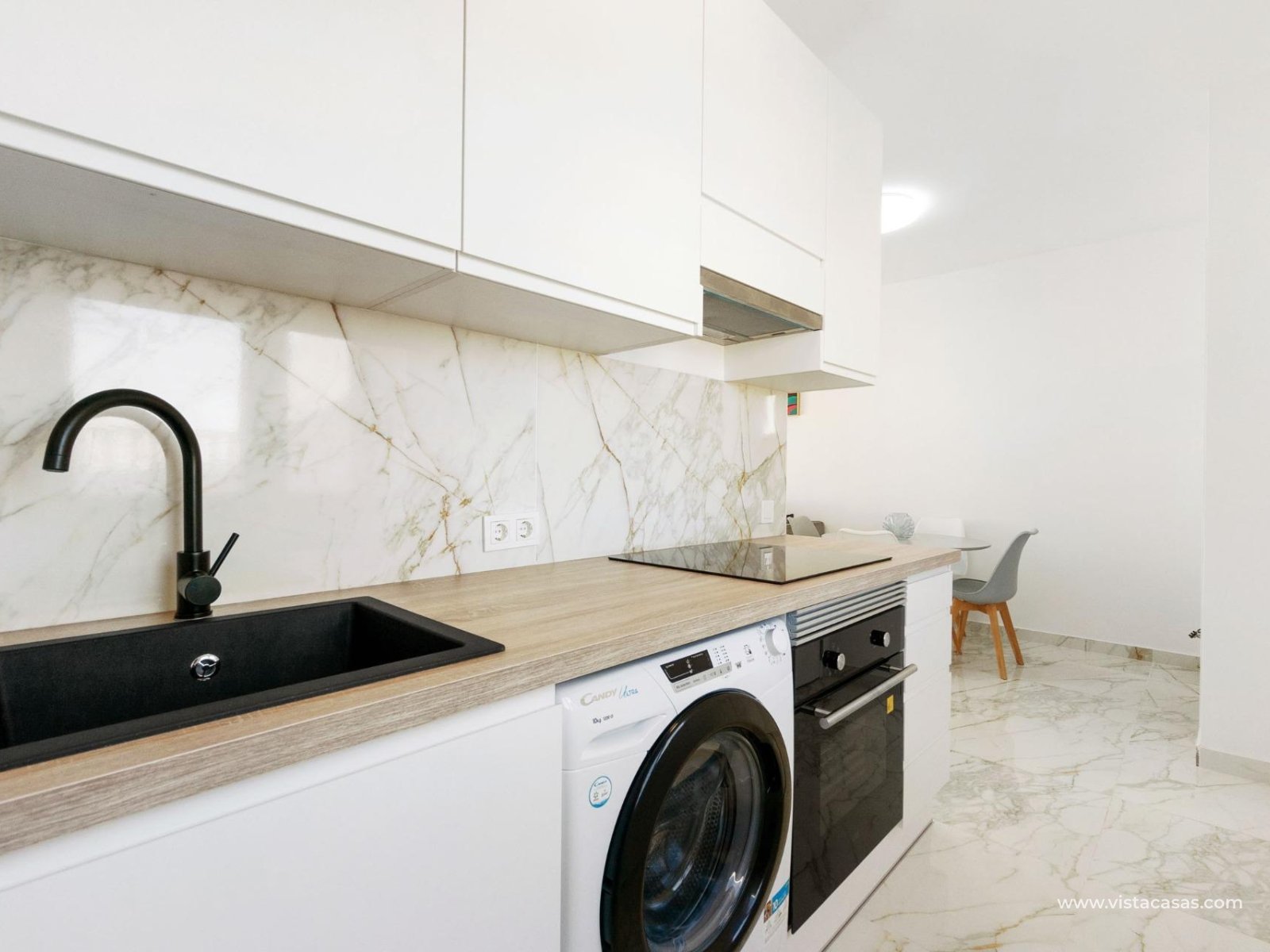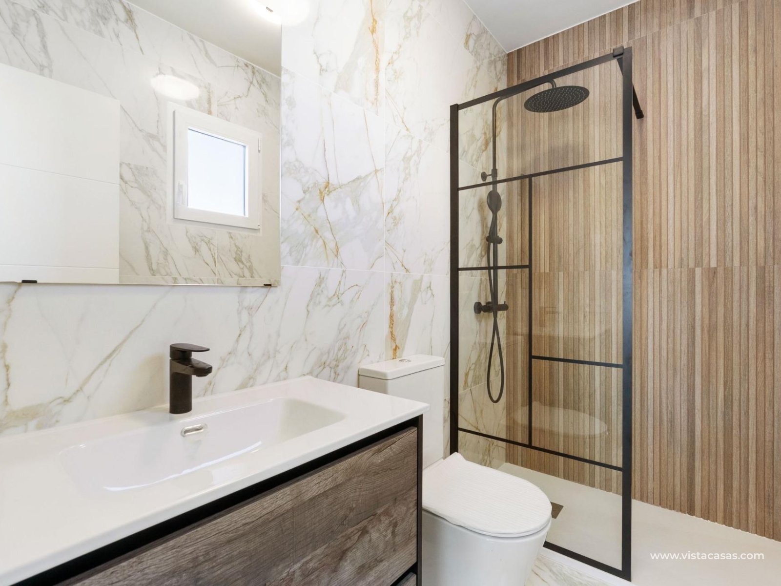 Newly renovated semi-detached villa in El Chaparra, located within a short drive of shops, bars, restaurants, supermarkets and the city of Torrevieja. It is separated into two houses with independent access. On the ground floor we have a house of 54m2 of area, consisting of 2 bedrooms, a bathroom, living-dining room, open-plan kitchen. On the first floor an apartment with its independent entrance, of about 35m2, consisting of 1 double bedroom, living room, has its own kitchen and bathroom; with a large terrace with views of the surroundings. The comprehensive reform was recently carried out with quality materials and modern interior design. Underfloor heating in the bathrooms. Sold with brand new furniture and appliances. Parking space for the car on the plot.This villa offers a harmonious combination of comfort and style.