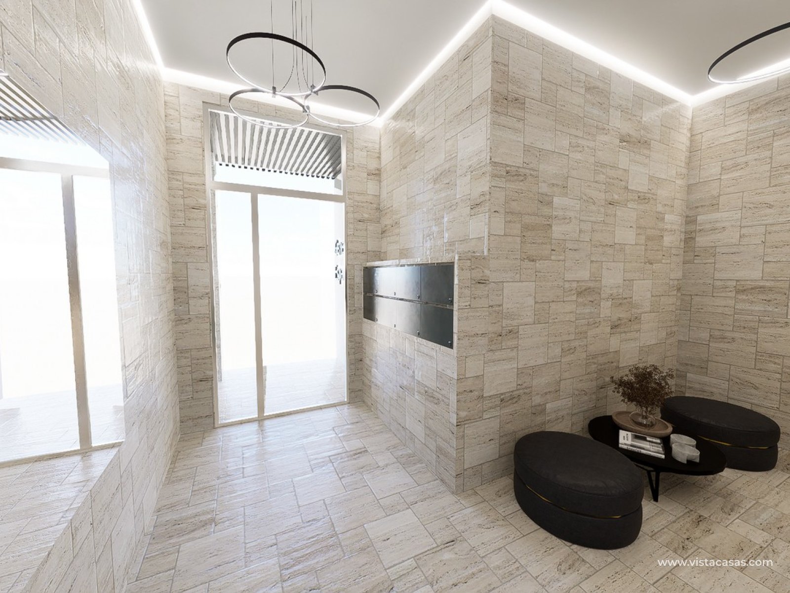 The interior of each home is designed to maximize comfort and functionality. The apartments, ground floors, and penthouses are available in configurations of one or two bedrooms and one or two bathrooms, adapting to different family needs. Ceramic floors add an elegant touch and are easy to maintain. The homes are equipped with modern appliances and built-in wardrobes that optimize storage space. Additionally, the video intercom adds an extra level of security and convenience.