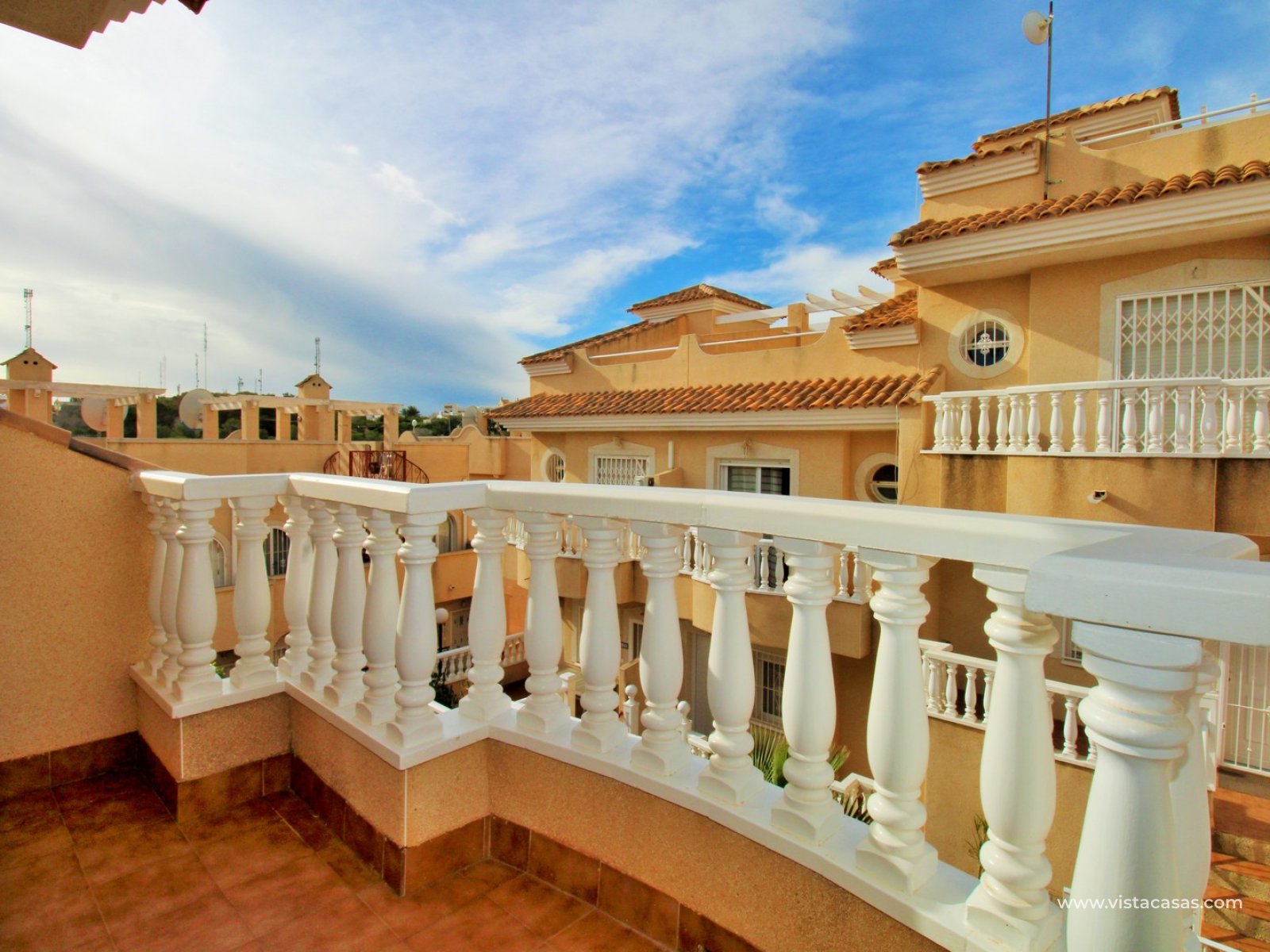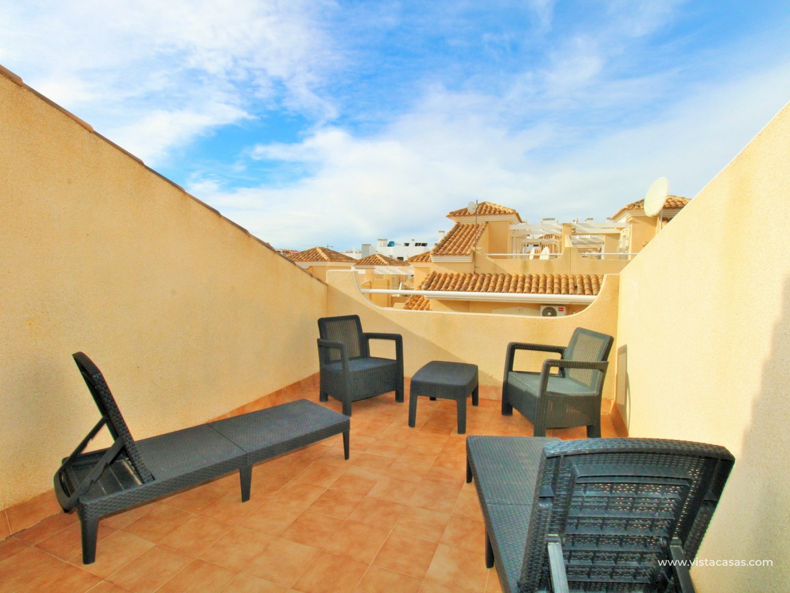 The roof solarium offers a generous outdoor space with sun throughout the day and includes a shower area, making it perfect for relaxing and enjoying the Mediterranean climate.