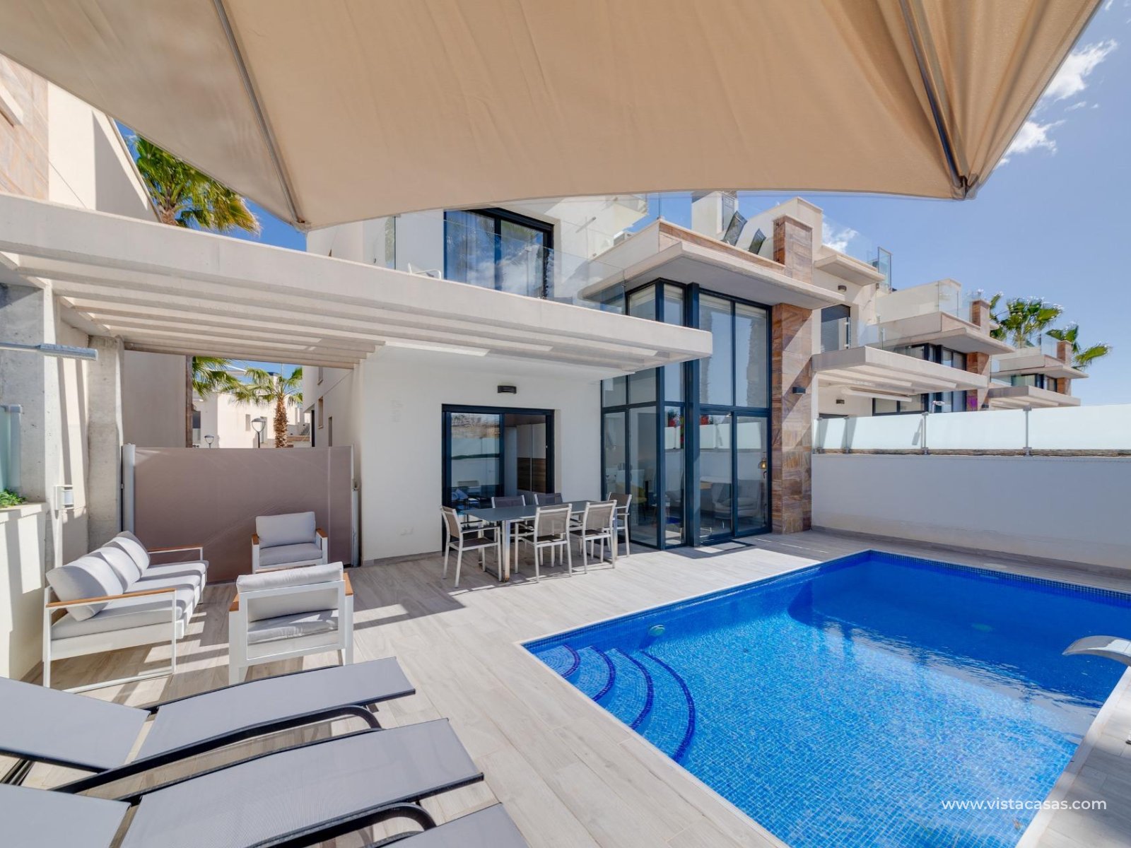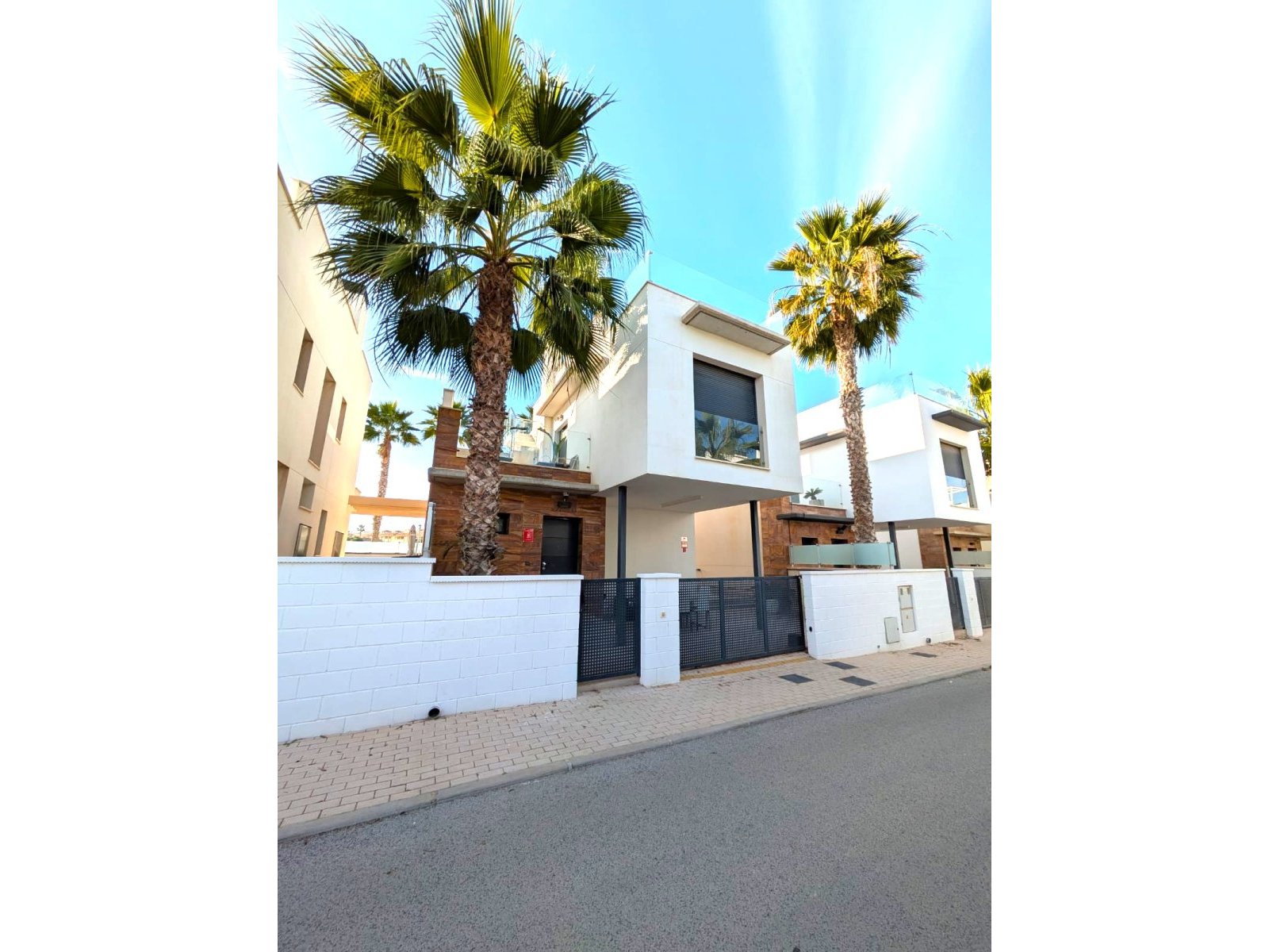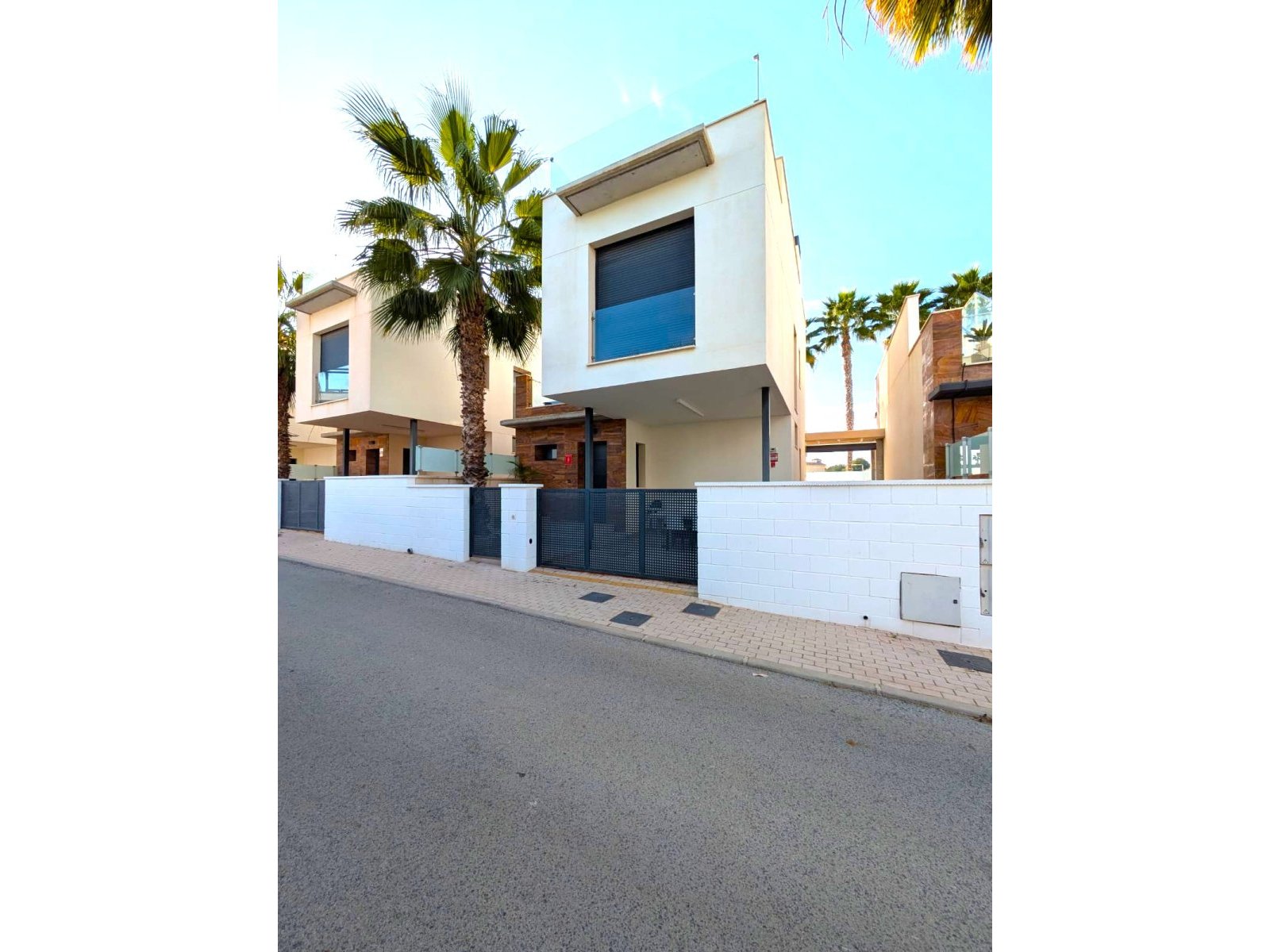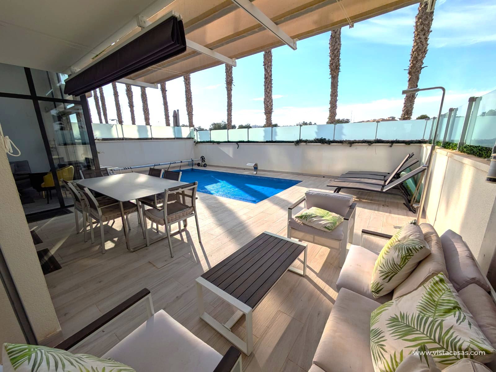 Discover this exclusive ultra-modern detached house, perfectly positioned to capture the sun's warmth with its southwest-facing orientation. This stunning property boasts three spacious bedrooms and two stylish bathrooms, making it ideal for families or those seeking extra space. The living and dining area features high ceilings and tall windows that flood the space with natural light, creating a warm and inviting atmosphere. The modern open kitchen is a chef's dream, equipped with top-of-the-line appliances and ample storage. A separate utility room adds convenience to daily chores. Step outside to enjoy the low-maintenance garden area, complete with a private pool for those hot summer days. Multiple terraces offer the perfect spots for relaxation or entertaining guests, while the large solarium provides breath taking open views. This home comes fully furnished and includes centralized air conditioning for year-round comfort. Electric blinds add an extra touch of luxury, off-road parking ensures convenience and a gated community offers that extra security. With 110 m² of constructed space, fitted wardrobes, and a storage room, this property is in excellent condition and ready to move in. Don't miss out on this unique opportunity to own a piece of paradise!