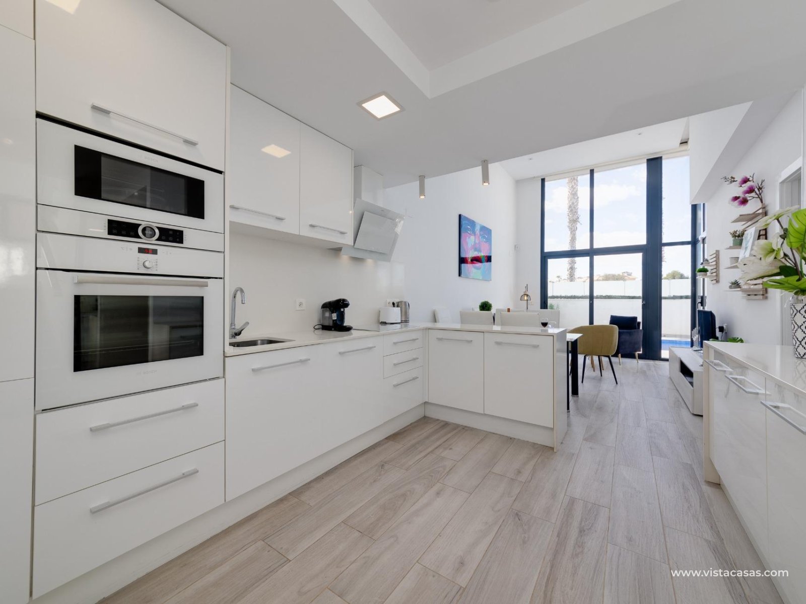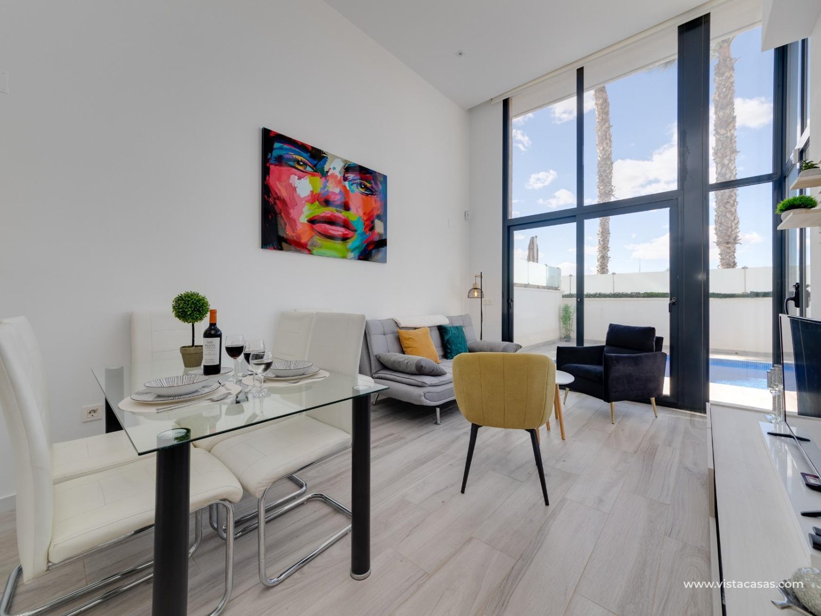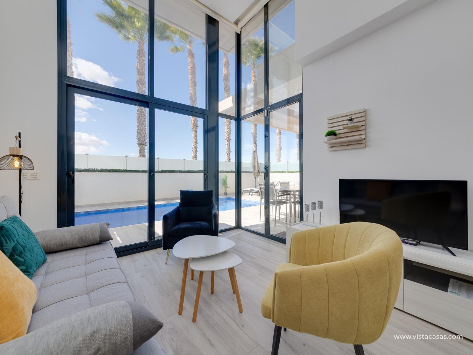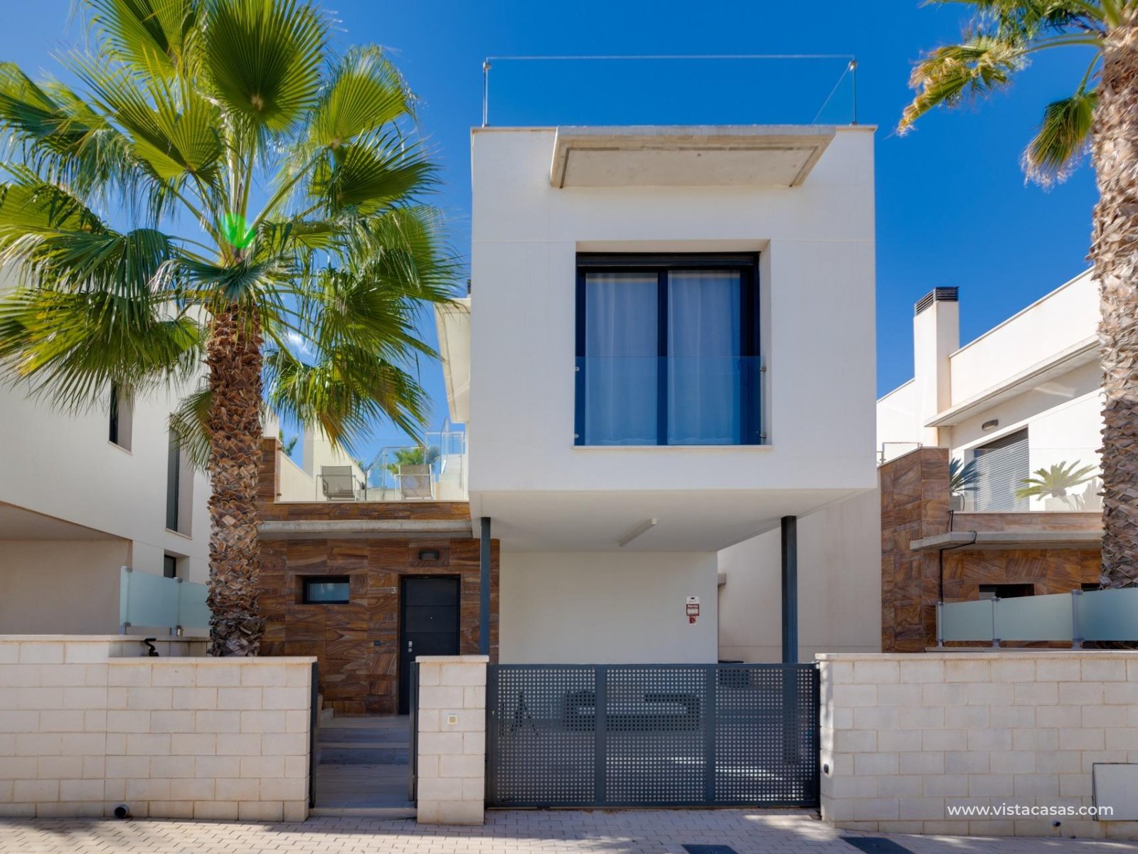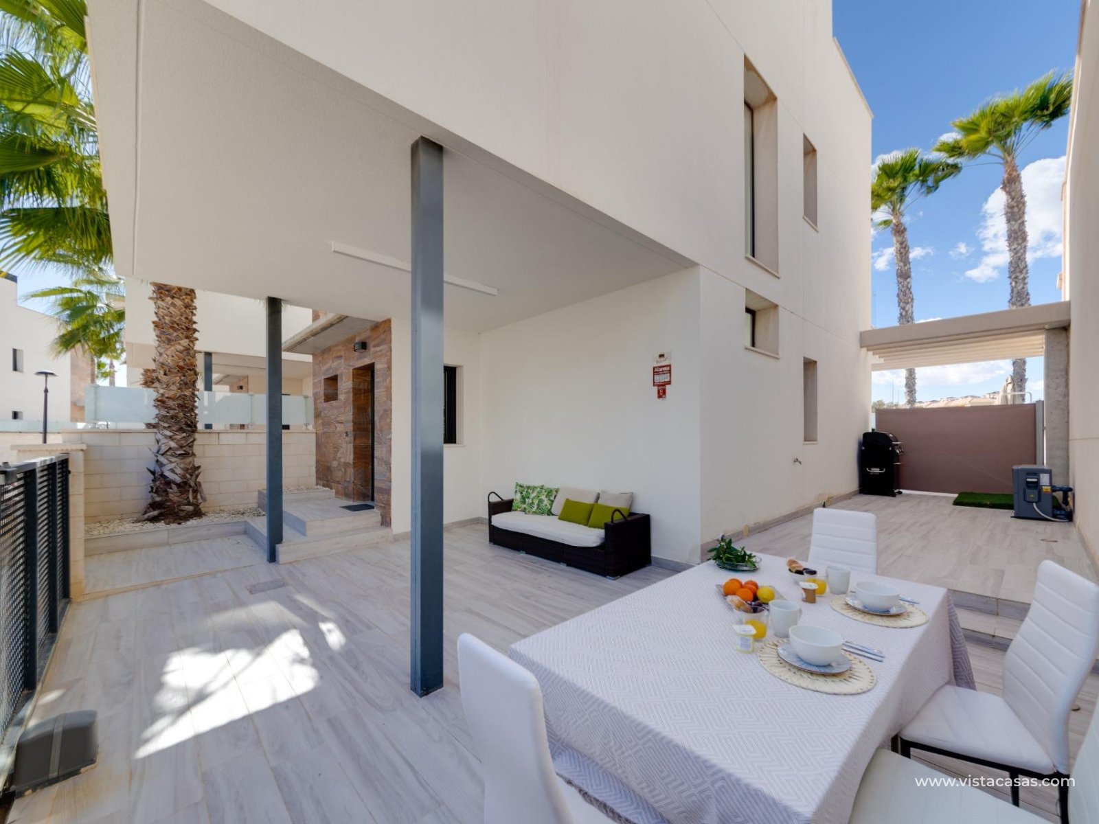 Discover this exclusive ultra-modern detached house, perfectly positioned to capture the sun's warmth with its southwest-facing orientation. This stunning property boasts three spacious bedrooms and two stylish bathrooms, making it ideal for families or those seeking extra space. The living and dining area features high ceilings and tall windows that flood the space with natural light, creating a warm and inviting atmosphere. The modern open kitchen is a chef's dream, equipped with top-of-the-line appliances and ample storage. A separate utility room adds convenience to daily chores. Step outside to enjoy the low-maintenance garden area, complete with a private pool for those hot summer days. Multiple terraces offer the perfect spots for relaxation or entertaining guests, while the large solarium provides breath taking open views. This home comes fully furnished and includes centralized air conditioning for year-round comfort. Electric blinds add an extra touch of luxury, off-road parking ensures convenience and a gated community offers that extra security. With 110 m² of constructed space, fitted wardrobes, and a storage room, this property is in excellent condition and ready to move in. Don't miss out on this unique opportunity to own a piece of paradise!