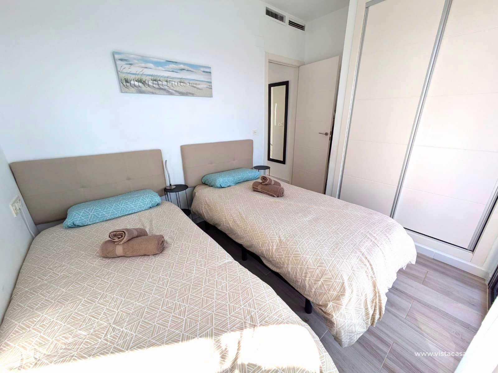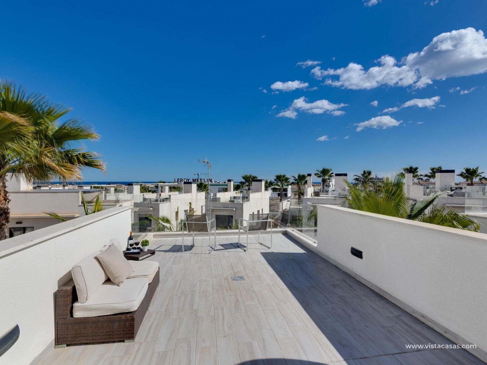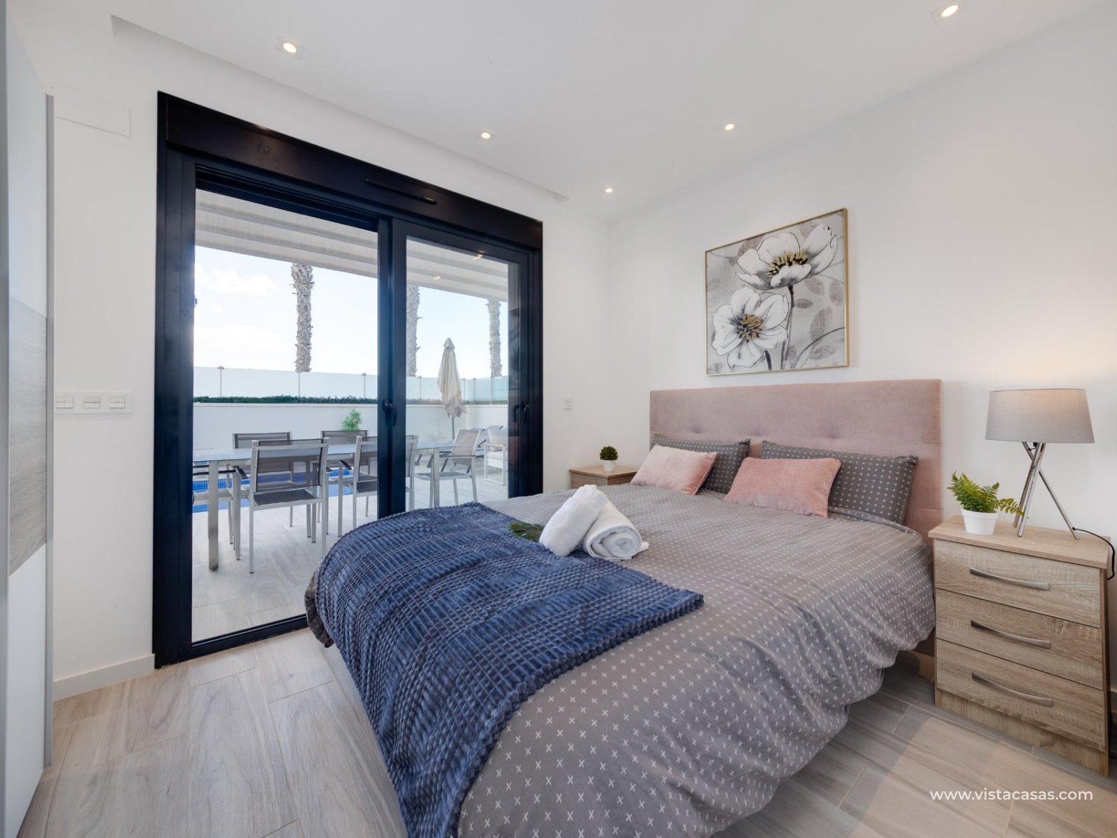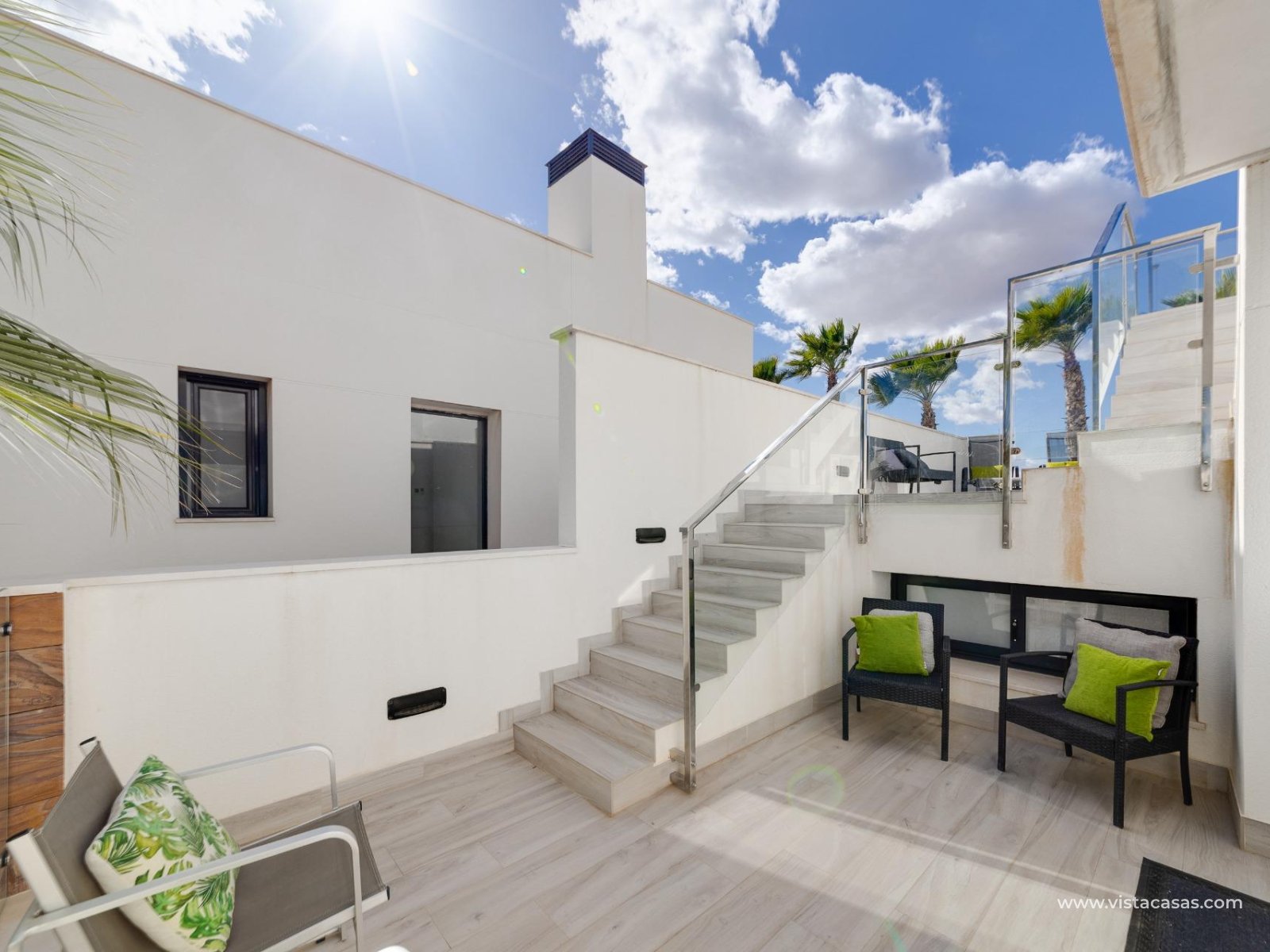 Discover this exclusive ultra-modern detached house, perfectly positioned to capture the sun's warmth with its southwest-facing orientation. This stunning property boasts three spacious bedrooms and two stylish bathrooms, making it ideal for families or those seeking extra space. The living and dining area features high ceilings and tall windows that flood the space with natural light, creating a warm and inviting atmosphere. The modern open kitchen is a chef's dream, equipped with top-of-the-line appliances and ample storage. A separate utility room adds convenience to daily chores. Step outside to enjoy the low-maintenance garden area, complete with a private pool for those hot summer days. Multiple terraces offer the perfect spots for relaxation or entertaining guests, while the large solarium provides breath taking open views. This home comes fully furnished and includes centralized air conditioning for year-round comfort. Electric blinds add an extra touch of luxury, off-road parking ensures convenience and a gated community offers that extra security. With 110 m² of constructed space, fitted wardrobes, and a storage room, this property is in excellent condition and ready to move in. Don't miss out on this unique opportunity to own a piece of paradise!