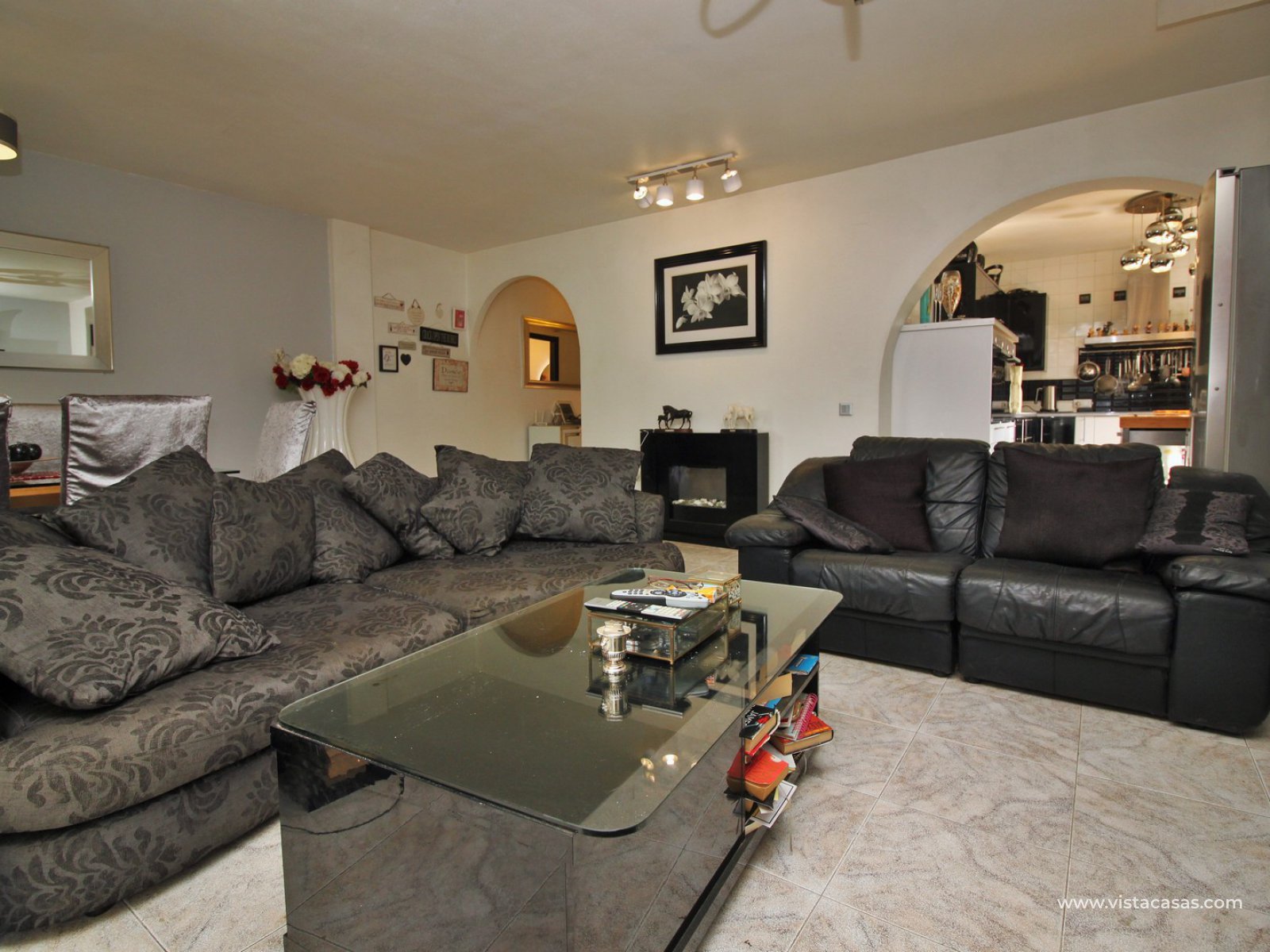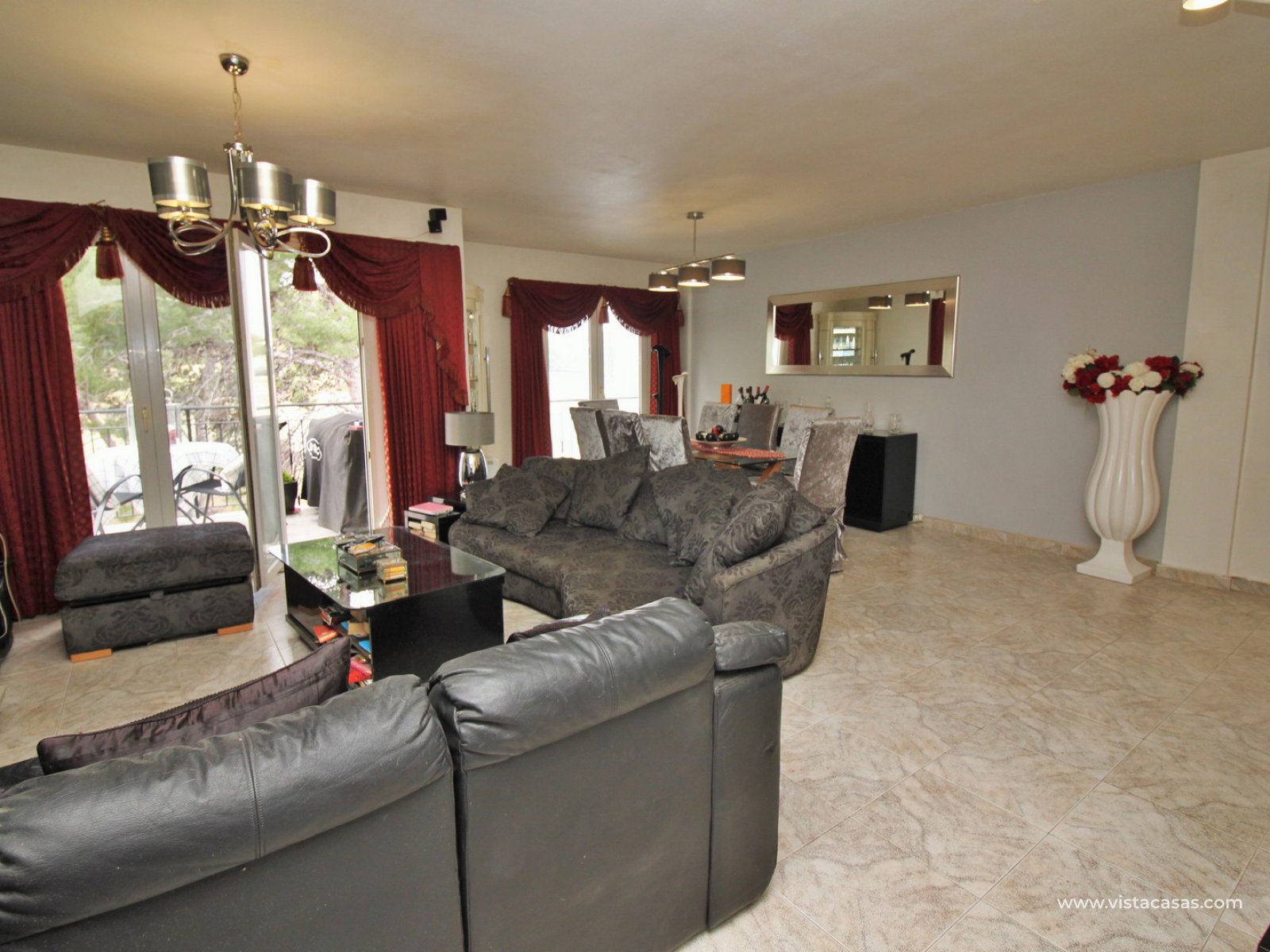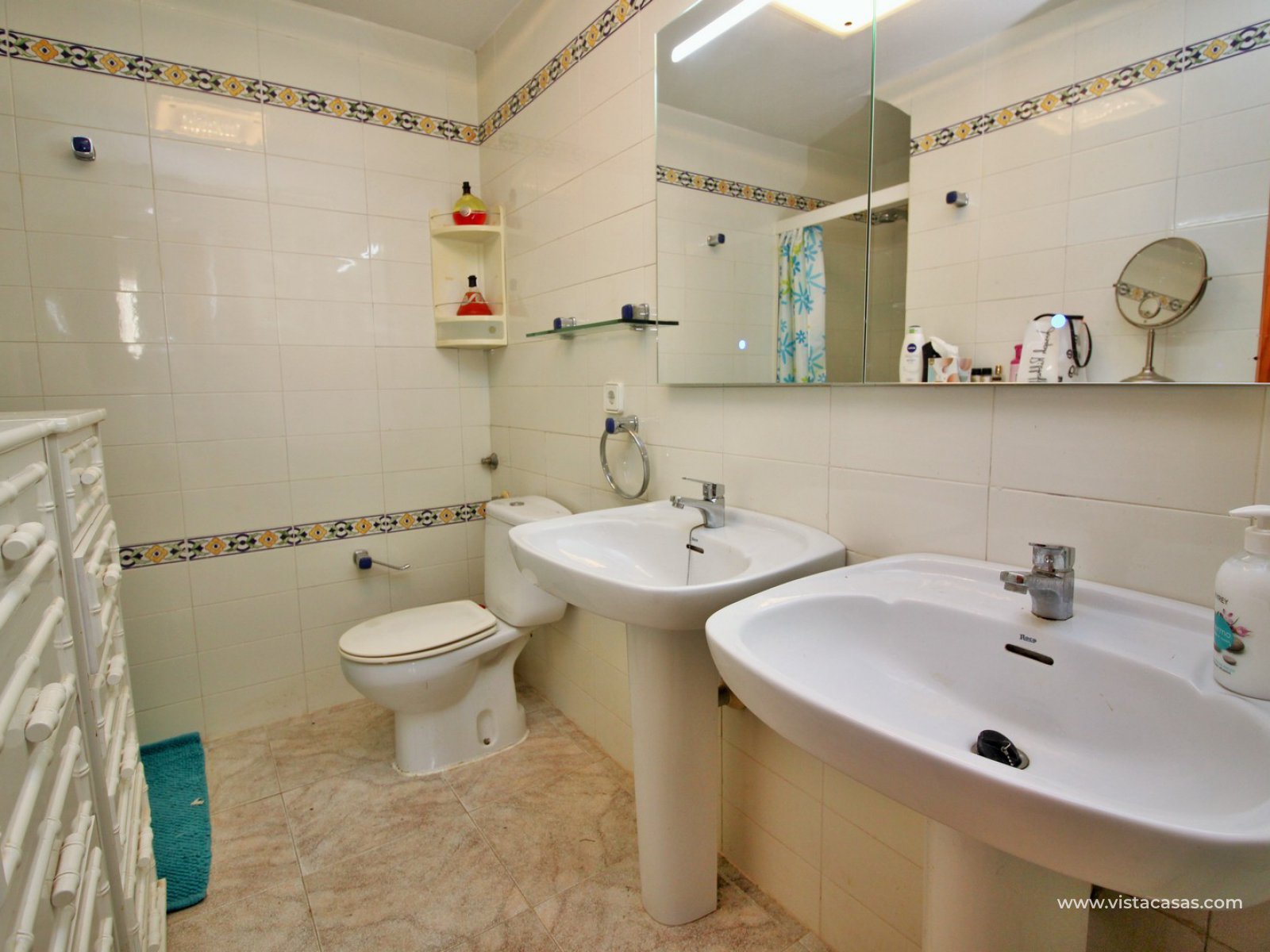The top level comprises of an entrance hallway leading into a very spacious lounge-dining area with a fully equipped kitchen to the side with dual oven and a induction plus conventional electric hob. Patio doors from the lounge area leads onto the covered balcony overlooking the Villamartin golf course. There is also a WC just off the entrance hallway. Internal stairs lead down into the lower level which comprises of the master bedroom with en-suite bathroom and a private South facing balcony. There is a second double bedroom with fitted wardrobes and benefits from its own en-suite shower room. The apartment can be accessed on both levels. Sold partially furnished with white goods.