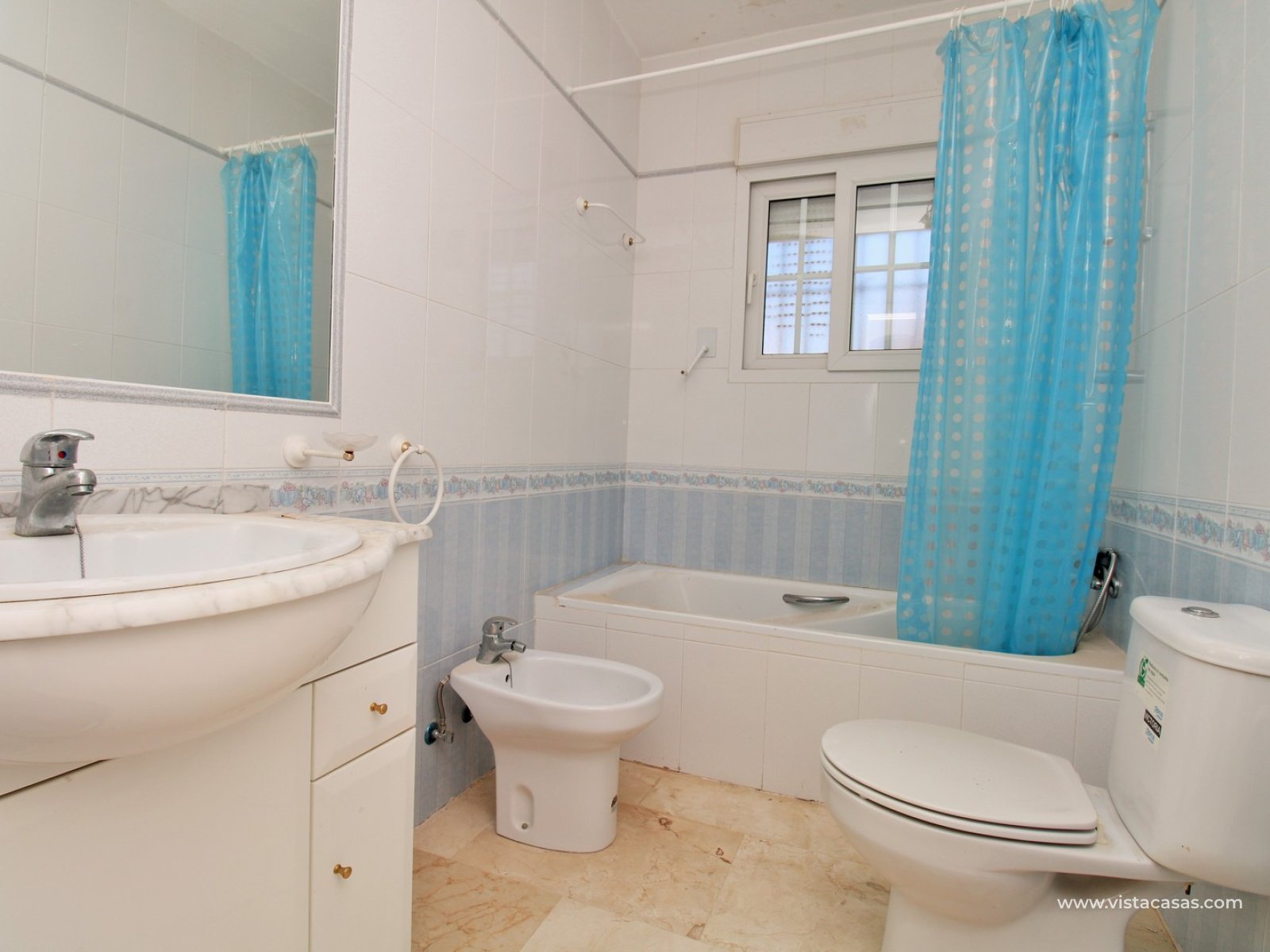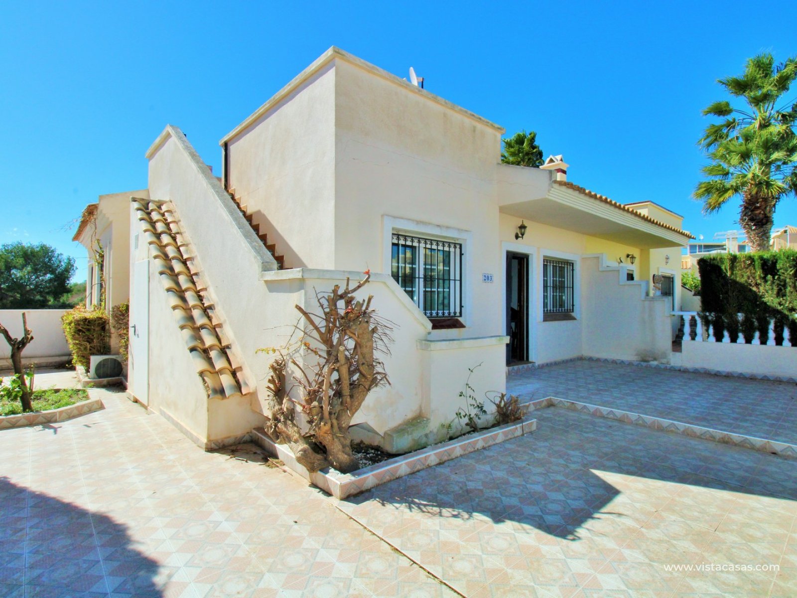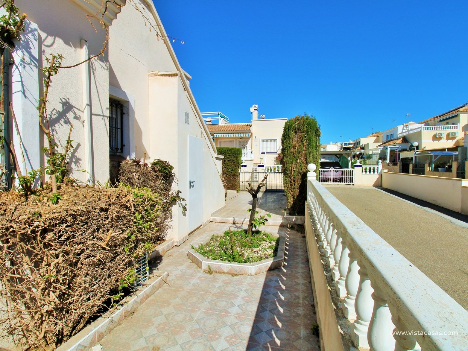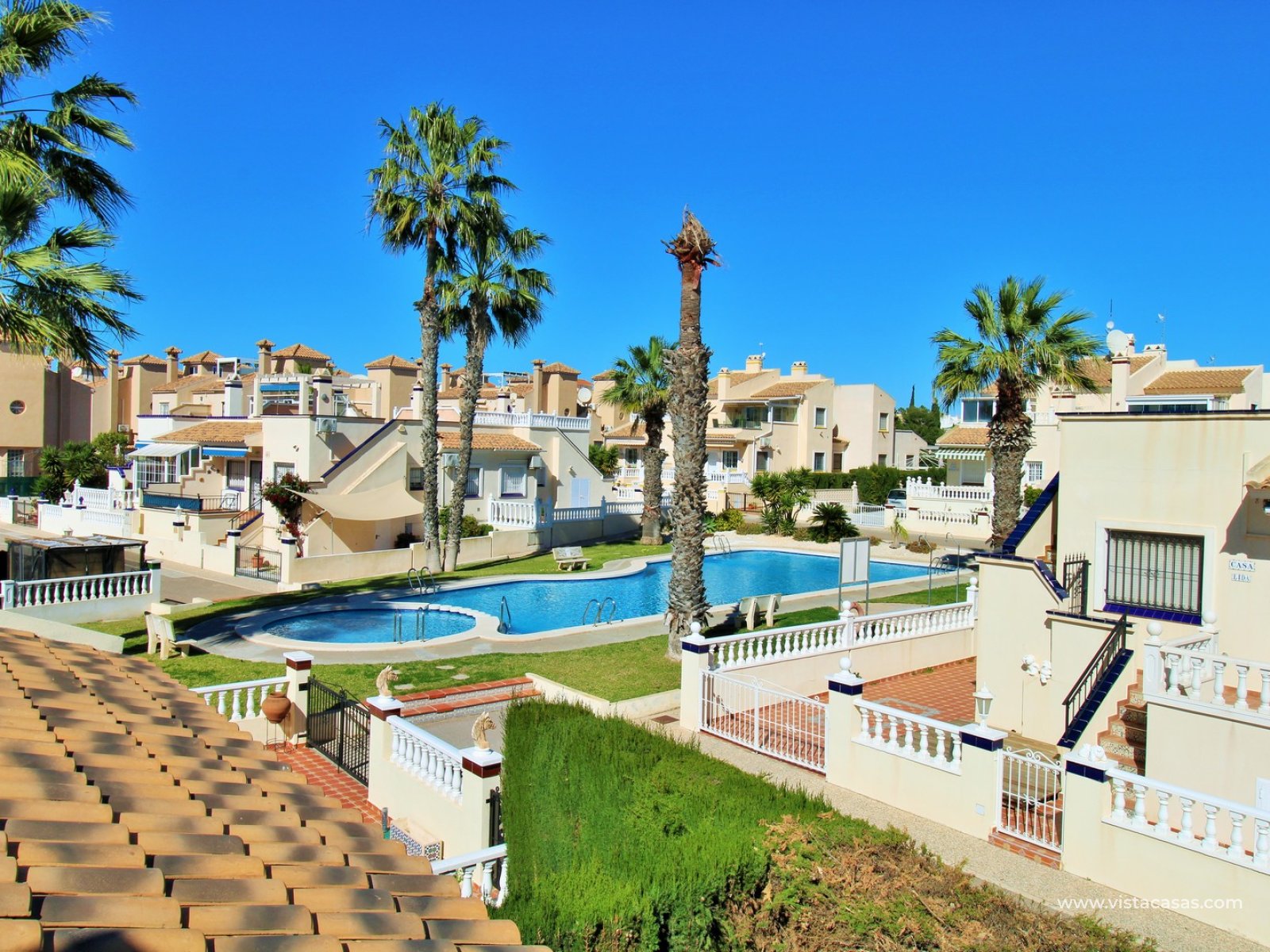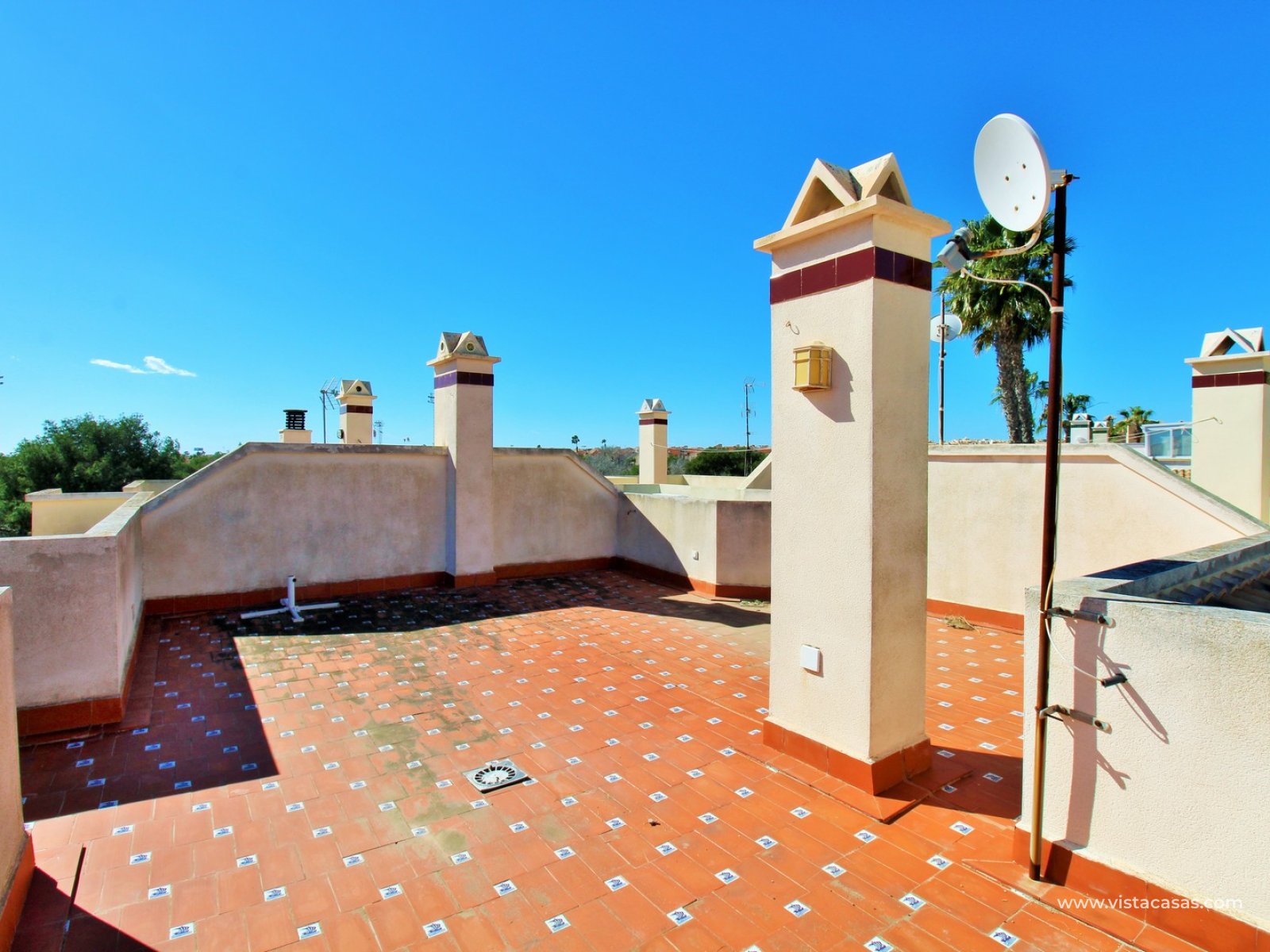 This property offers excellent outdoor space, featuring a private front garden with off-road parking and a spacious private roof solarium enjoying open views towards the communal pool — ideal for relaxing or entertaining in the Mediterranean sun.
