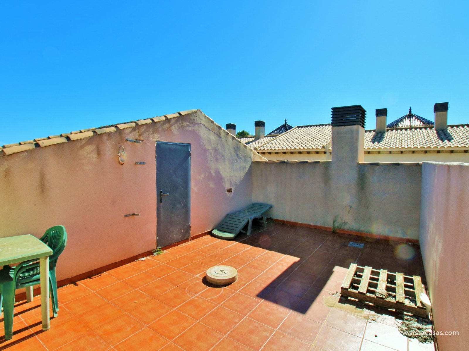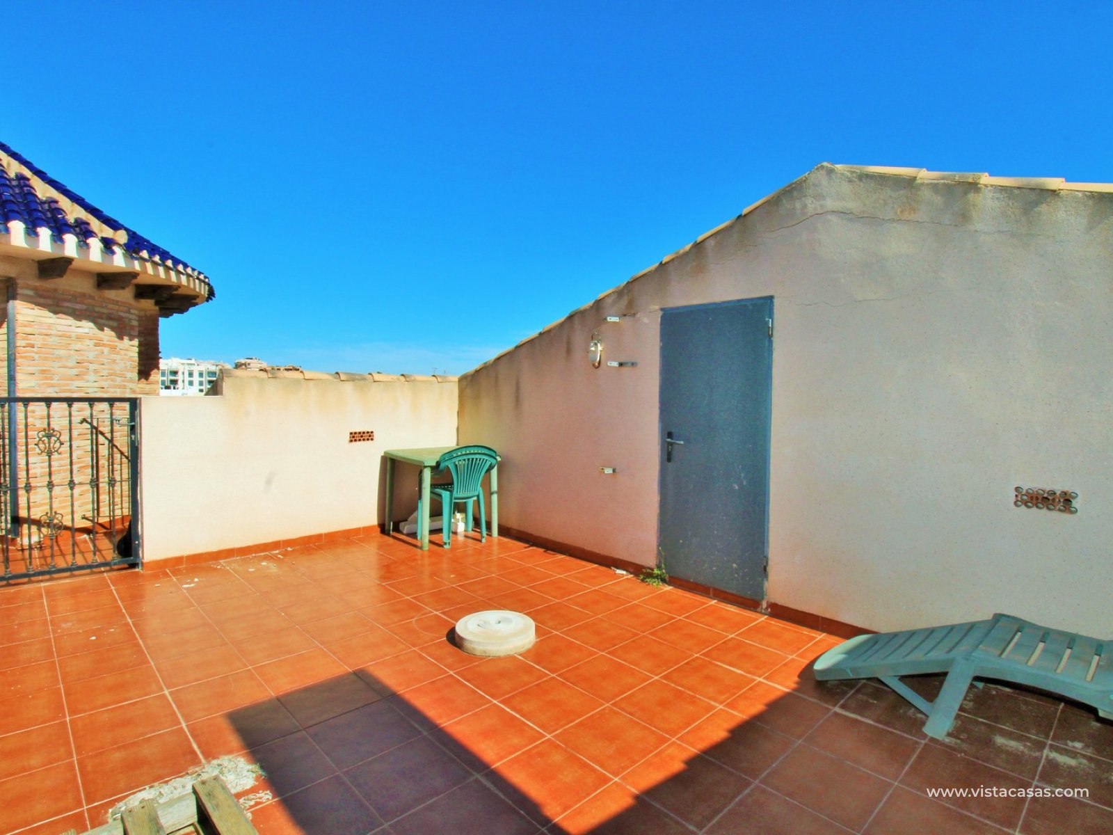 From the living area you access a private front balcony, while an external staircase leads to the standout feature of the property — a generous private roof solarium with storage room, ideal for sunbathing, relaxing, or outdoor dining while enjoying the Mediterranean climate.
