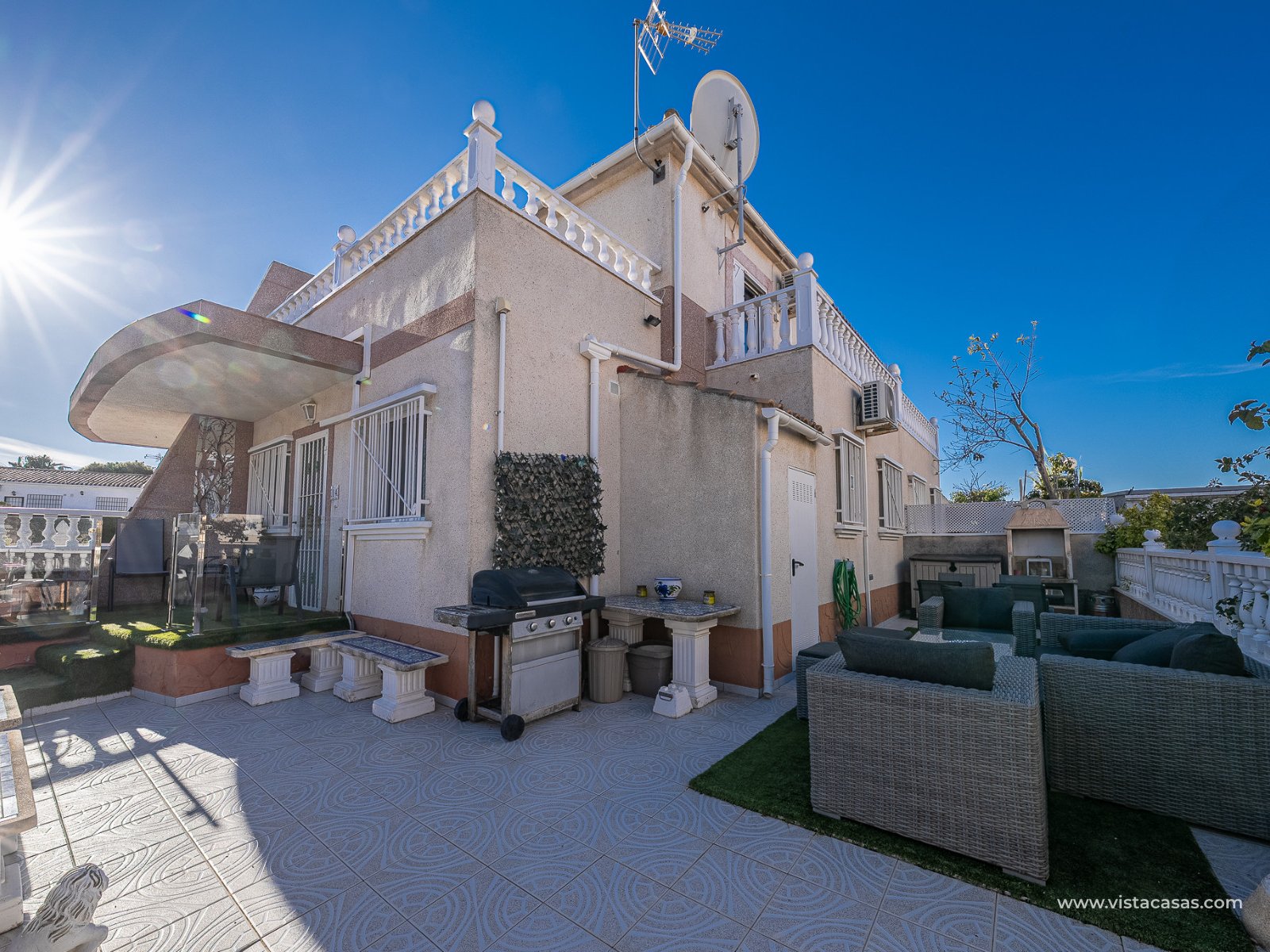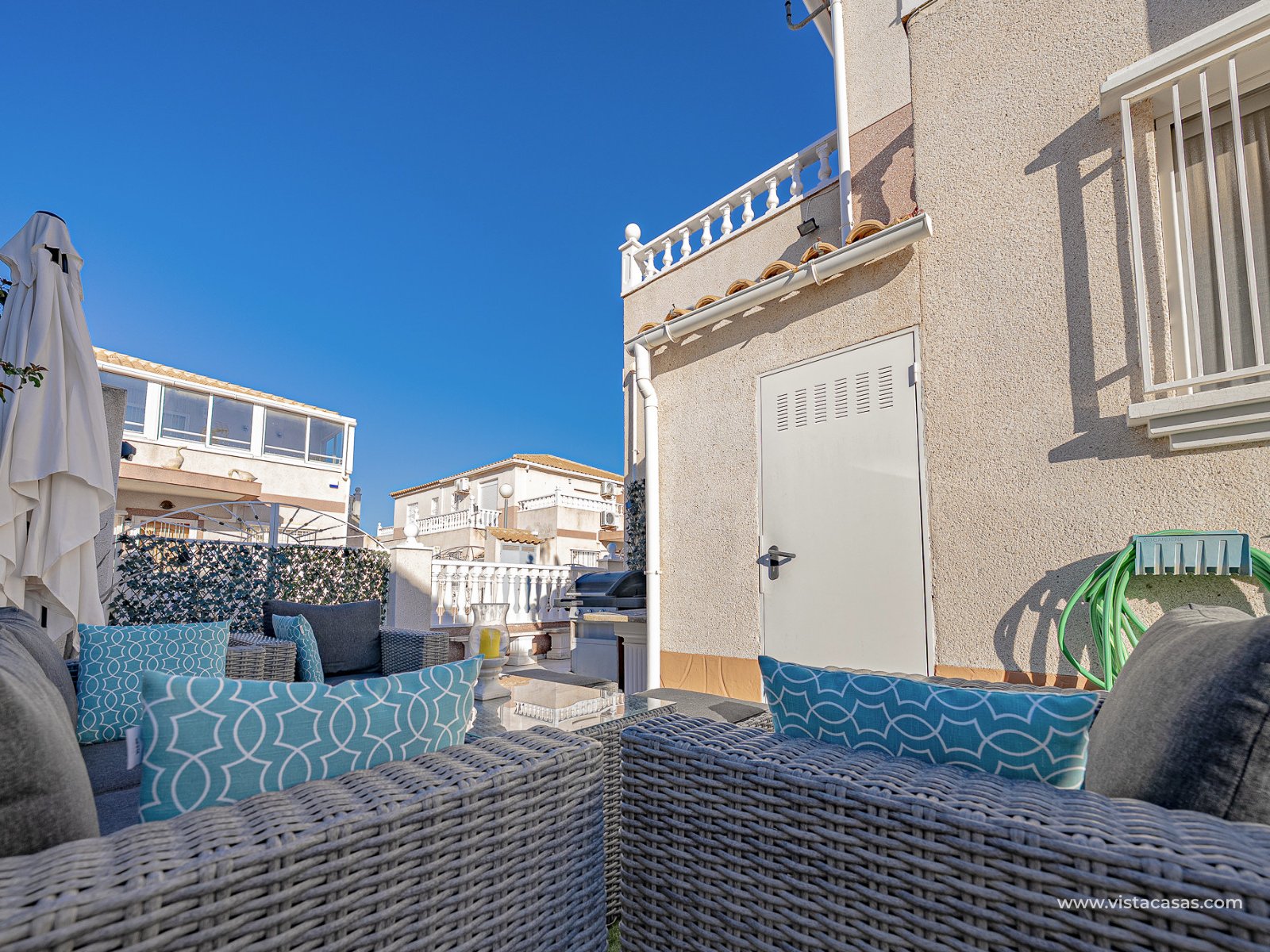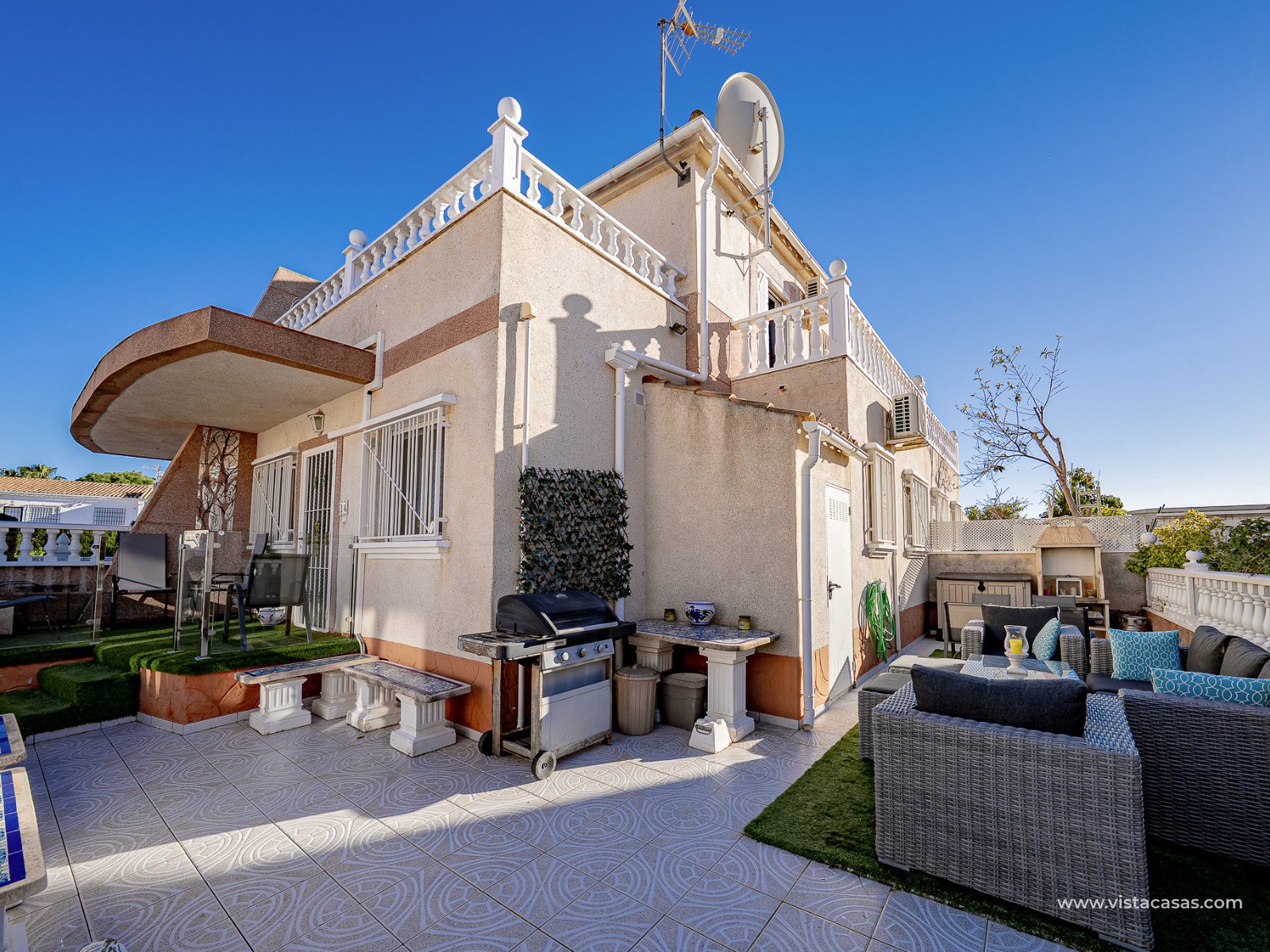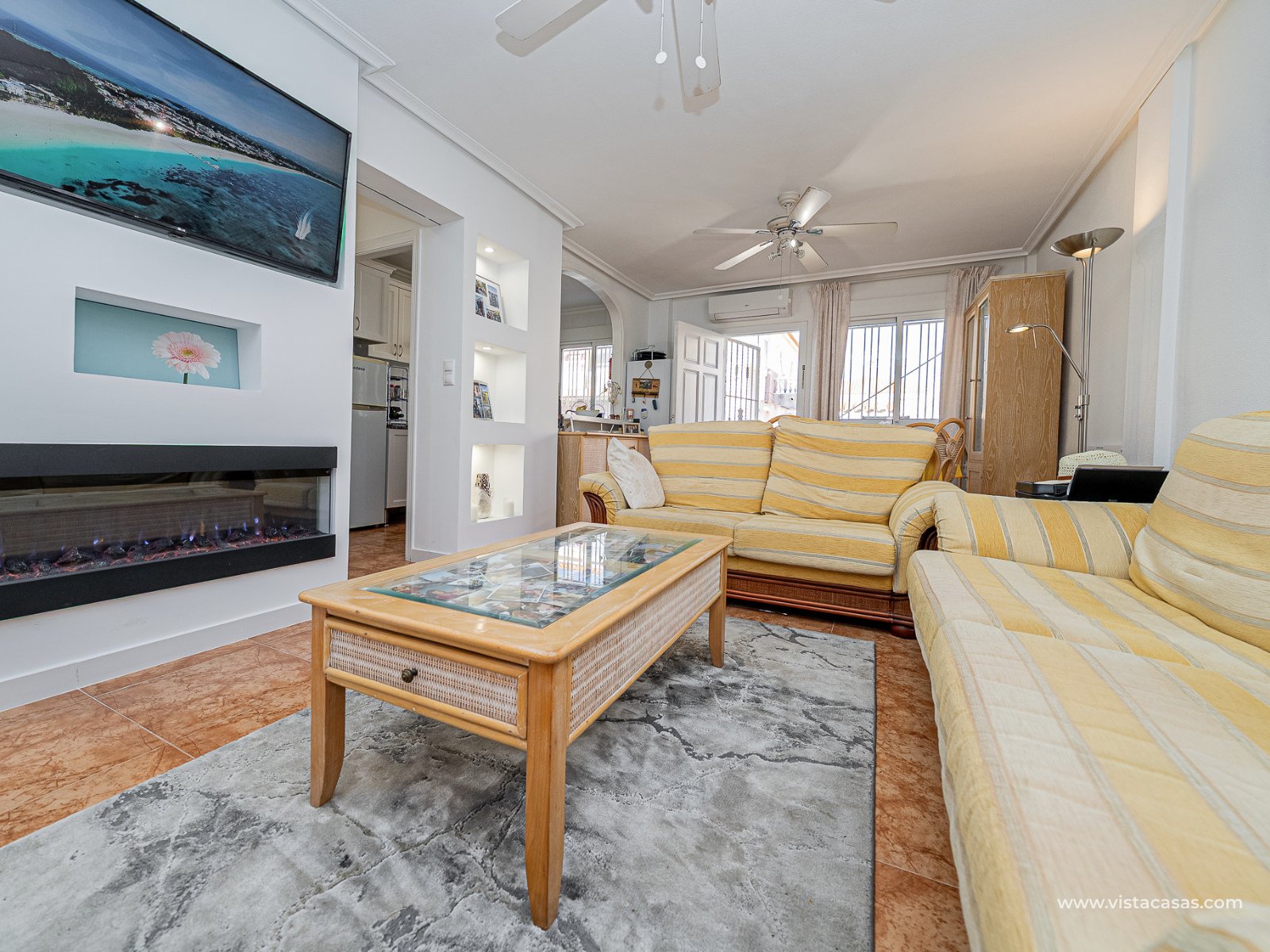Well presented 3 bedroom 2 bathroom quad villa in the La Regia area of Cabo Roig. This charming home is in excellent condition and  ideal for holidays or permanent living. The living room/dining room is open plan with ample space and renovated, built in wall display unit, semi open modern fitted kitchen with American breakfast bar, spacious under-stairs storage room, plus for added convenience a  ground floor bathroom, with walk in shower, double bedroom, The second floor offers a further 2 double bedrooms  both with access to private balcony terraces and  a fully renovated bathroom with walk in shower,  Outside space offers ample terraces, patio garden laid to artificial grass  and tiles with newly installed glass panels and on site parking. The property benefits from air conditioning, infrared panel heaters, ceiling fans, pvc guttering, white goods, part renovated and fully furnished and is totally key ready. Charming community with communal swimming pool, gardens, football pitch, and children´s park, Quiet location walking distance to the renowned Cabo Roig strip (Under a 10 minute walk)  which hosts many shops, cafe- bars restaurants and supermarkets, the sandy blue flag beach of La Caleta, Cabo Roig is under a 15 minutes walk, and only a short drive to the La Zenia boulevard shopping centre and many first-class golf courses. Contact us today for a viewing.
