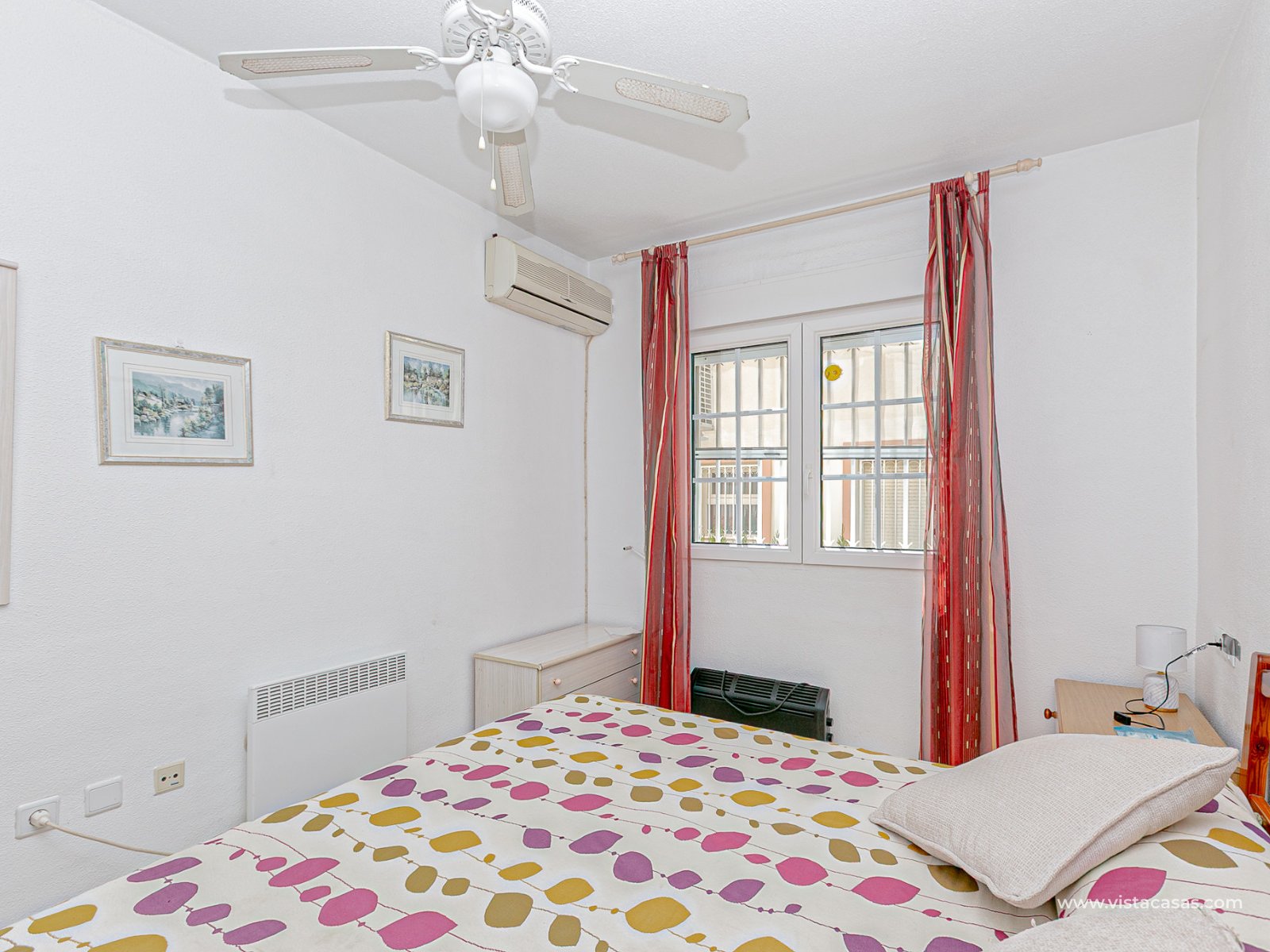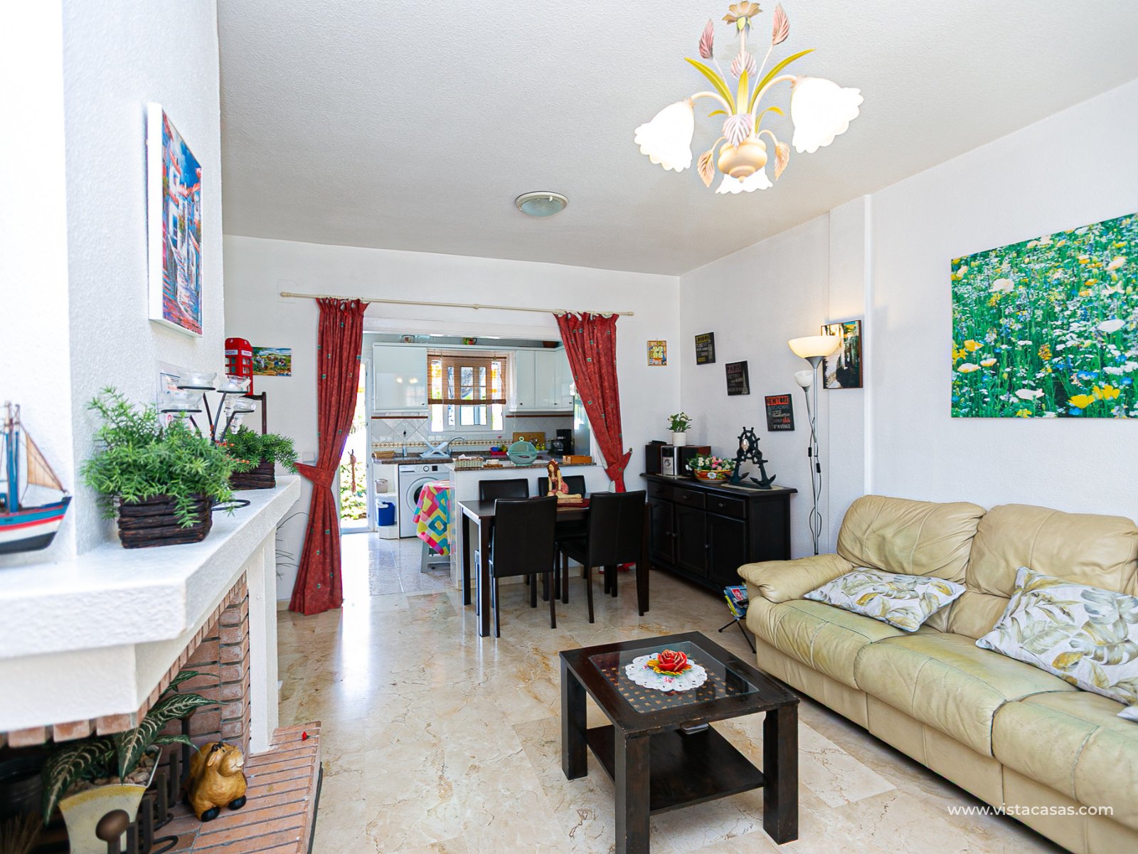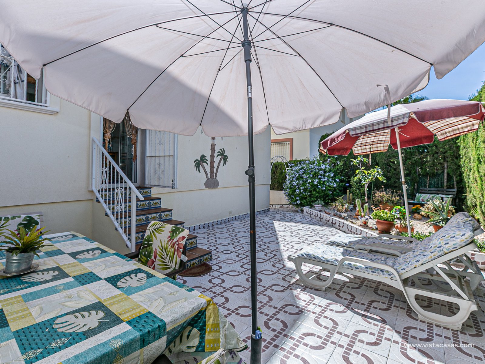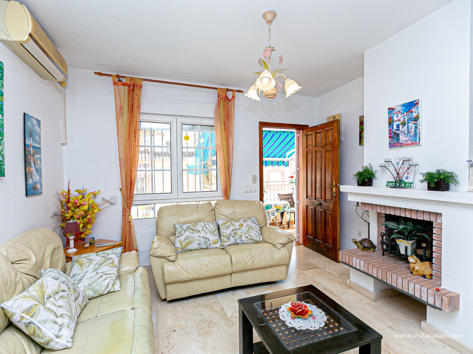 We present this charming ground floor bungalow style apartment, with the convenience of parking your car inside the plot under its practical carport. The property sits on a private semi-circular plot that surrounds the house, offering different outdoor areas to enjoy the Mediterranean climate. At the front, it features a double terrace: one by the entrance and another main terrace equipped with an awning, perfect for relaxing in the shade or sharing meals outdoors. Inside, you will find a spacious living-dining room with air conditioning and a fireplace, creating a cosy atmosphere both in summer and winter. The large independent kitchen includes a breakfast bar and has direct access to the rear garden, adding even more functionality to the home. The night area consists of two bedrooms and one bathroom with shower. The property comes with extras such as ceiling fans and air conditioning in the living room and master bedroom. It is sold furnished (except personal items), without refrigerator and washing machine. Location – Playa Flamenca Playa Flamenca is one of the most sought-after areas of Orihuela Costa, famous for its cosmopolitan atmosphere and blue-flag beaches. It offers all kinds of services within walking distance: restaurants, bars, supermarkets, sports centres and the popular Zenia Boulevard shopping centre. It also enjoys excellent connections to nearby golf courses such as Villamartin, Las Ramblas and Campoamor, as well as to the beaches of La Zenia and Cabo Roig. This property is ideal as a holiday home, investment or permanent residence in one of the most desirable areas of the Costa Blanca. Don’t miss this opportunity and contact us today to arrange a viewing.