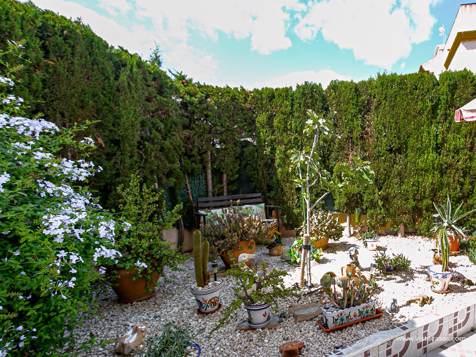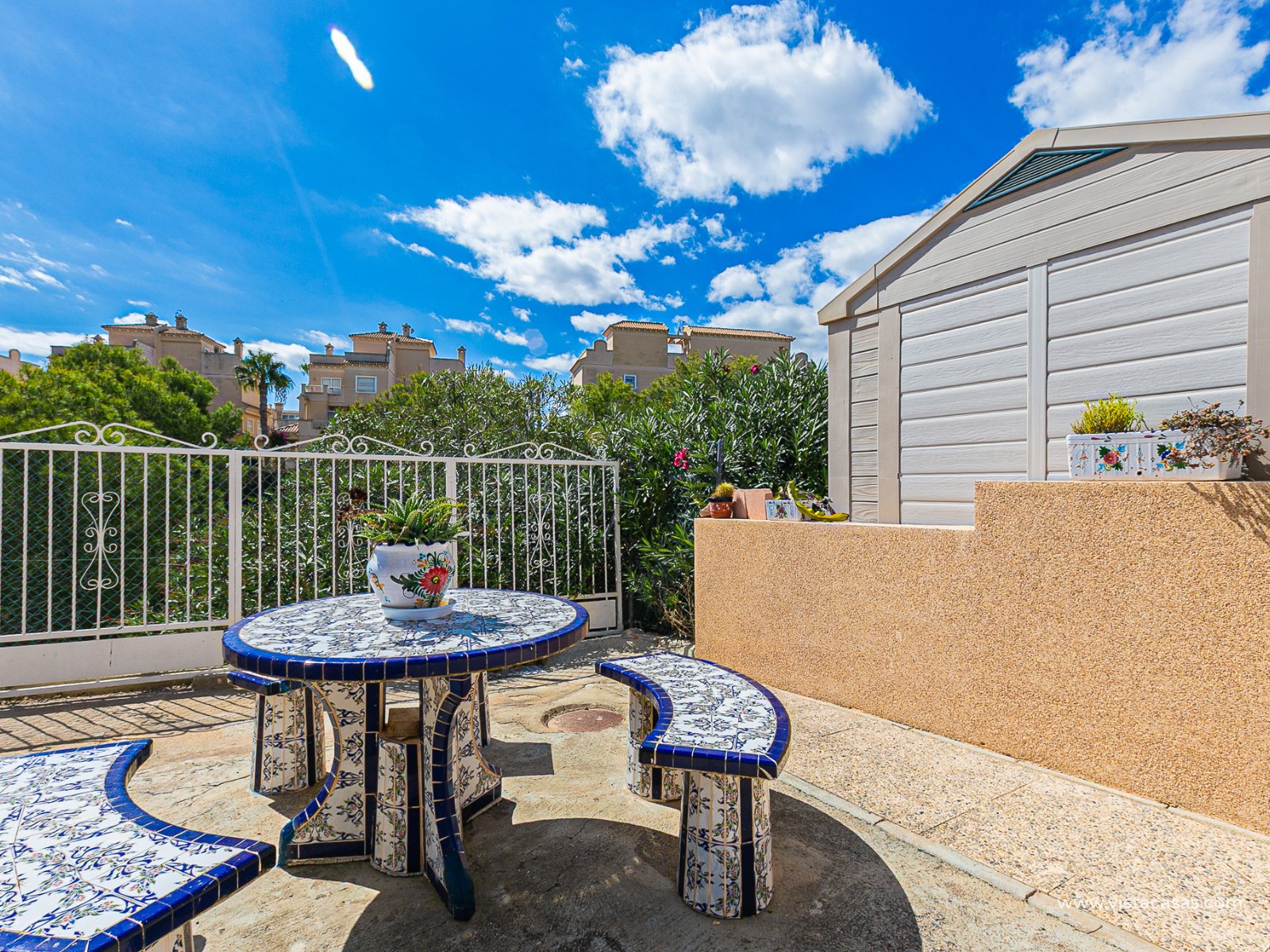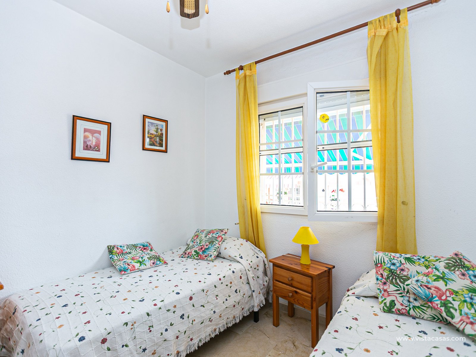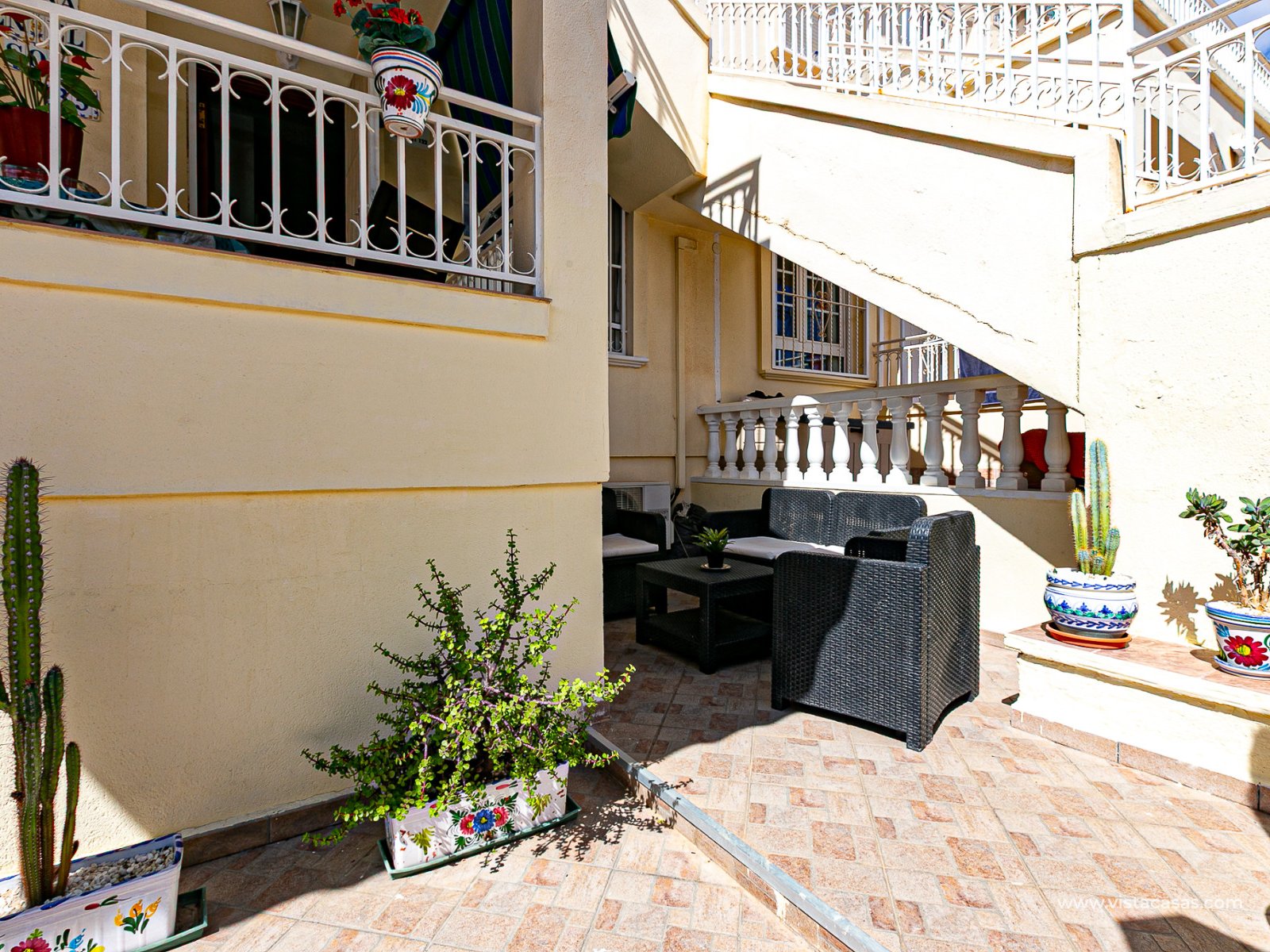 We present this charming ground floor bungalow style apartment, with the convenience of parking your car inside the plot under its practical carport. The property sits on a private semi-circular plot that surrounds the house, offering different outdoor areas to enjoy the Mediterranean climate. At the front, it features a double terrace: one by the entrance and another main terrace equipped with an awning, perfect for relaxing in the shade or sharing meals outdoors. Inside, you will find a spacious living-dining room with air conditioning and a fireplace, creating a cosy atmosphere both in summer and winter. The large independent kitchen includes a breakfast bar and has direct access to the rear garden, adding even more functionality to the home. The night area consists of two bedrooms and one bathroom with shower. The property comes with extras such as ceiling fans and air conditioning in the living room and master bedroom. It is sold furnished (except personal items), without refrigerator and washing machine. Location – Playa Flamenca Playa Flamenca is one of the most sought-after areas of Orihuela Costa, famous for its cosmopolitan atmosphere and blue-flag beaches. It offers all kinds of services within walking distance: restaurants, bars, supermarkets, sports centres and the popular Zenia Boulevard shopping centre. It also enjoys excellent connections to nearby golf courses such as Villamartin, Las Ramblas and Campoamor, as well as to the beaches of La Zenia and Cabo Roig. This property is ideal as a holiday home, investment or permanent residence in one of the most desirable areas of the Costa Blanca. Don’t miss this opportunity and contact us today to arrange a viewing.