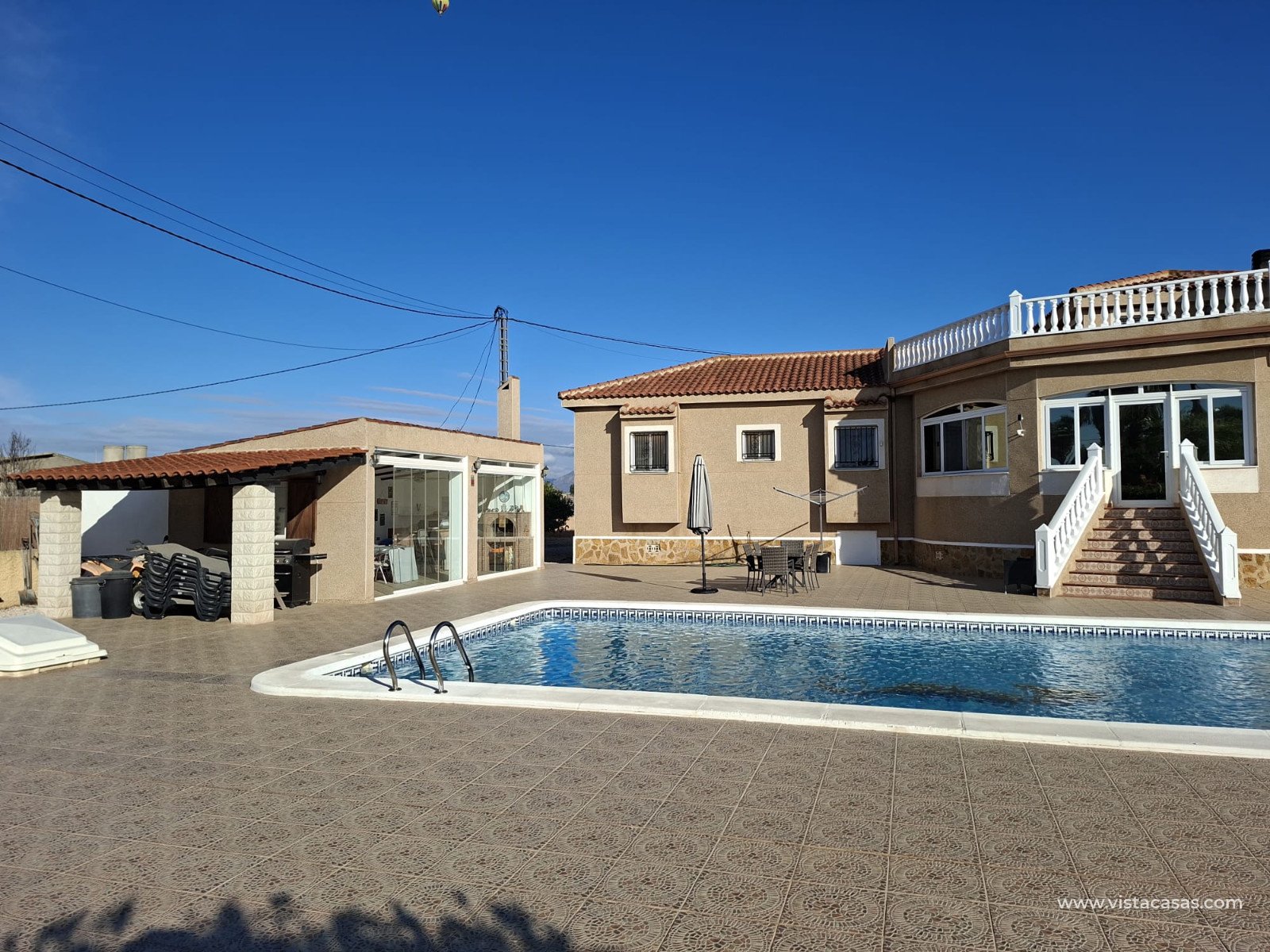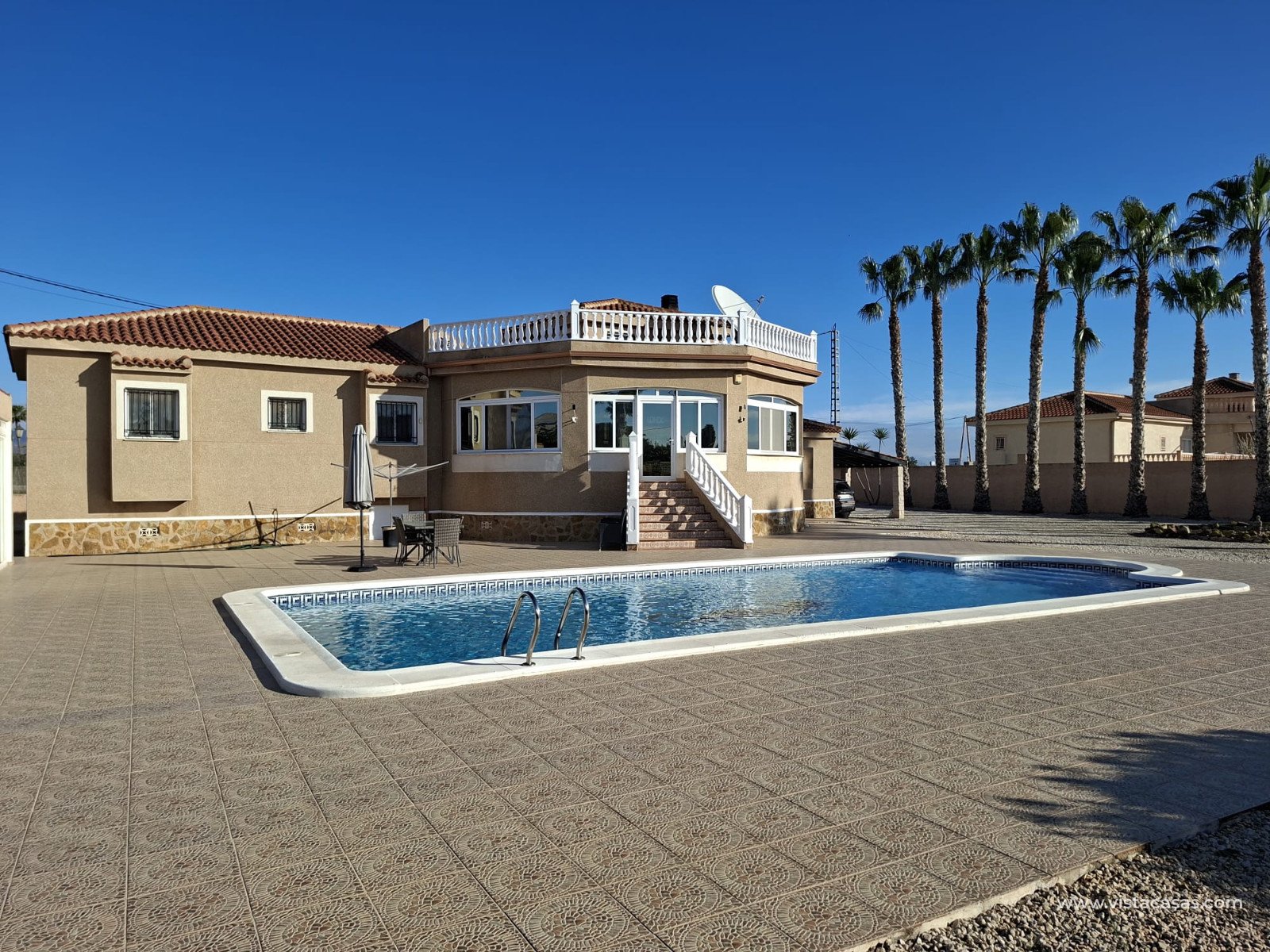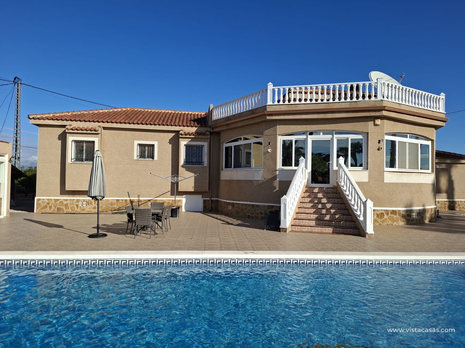 South-Facing 4/5 Bedroom Amelia Style Country Detached Villa with 12m x 6m Pool – Catral 224m² Build | 2,000m² Plot | Mountain Views This beautifully maintained, south-facing country villa is set in peaceful open countryside just outside Catral, offering privacy, space, and stunning mountain views—yet only a five-minute drive from the town’s shops, restaurants, and everyday services. Occupying a generous 2,000m² plot, the property offers 224m² of single-level living designed for comfort and versatility. Interior Features The villa is accessed via double doors into an entrance hallway, leading to an exceptionally spacious lounge with a log burner and striking high galleried ceiling. From here, a doorway connects to the large fully fitted kitchen and dining area, which opens onto a fully glazed curved terrace / sun room with direct access to the the large private roof top solarium and to the garden and pool area—perfect for year-round enjoyment. The main accommodation includes: Three double bedrooms, all with fitted wardrobes and en-suite shower rooms One single bedroom with fitted wardrobesAdditional family shower room Off the kitchen, steps lead down to a 25m² multi-purpose room, currently used as a second lounge / TV room / games room / office / storage area. This flexible space could easily be converted into a fifth bedroom if required. Outdoor Living The walled and landscaped garden has been thoughtfully designed for low maintenance and relaxed outdoor living. Features include: 12 x 6 metre private swimming pool Carport and ample off-road parking Mature palms and established trees Barbecue area 28m² glazed summer house / outdoor kitchen Outdoor shower room 4m x 4m wooden shed Small dog kennels The front of the property enjoys open countryside views stretching to the distant mountain range, reinforcing the villa’s tranquil rural setting. Additional Features Air conditioning throughout the propertyNewly installed EU-approved water treatment systemMonitored alarm system & CCTV Mains water and electricity Excellent outdoor entertaining spaceEasy & direct access from a tarmac road Location An ideal home for families, remote workers, or those seeking a peaceful rural retreat without isolation. The beaches of Costa Blanca South are just 15 minutes away, while the renowned golf courses at La Finca Golf and La Marquesa Golf Course can be reached in approximately 20 minutes.The AP7 motorway is a 3 minute drive taking you to Alicante airport in 20 minutes. Summary A fantastic opportunity to acquire a spacious, move-in-ready villa in a serene countryside location, yet close to all amenities and lifestyle attractions the Costa Blanca has to offer.