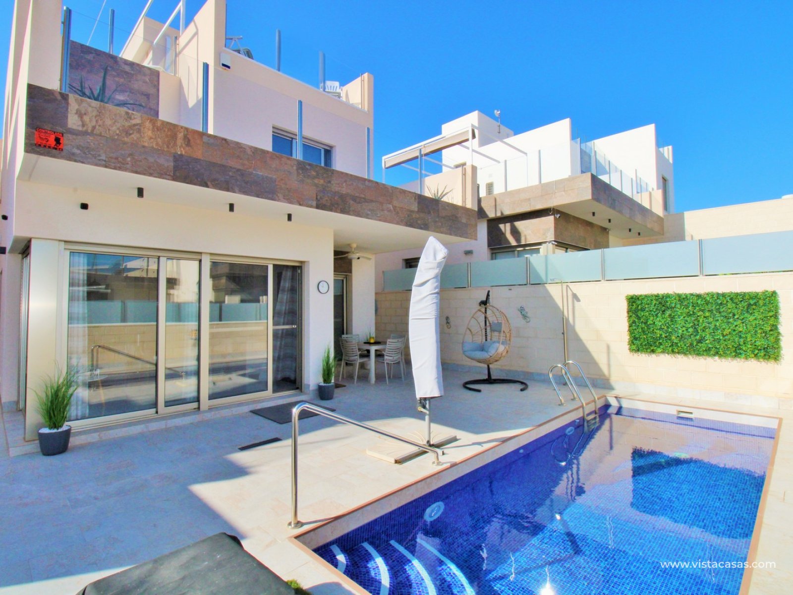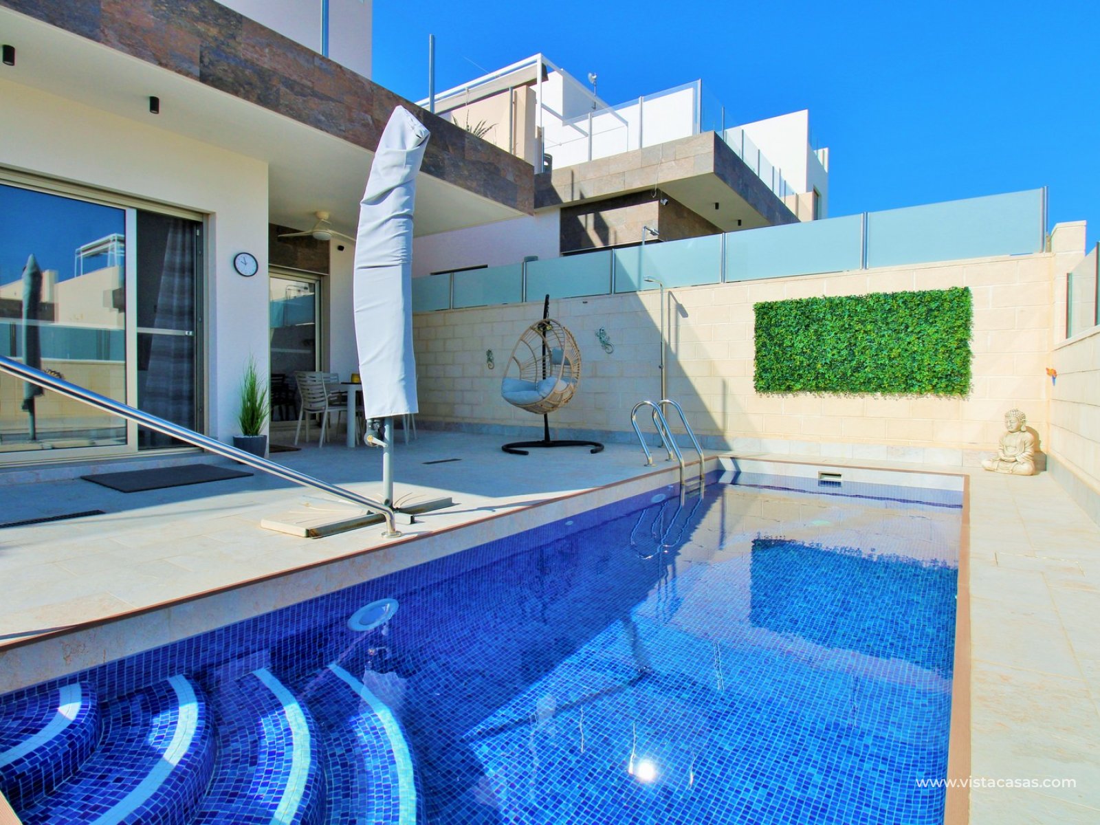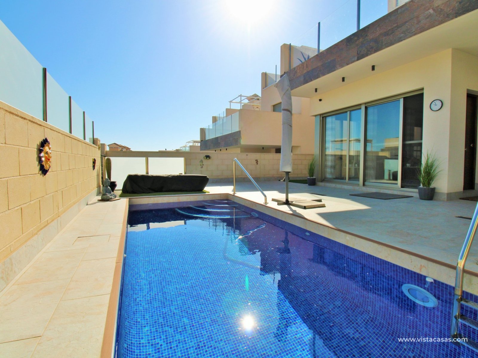 Set on a low-maintenance plot, the property is designed to be enjoyed year-round, featuring a private swimming pool, outdoor shower, and multiple storage areas, along with plenty of space to relax, dine, and entertain outside.
