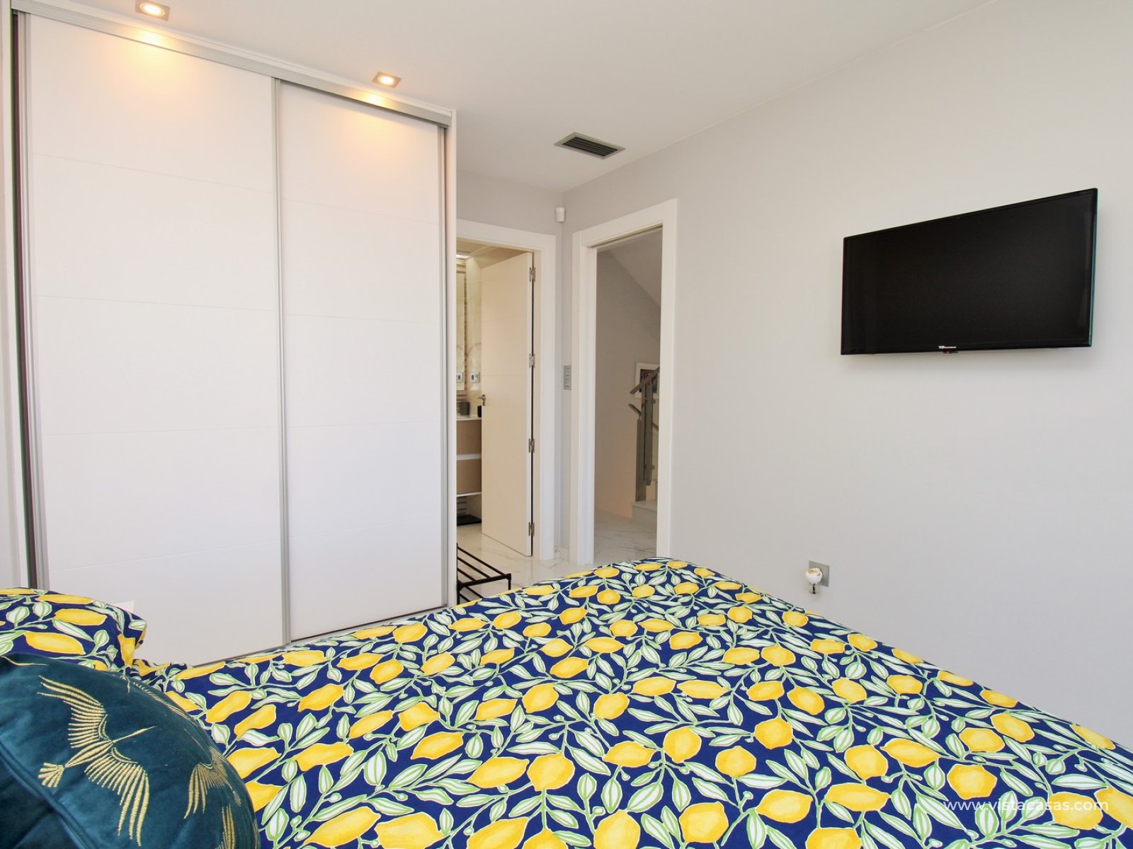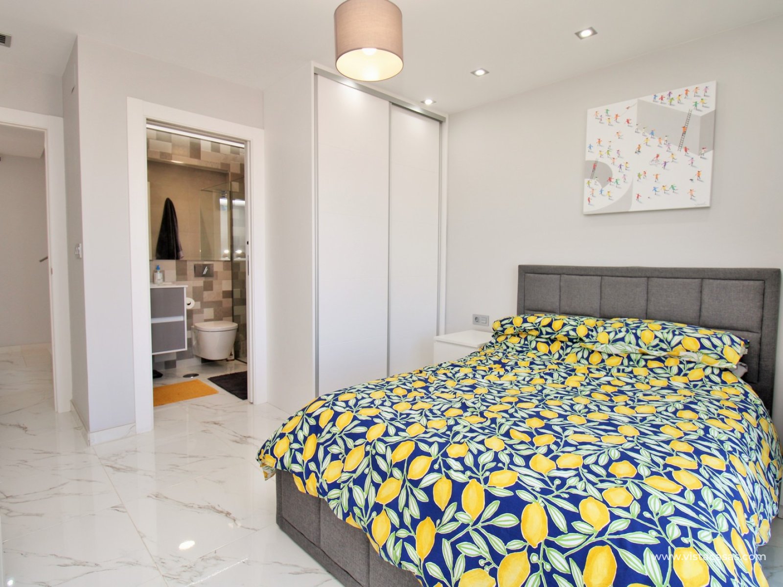 Inside, the villa has a bright and contemporary feel throughout. The open-plan living and dining area flows naturally into a sleek modern kitchen, creating a sociable and practical living space. On this level, there is also a double bedroom with fitted wardrobes and access to a Jack and Jill bathroom, ideal for guests or ground-floor living.