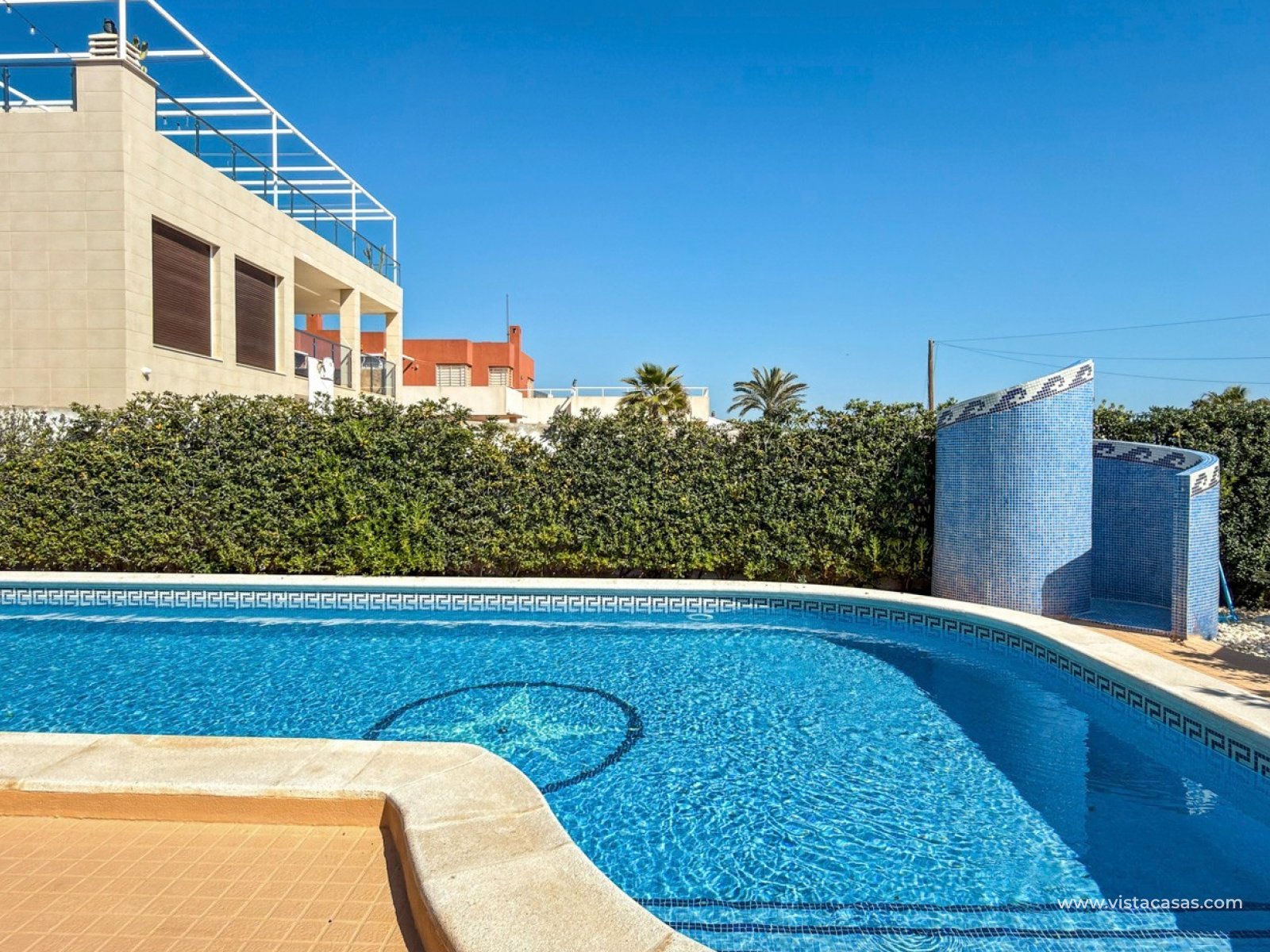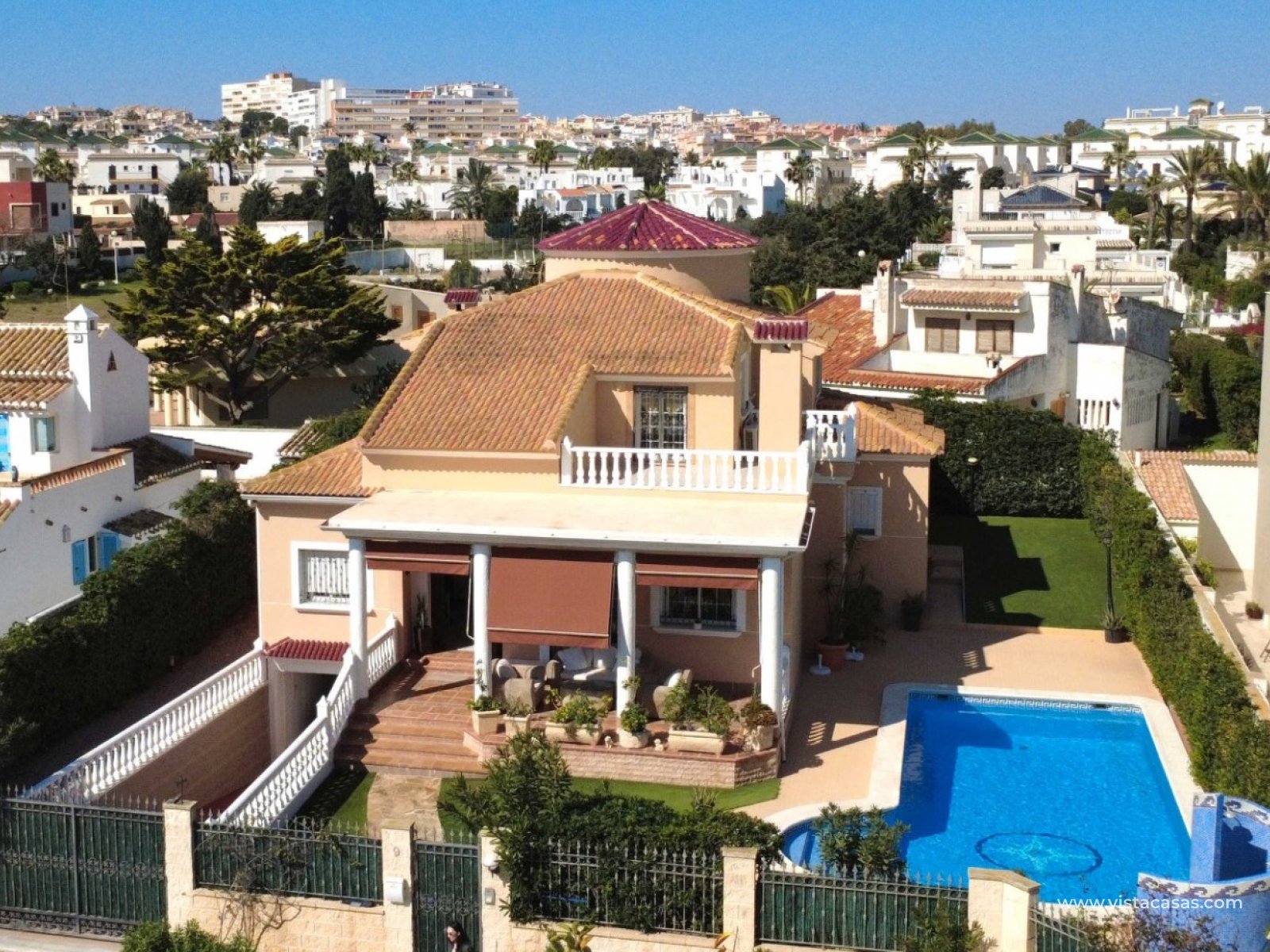 Located in the prestigious residential area of Molino Blanco, this exceptional luxury villa offers space, privacy, and an elevated Mediterranean lifestyle on a generous 800 m² plot. With a total built area of 440 m², the property is distributed over two main floors plus a fully equipped semi-basement designed as an independent living space — perfect for guests or extended family. The villa features six spacious double bedrooms and five fully equipped bathrooms, making it ideal for large families or those who enjoy hosting. Each level offers bright and elegant living and dining areas, creating multiple spaces to relax and entertain. At the heart of the home, you’ll find a large independent kitchen with direct access to the garden — perfectly designed for both everyday living and social gatherings. The outdoor areas truly elevate this property. A stunning private swimming pool is surrounded by a lush, landscaped garden, offering a peaceful and private retreat under the Mediterranean sun. A covered porch and pergola with a built-in barbecue create the perfect setting for unforgettable moments with family and friends. The property is equipped with modern comforts including centralized heating, air conditioning, and a full alarm system for security and peace of mind. Located within an exclusive residential complex, the community also benefits from ongoing maintenance services, including professional gardening, ensuring the surroundings remain pristine all year round.