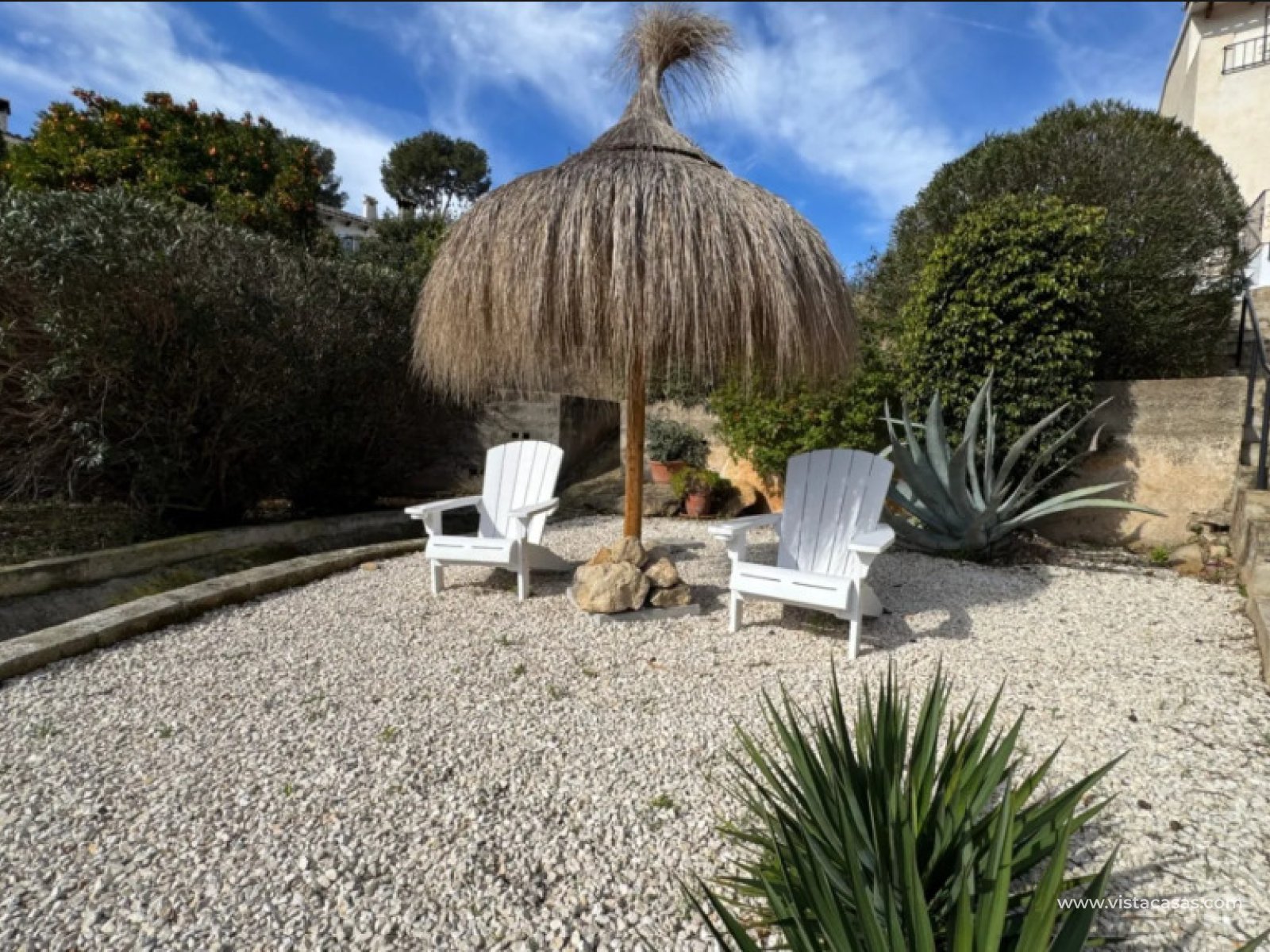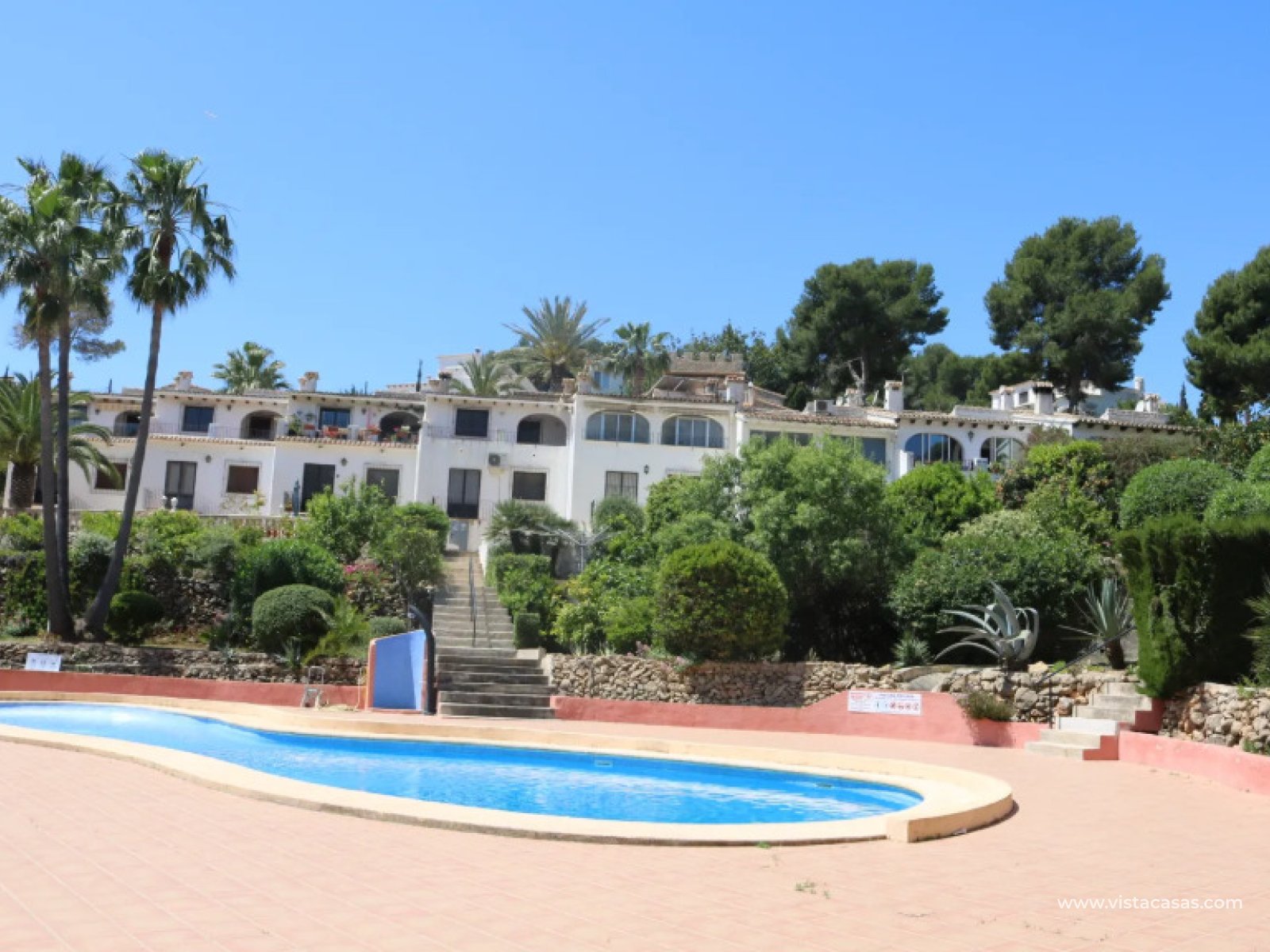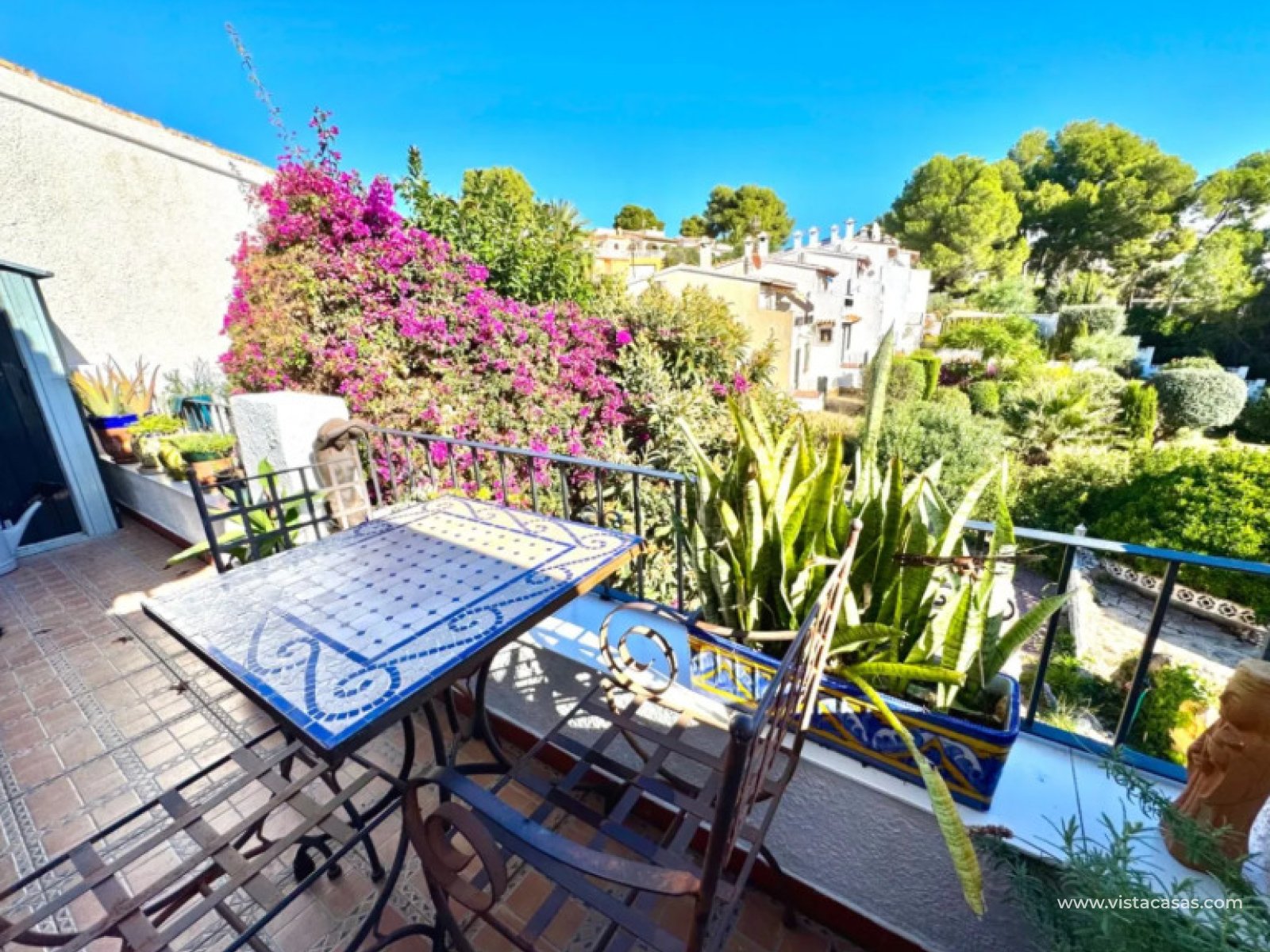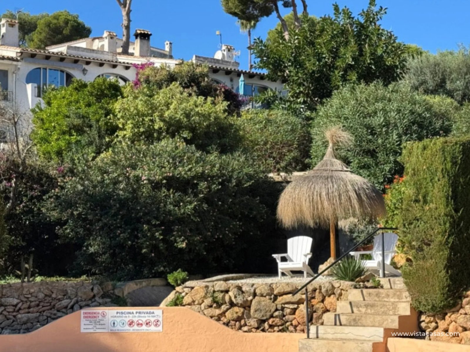 A delightful duplex townhouse only 1.8 km from Moraira centre. set on a small and incredibly pretty complex of 13 houses with a communal pool and beautiful gardens. Within only 500–600 m you’ll find the wonderful Tabaira area, where you can walk to restaurants, a supermarket and local services. This makes the home ideal either for everyday living or holiday use.On the main floor, there is an entrance room, currently used as a study, then entry to the large open plan living/dining area with a balcony of 6 x 1.5 metres, with amazing views a good size kitchen with a breakfast bar.The lower floor has 2 double bedrooms, one with access to the spacious outside garden, perfect for relaxing and a BBQ entertaining area. A full bathroom and a shower/guest toilet. Plus, a third room without windows to use as storage or as another bedroom. The property has aluminium double glazing throughout, air conditioning and faces East for ample sun!The plot is around 300 m2, and the house is 100 m2 with parking included.To conclude, this is a stunning traditional property on a small and beautifully peaceful complex in one of the most desirable and affluent areas of Spain. Perfect for use as a lock-up and leave holiday home or all year round living. Contact us to arrange a viewing as it will sell quickly!