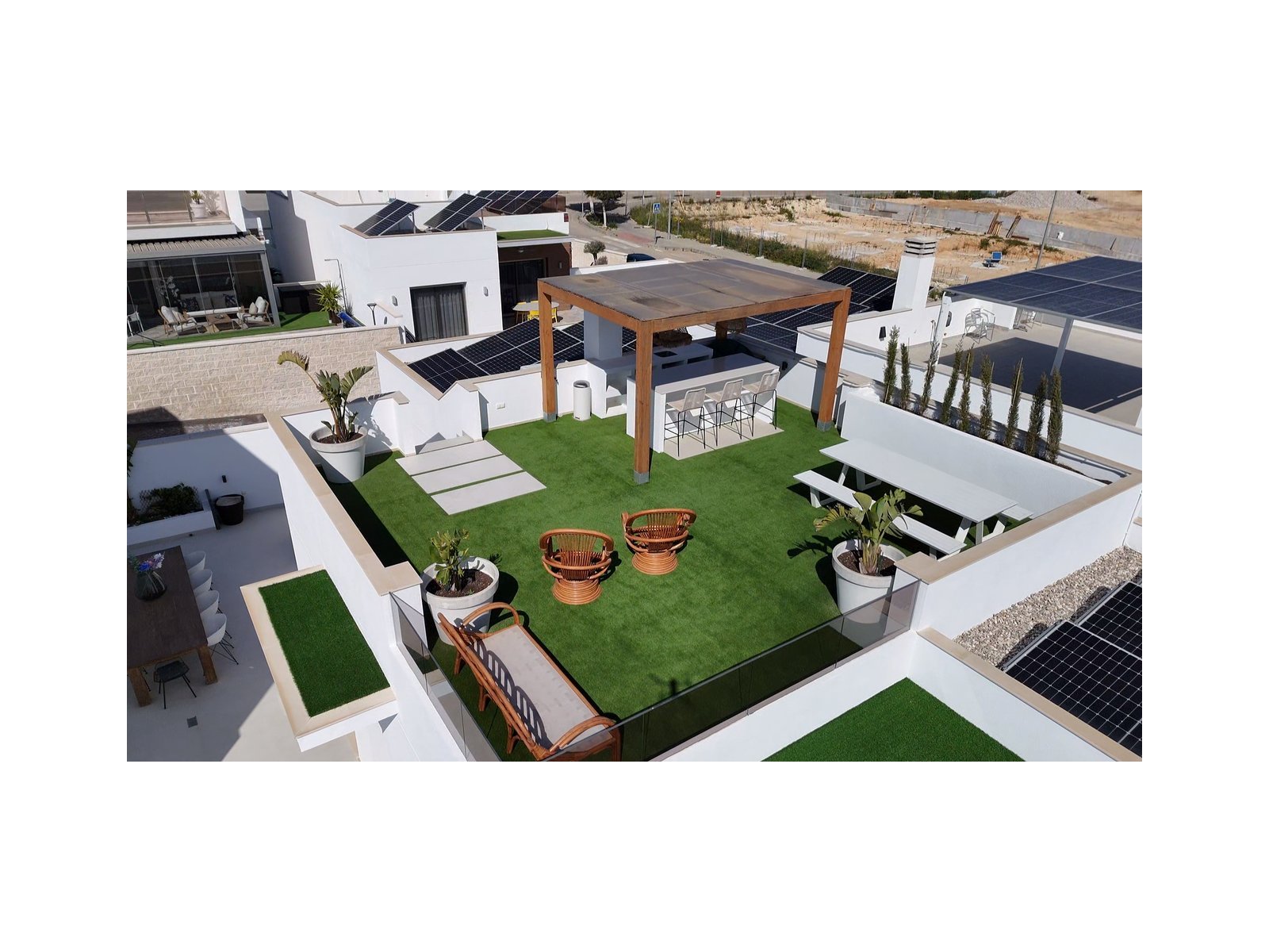 Set within a peaceful and exclusive residential area of San Miguel de Salinas, this exceptional three-year-old detached villa offers a refined blend of modern architecture, versatile living space, and energy-efficient design — perfect for those seeking comfort, privacy, and Mediterranean luxury. The main living accommodation is arranged across one beautifully designed level, featuring three spacious bedrooms and two stylish bathrooms. The open-plan living and dining area is filled with natural light and flows seamlessly to the outdoor terrace and private swimming pool, creating an ideal setting for both relaxed family living and sophisticated entertaining. A standout feature of this property is the private rooftop solarium, offering panoramic views and an additional outdoor living space. Complete with a fully equipped outdoor kitchen, it provides the perfect environment for al fresco dining, sunset drinks, and year-round entertaining under the Spanish sky. The villa also benefits from a substantial full-size underbuild, offering exceptional flexibility and lifestyle potential. This level currently comprises: a fourth bedroom and third bathroom, ideal for guests or independent accommodation a large private gym and a separate playroom This expansive space can easily be adapted into a cinema room, home office, guest apartment, or bespoke leisure suite depending on your needs. In addition, the property is fitted with 10 solar panels, enhancing energy efficiency and significantly reducing electricity costs while supporting sustainable living. Key luxury features include: 4 bedrooms | 3 bathrooms Single-level main living for ease and comfort Spectacular rooftop solarium with outdoor kitchen Private swimming pool and multiple outdoor entertaining areas Large, highly versatile underbuild with independent potential Solar-powered electricity system Quiet, upscale location close to golf courses, beaches, and amenities This villa presents a rare opportunity to acquire a nearly new, energy-efficient home with extensive indoor and outdoor living space in one of the most desirable areas of the southern Costa Blanca — ideal as a permanent residence, executive holiday retreat, or premium investment property.