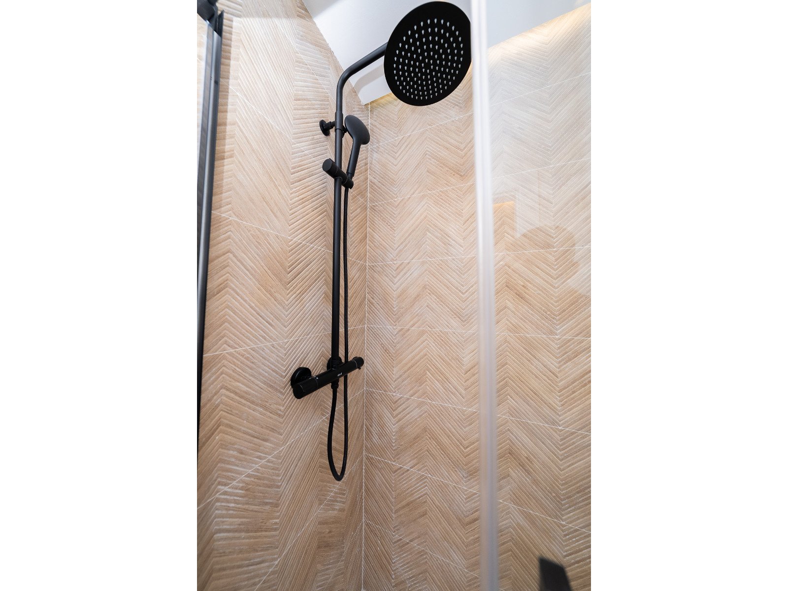 The double bedroom is fitted with a ceiling fan with integrated lighting, while the living area benefits from air conditioning. An alarm system provides additional security, and the bathroom is finished to a modern standard.