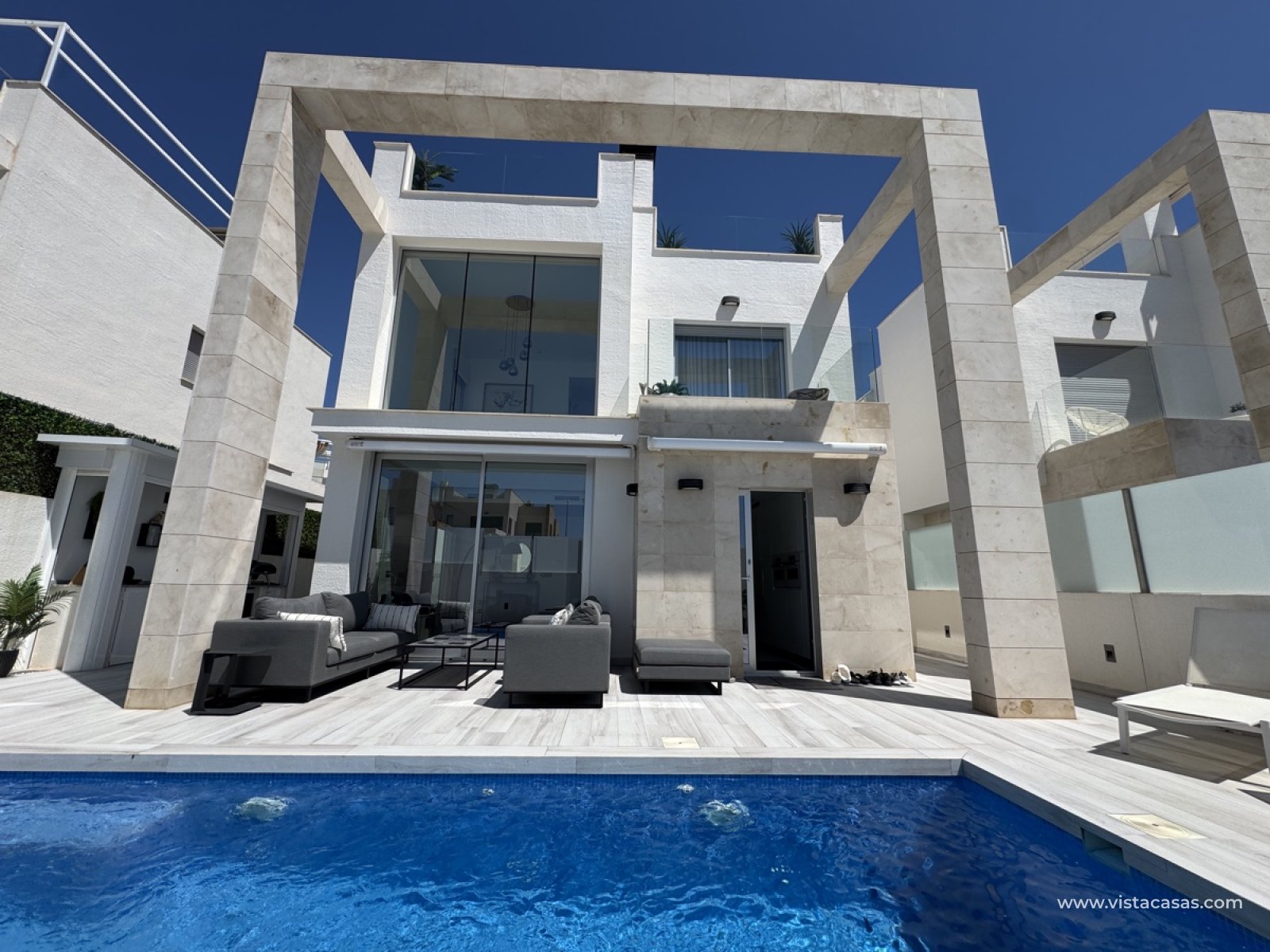 This stunning 4-bedroom modern villa is perfectly situated in the popular area of Lomas De Cabo Roig, offering a luxurious and private retreat for families and individuals alike. Key Features include - Spacious living room with sliding doors to the garden and pool area - Fully equipped modern kitchen with granite worktops and appliances - 4 comfortable bedrooms, including a master bedroom with en-suite bathroom - 4 modern bathrooms - Private swimming pool with sunbathing area and outdoor dining - Under build with second lounge (4th bedroom) and kitchen -Amazing Roof Top Terrace with distant sea views - Unfurnished -Underfloor Heating in all bathrooms. This Private Oasis allows you to enjoy relaxing afternoons around the the private pool or soaking up the sun on the sun loungers. A custom built outdoor kitchen allows you to host barbecues and gatherings in the wonderful garden. Cabo Roig is a charming coastal town in the south of Spain, known for its beautiful beaches, golf courses, and vibrant community. This villa is ideally located for those who want to experience the best of coastal living. Perfect For - Families, couples, and individuals seeking a luxurious and private retreat in a beautiful coastal setting. Please note this property is being sold unfurnished. Build Area - 208m² Plot - 250m² Yearly Suma Tax - €512 Yearly Community Fee - €265 For more information or to arrange a viewing Contact us today!