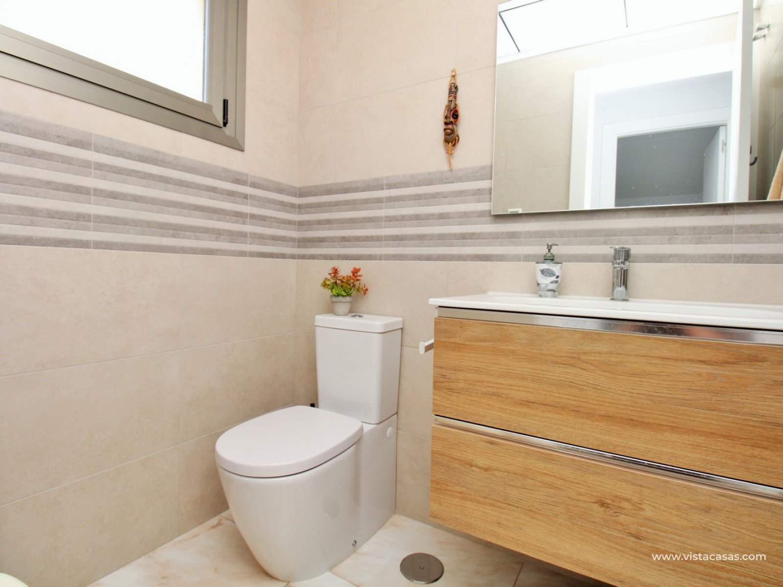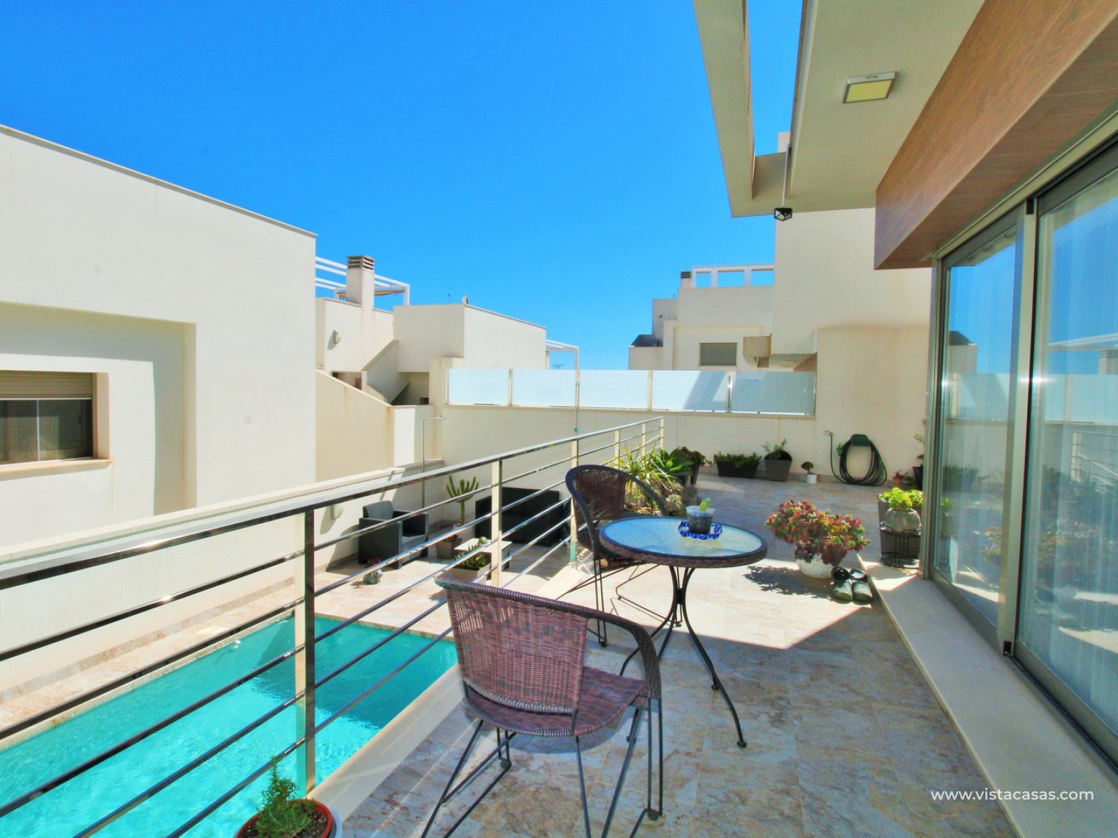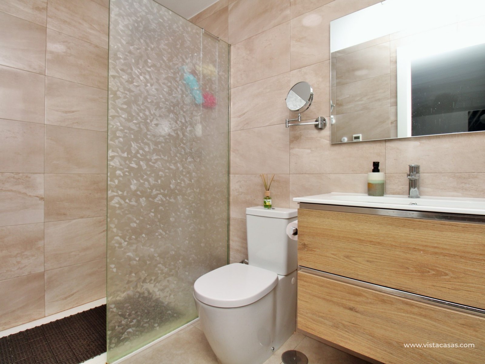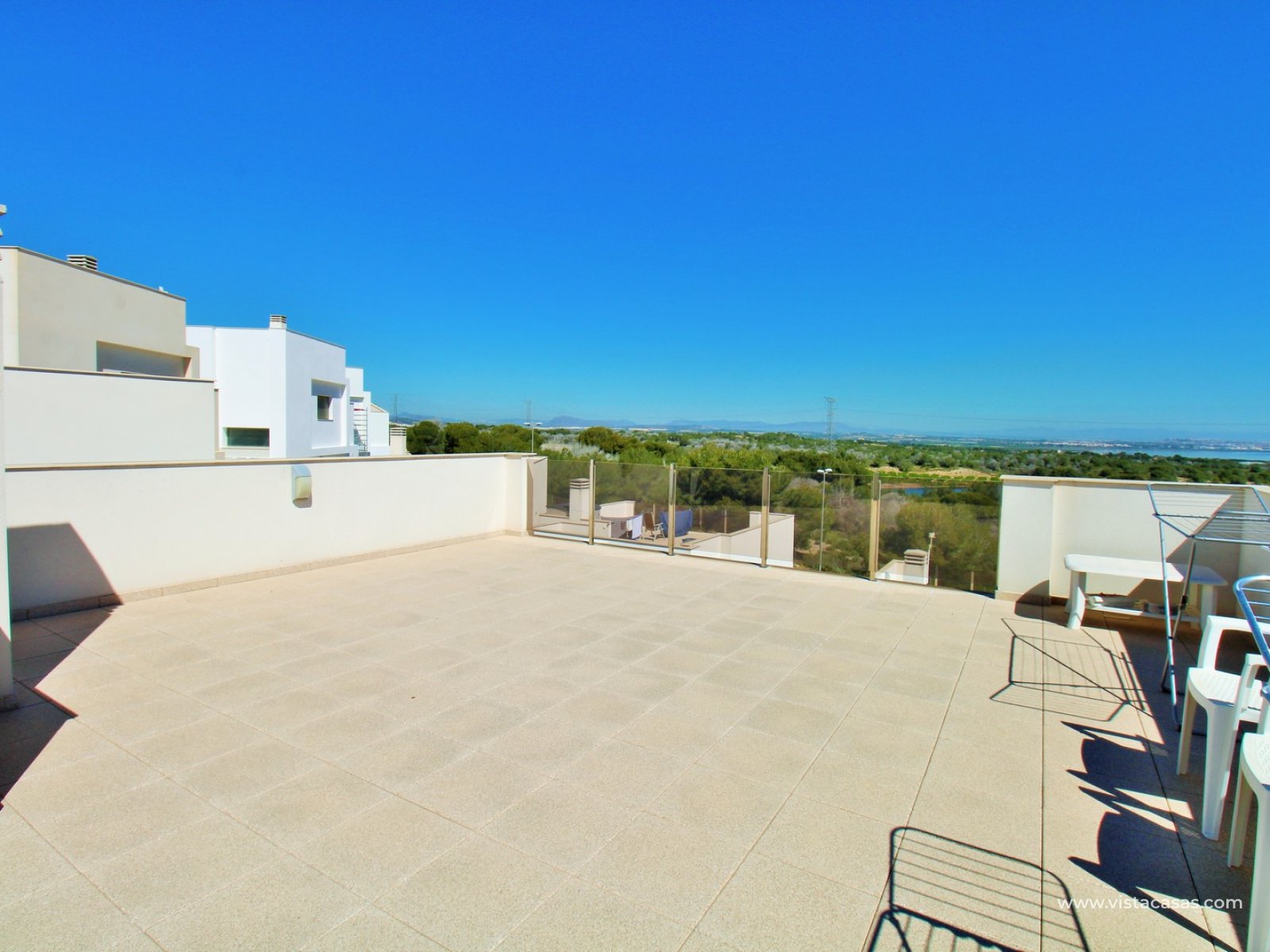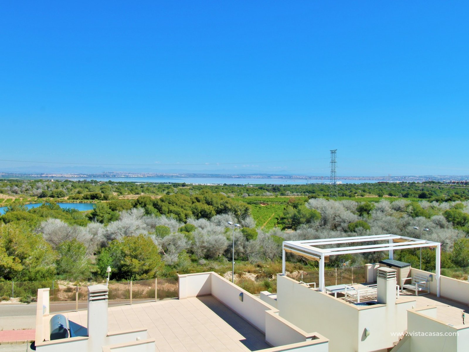 Upstairs, there are two spacious double bedrooms, both offering en-suite bathrooms with walk-in showers and access to a private balcony. From the landing, you can access the impressive roof solarium, enjoying all-day sunshine and open views towards the Torrevieja salt lakes.