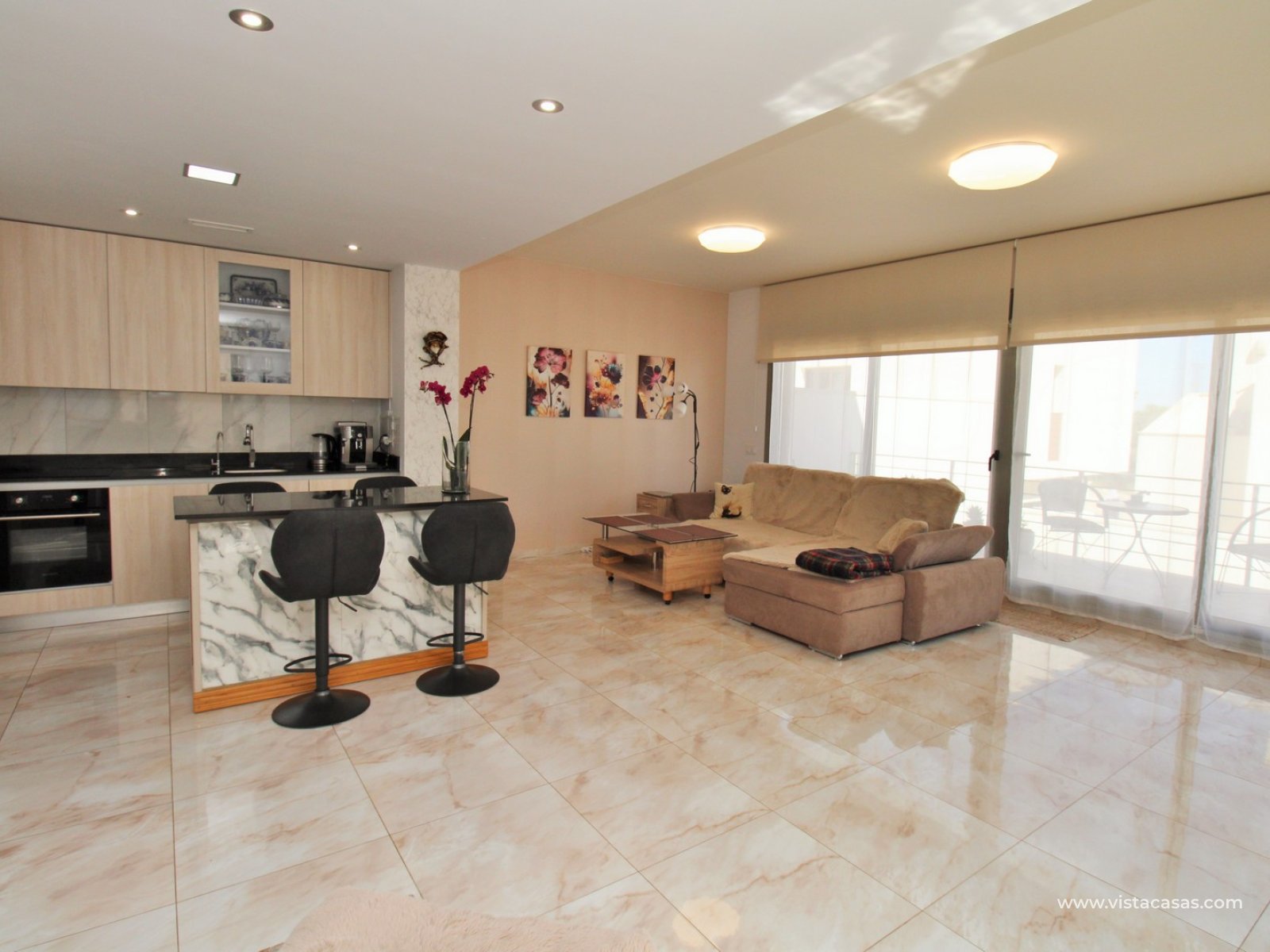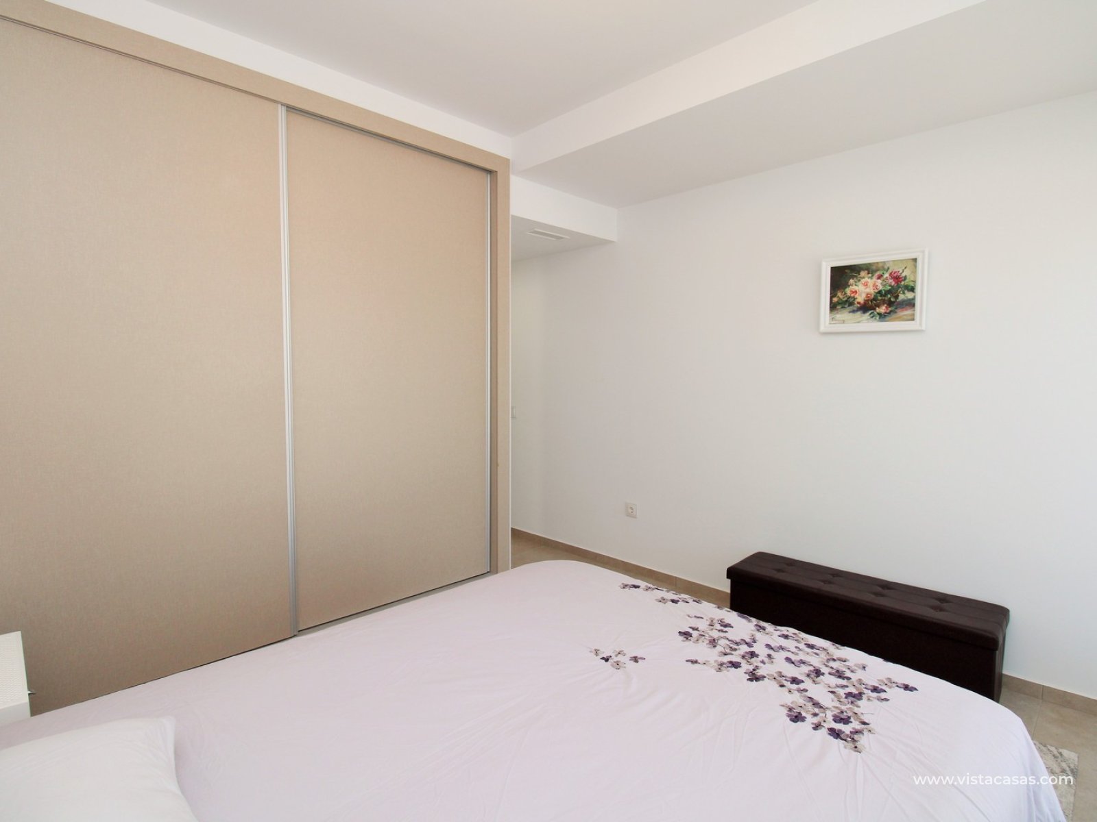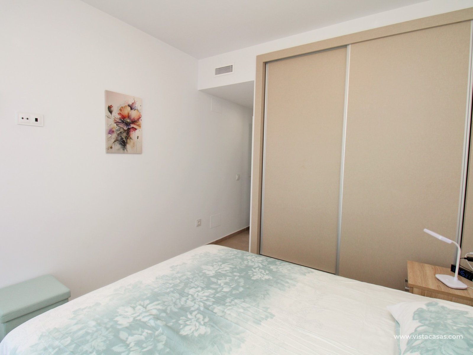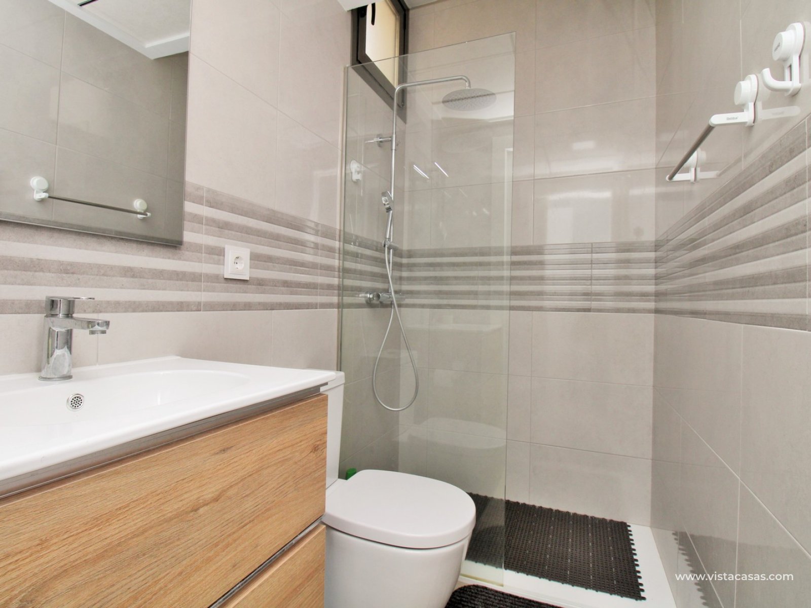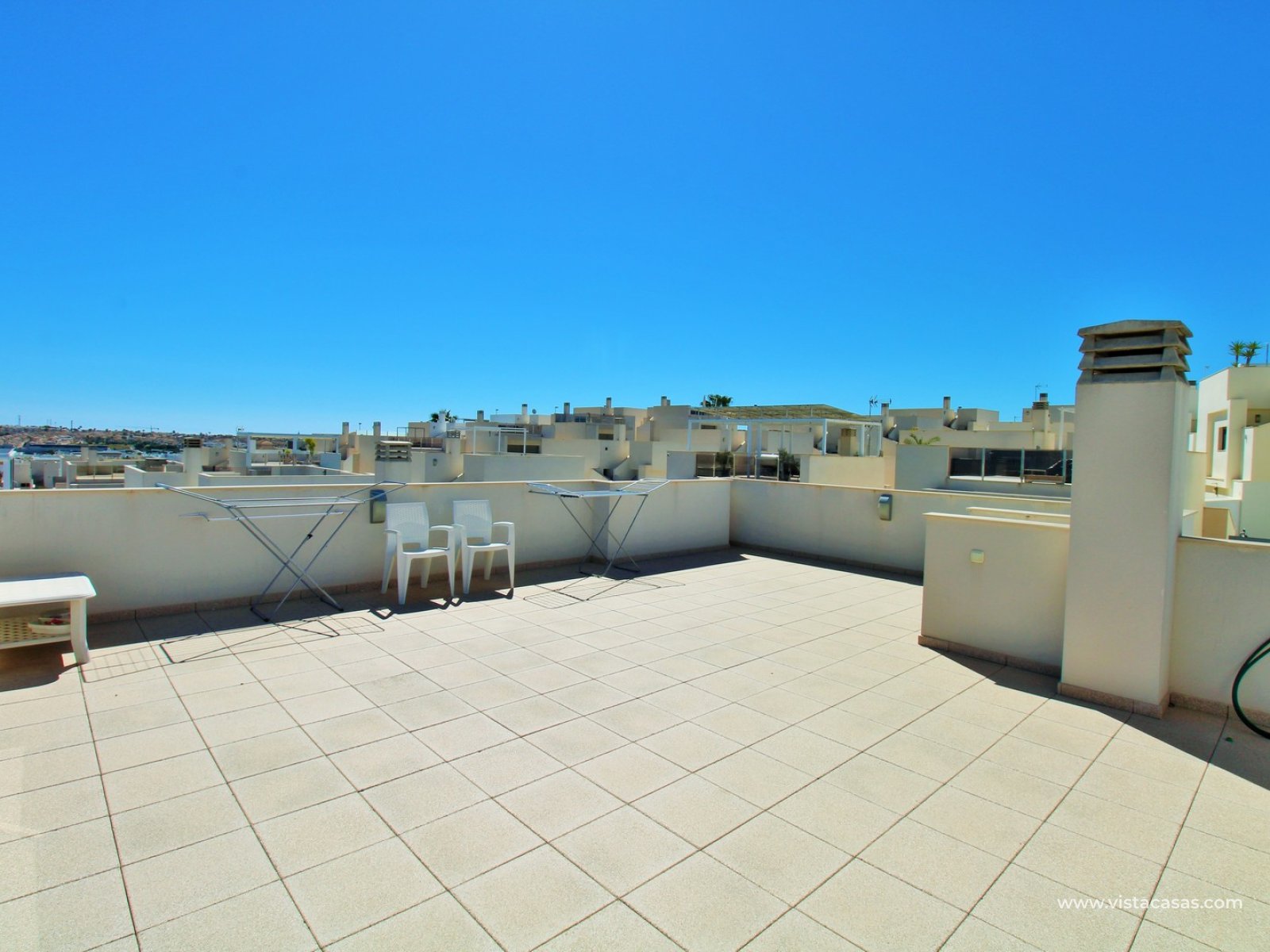 Upstairs, there are two spacious double bedrooms, both offering en-suite bathrooms with walk-in showers and access to a private balcony. From the landing, you can access the impressive roof solarium, enjoying all-day sunshine and open views towards the Torrevieja salt lakes.