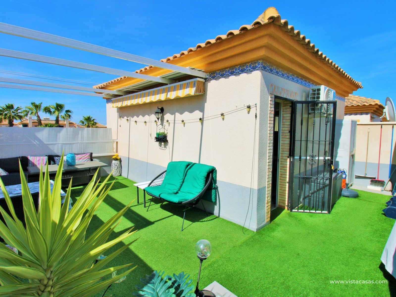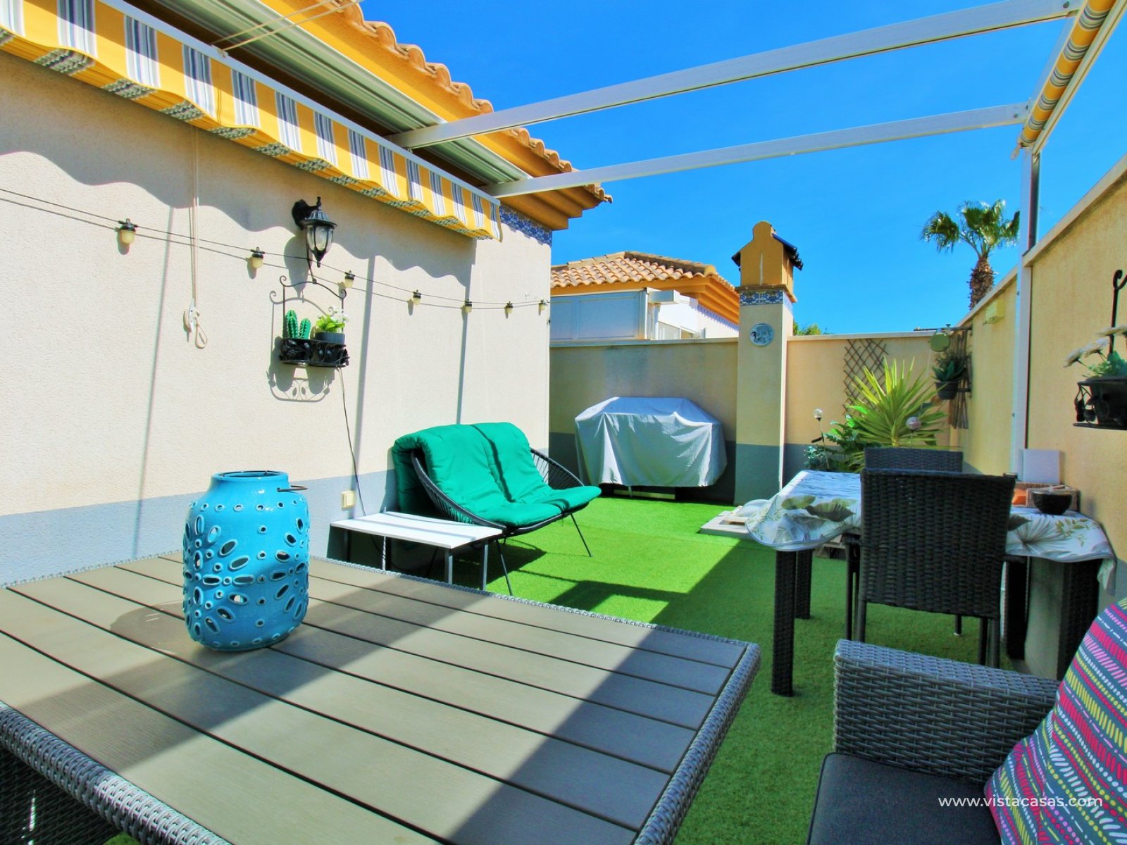 Upstairs, you will find the master bedroom with fitted wardrobes and a second bathroom with walk-in shower. From the landing, there is direct access to the private L-shaped solarium, which has been set up as a cosy outdoor space with seating area, retractable awnings, and artificial grass.