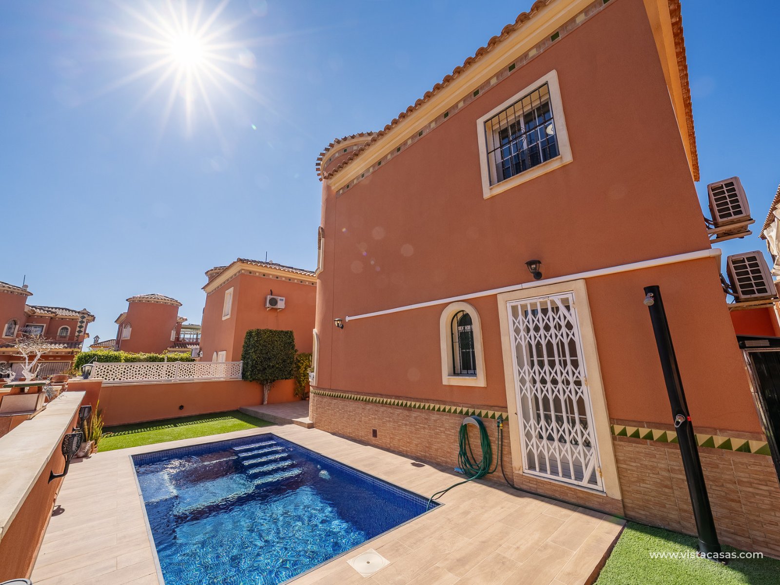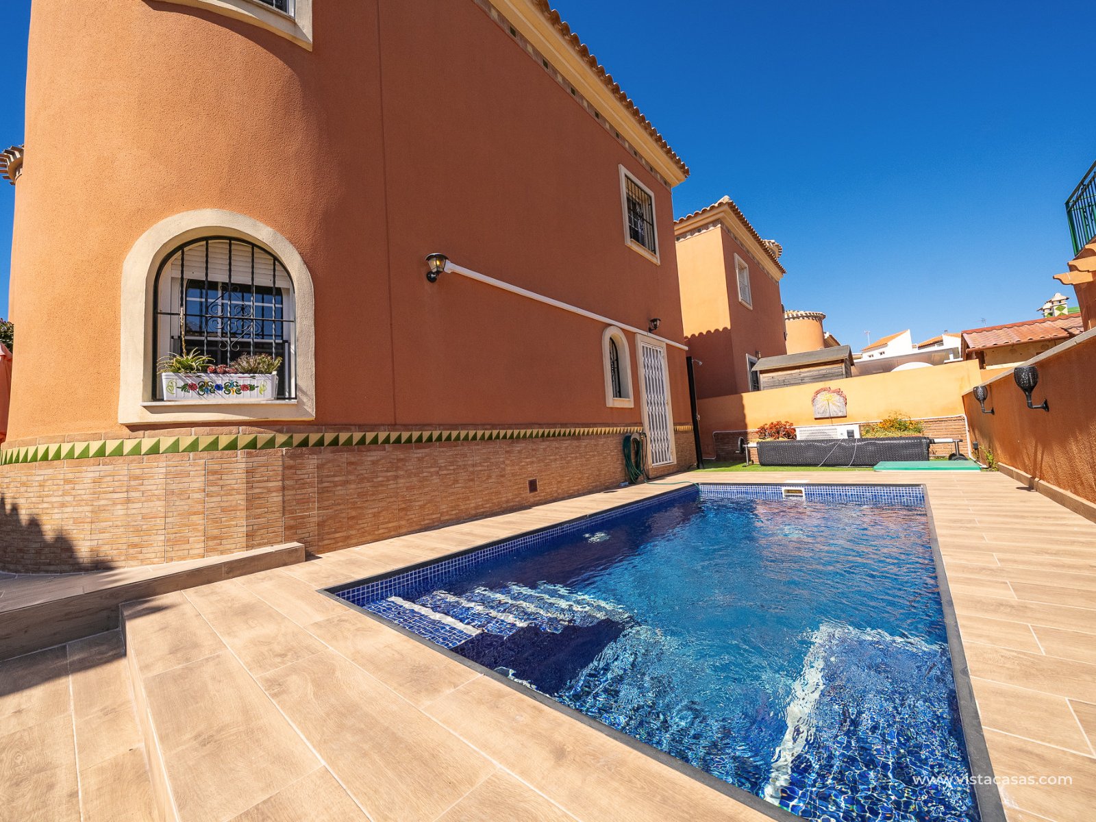 Well presented villa for sale in Playa Flamenca, located on a quiet residential street within walking distance of local amenities. The villa features a bright open-plan living and dining area with fireplace and air conditioning, along with a separate modern kitchen that has direct access to the pool area. The ground floor includes a double bedroom with fitted wardrobes, air conditioning and an en-suite bathroom with walk-in shower. On the first floor, there are two further double bedrooms, both with fitted wardrobes and air conditioning, as well as a family bathroom with bath and shower. Set on a generous plot, the property offers good outdoor space with terraces and a private swimming pool, providing a practical area for relaxing and outdoor dining, plus room for on site parking. An upper-level terrace provides additional outdoor space. The property is sold fully furnished and is in excellent condition, suitable for permanent living, holiday use or rental investment in a well-established and popular area of the Costa Blanca. Located close to the sports centre of Playa Flamenca, along with the local Saturday street market, local amenities and a 20 minute stroll to both the commercial centre of Playa Flamenca and the La Zenia Boulevard. The Playa Flamenca beach is under 2km and just a few minutes by car. Contact us today to view this well priced home