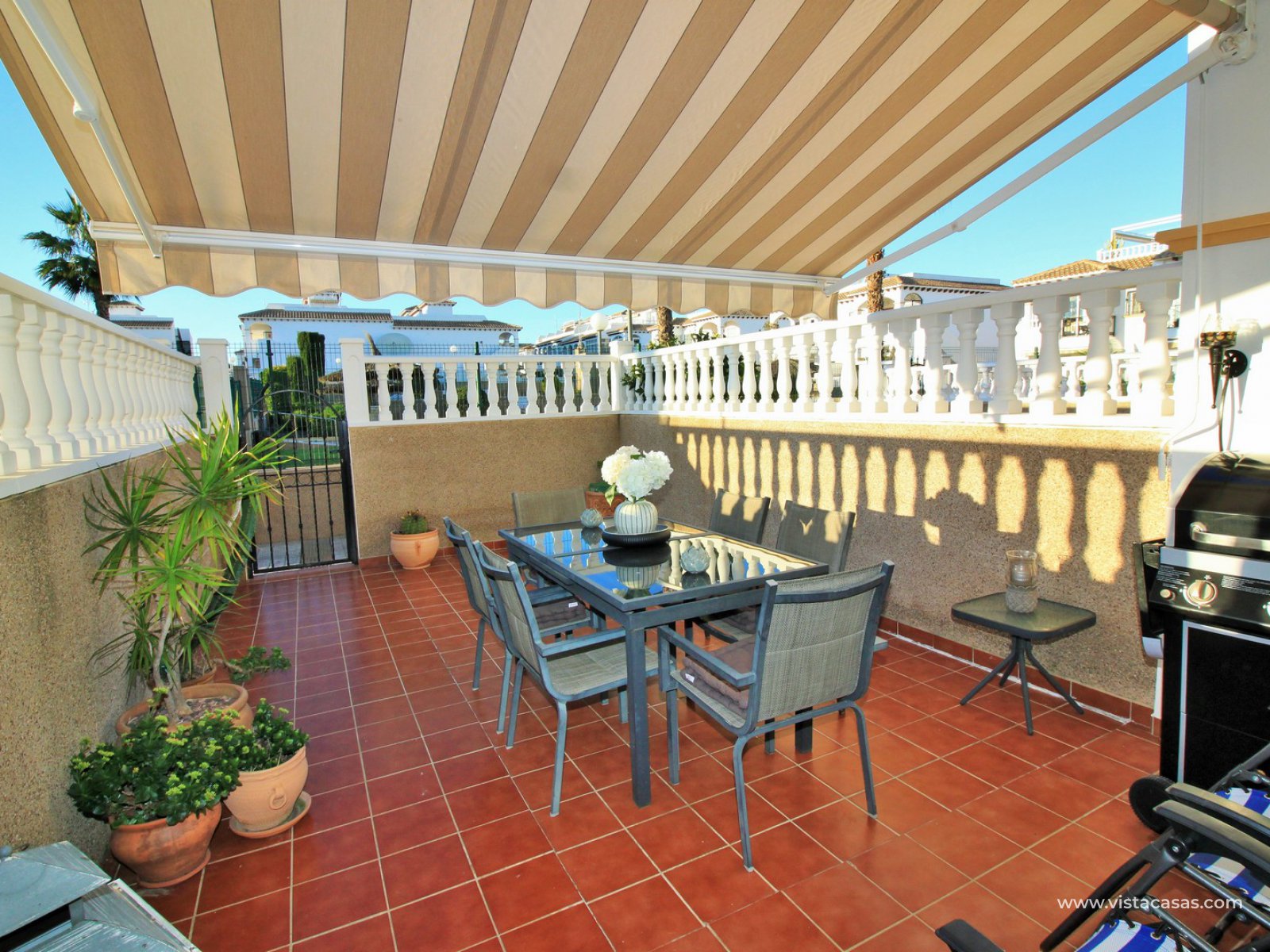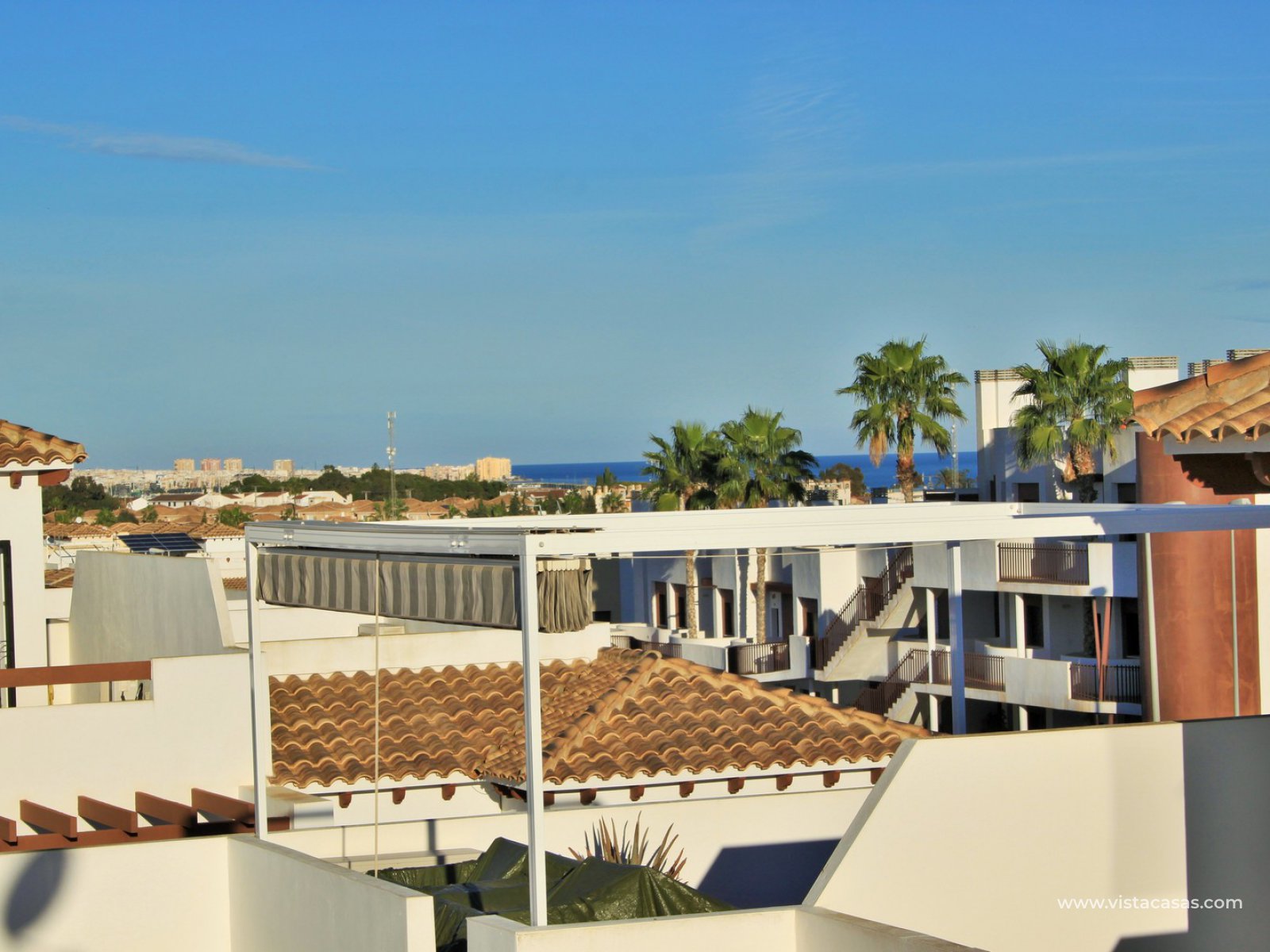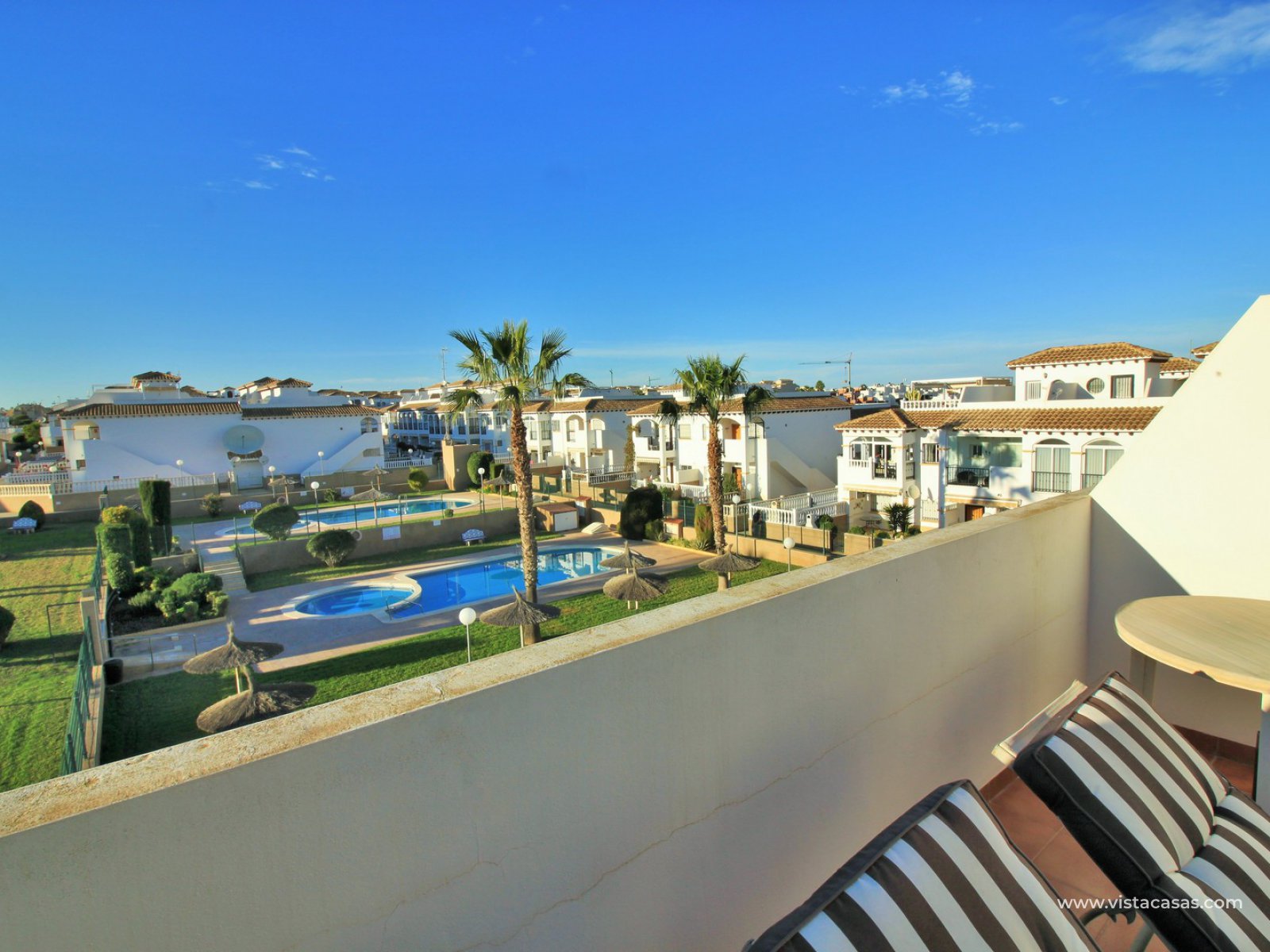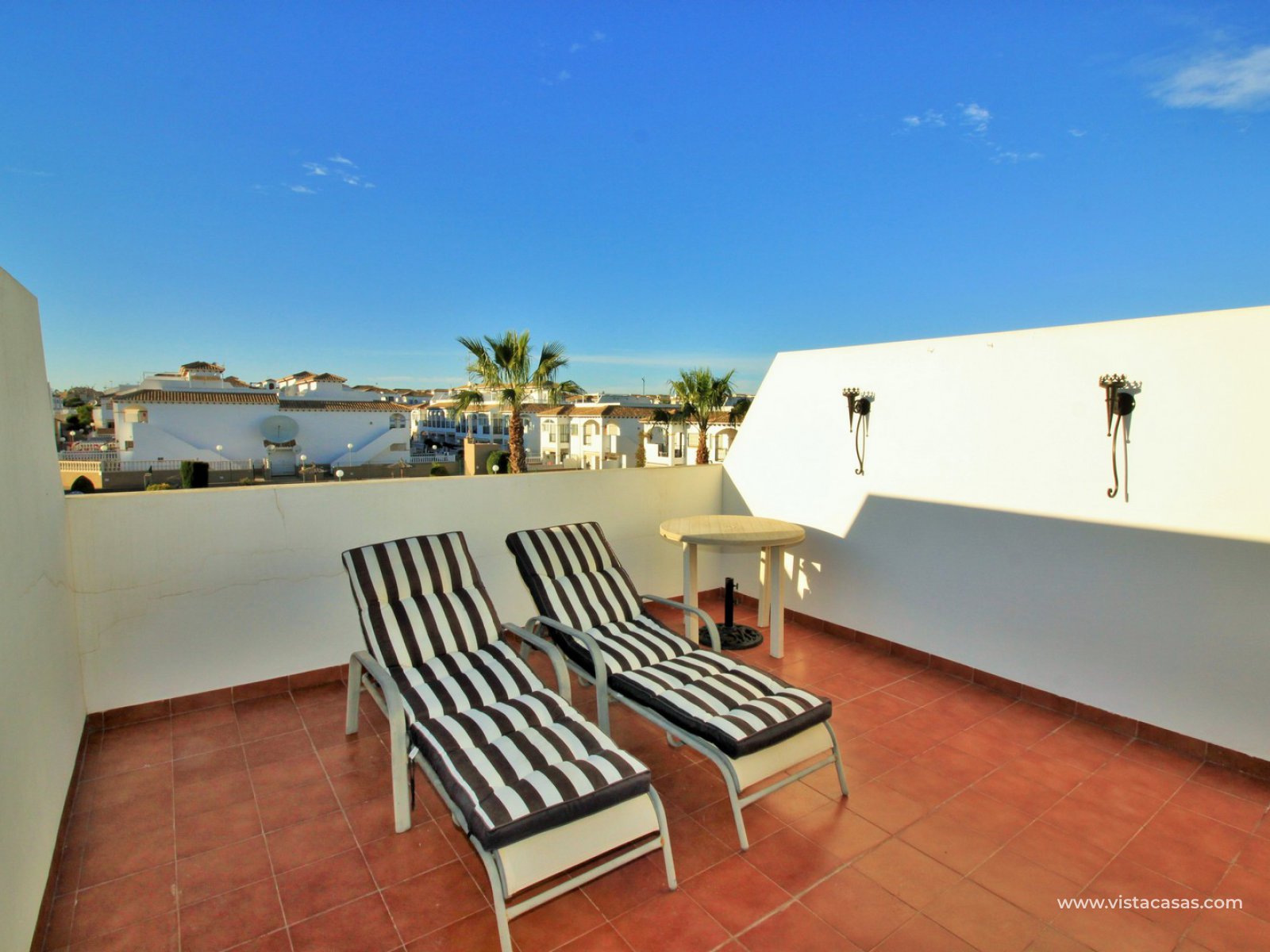 The living accommodation comprises of a lounge-dining area, separate kitchen with outside utility area and a downstairs WC. Upstairs there are 2 bedrooms with fitted wardrobes and a family bathroom. The twin bedroom offers a private balcony which directly overlooks the pools and gardens. Internal stairs from the landing leads up to the wrap around roof solarium, which again offers views towards the pool and garden areas, plus sea views. To the front of the property is a lovely tiled garden area with retractable awning.