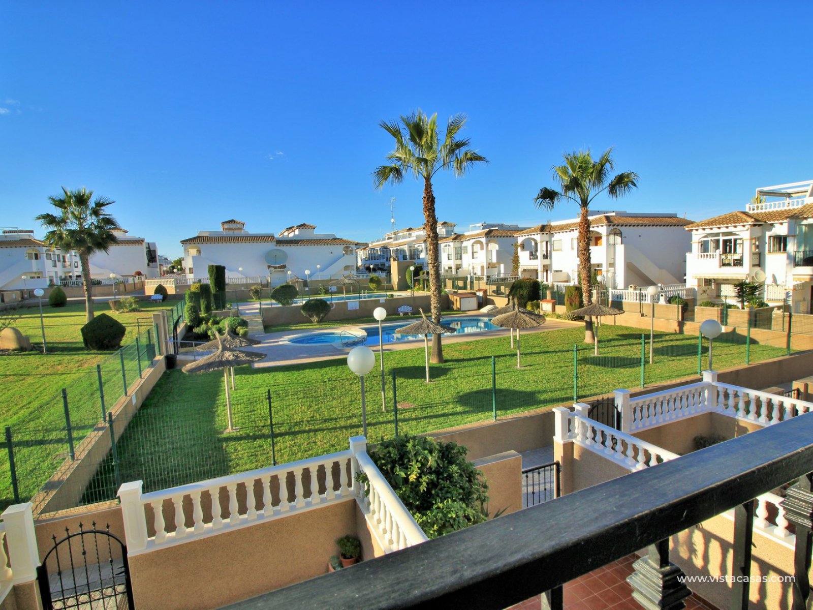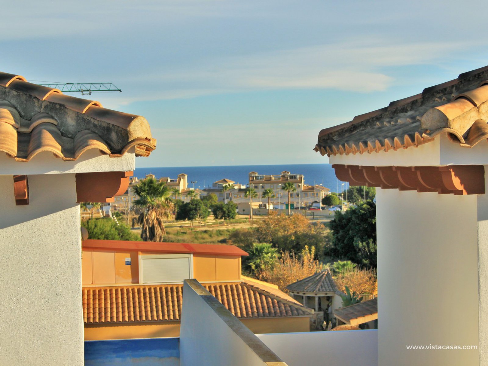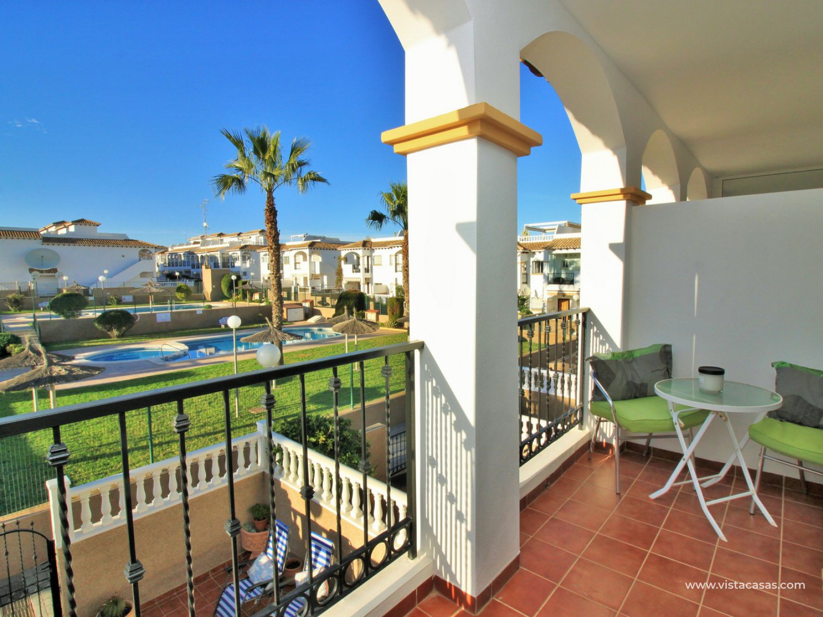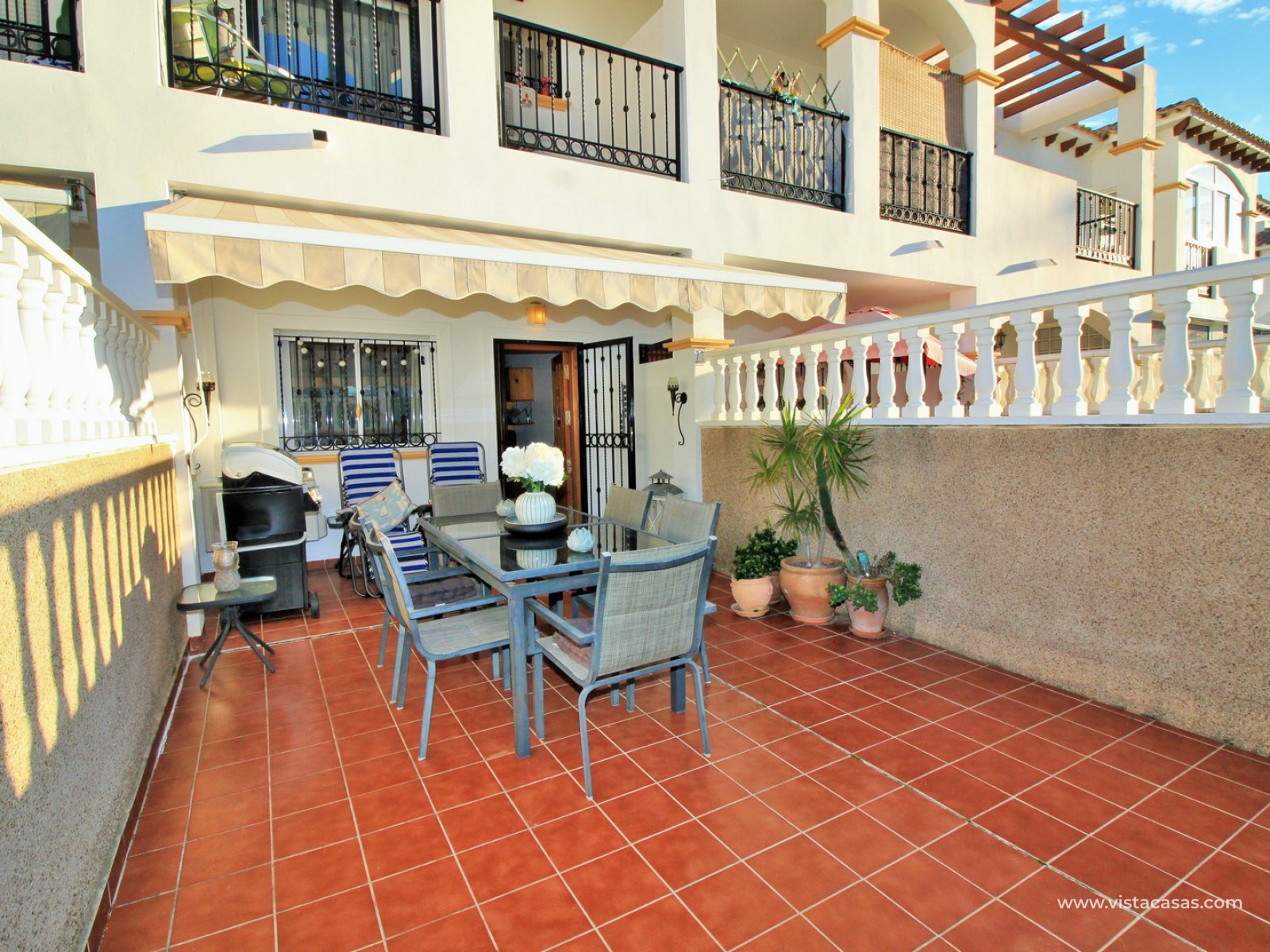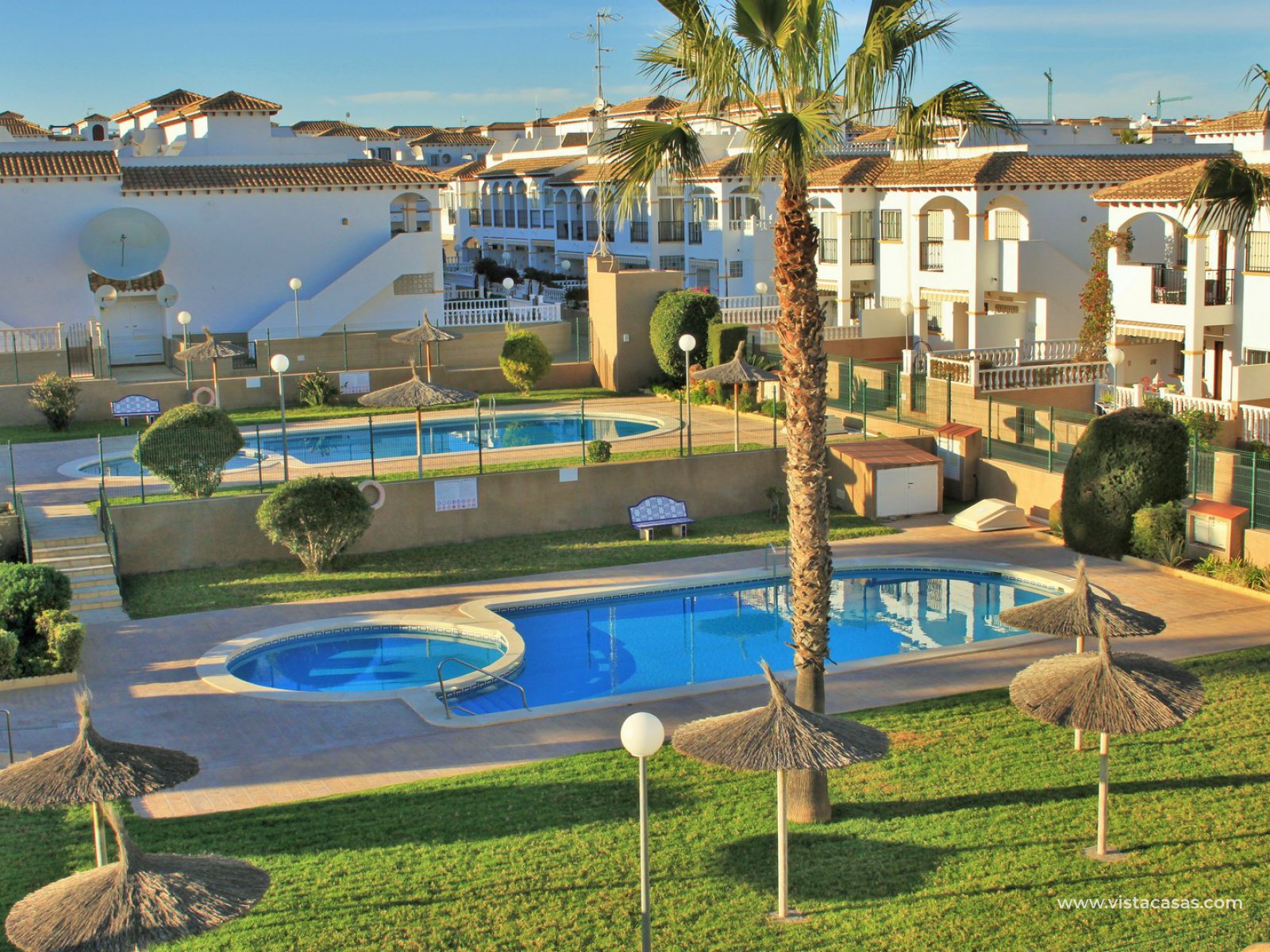 The living accommodation comprises of a lounge-dining area, separate kitchen with outside utility area and a downstairs WC. Upstairs there are 2 bedrooms with fitted wardrobes and a family bathroom. The twin bedroom offers a private balcony which directly overlooks the pools and gardens. Internal stairs from the landing leads up to the wrap around roof solarium, which again offers views towards the pool and garden areas, plus sea views. To the front of the property is a lovely tiled garden area with retractable awning.