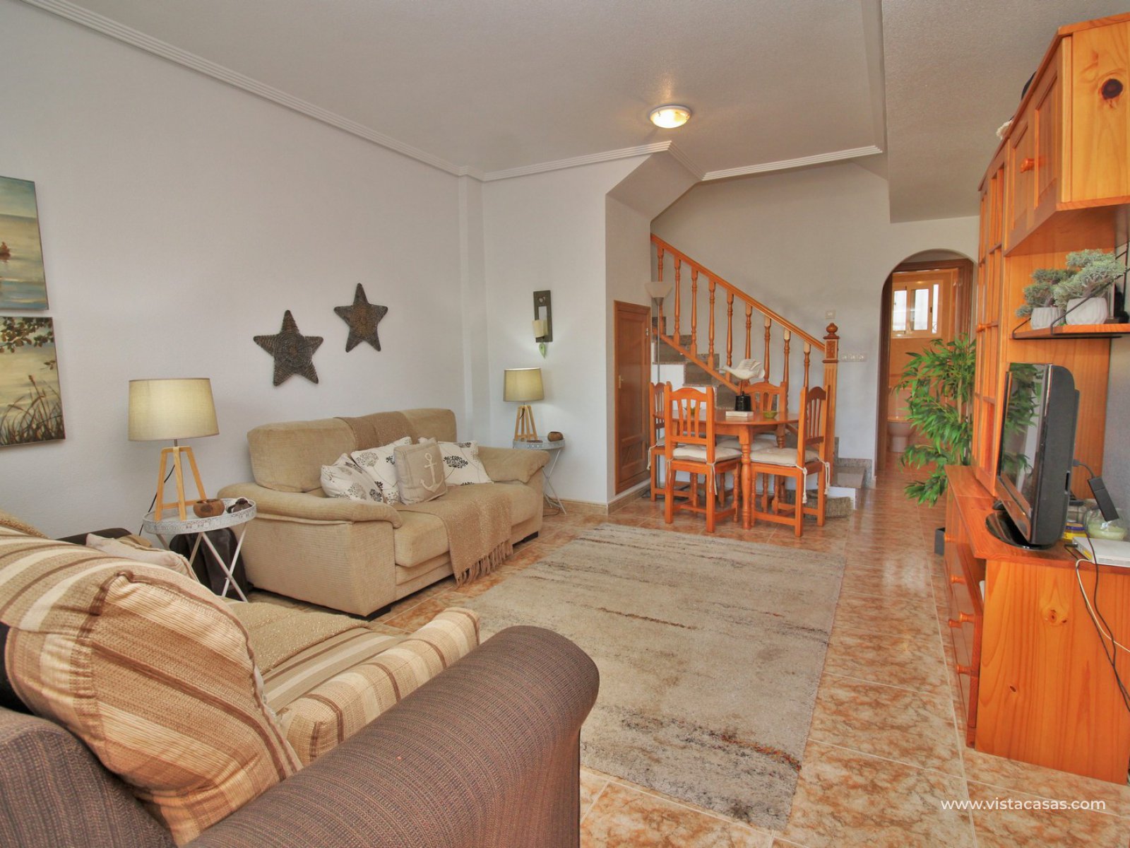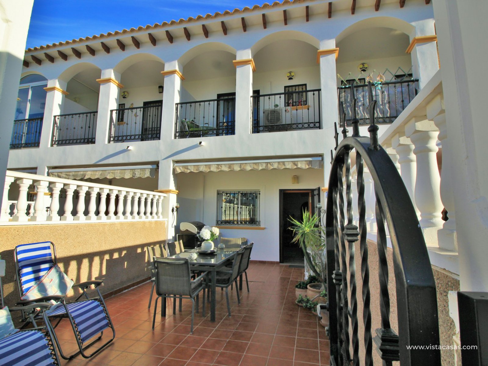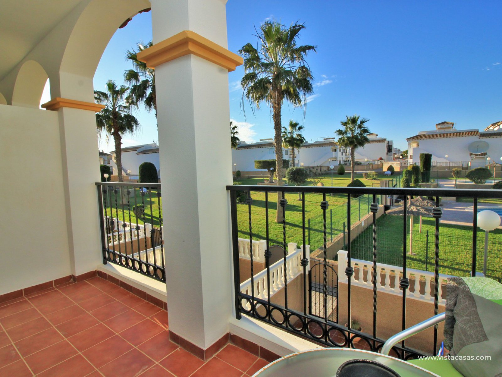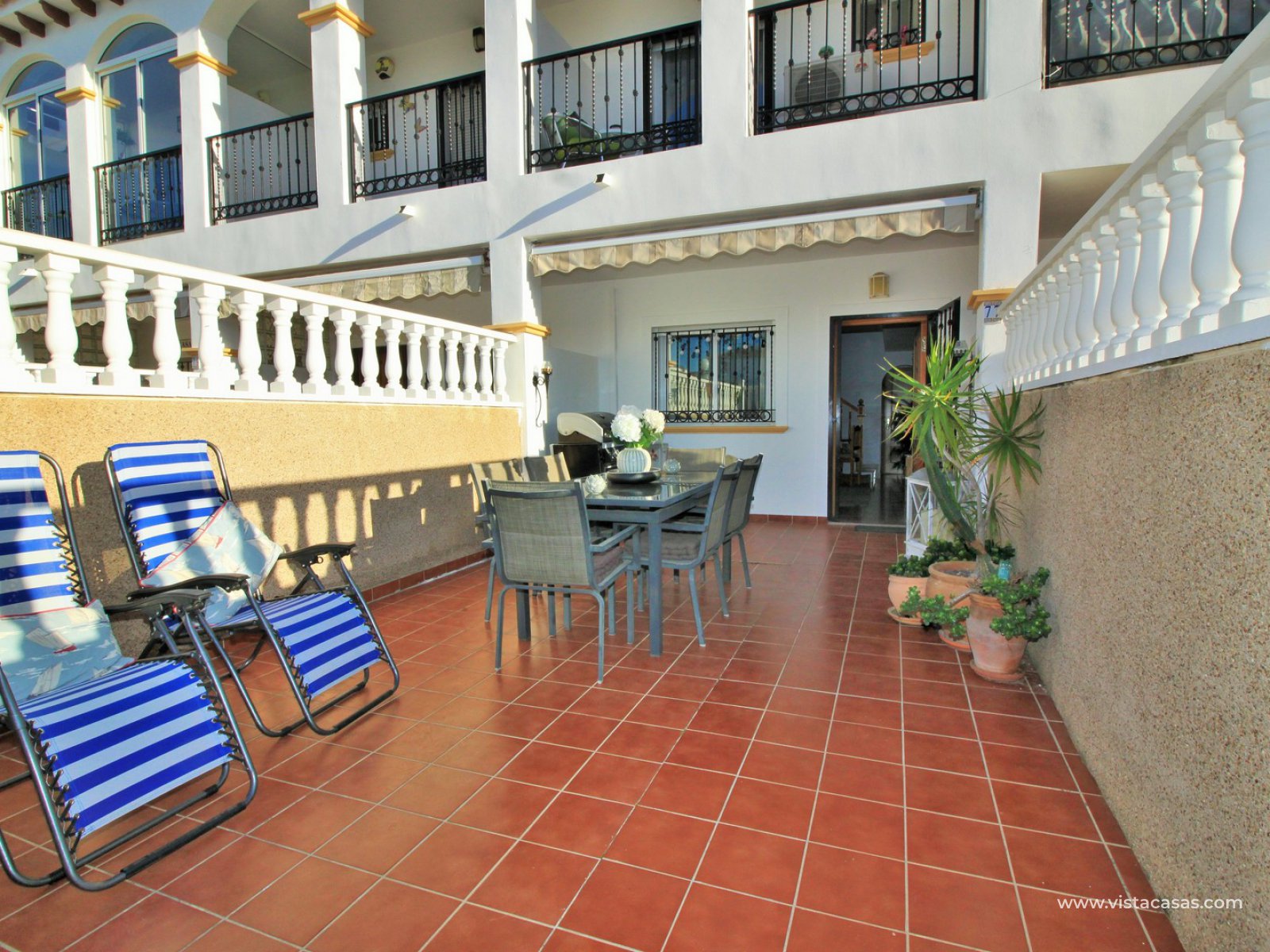 The living accommodation comprises of a lounge-dining area, separate kitchen with outside utility area and a downstairs WC. Upstairs there are 2 bedrooms with fitted wardrobes and a family bathroom. The twin bedroom offers a private balcony which directly overlooks the pools and gardens. Internal stairs from the landing leads up to the wrap around roof solarium, which again offers views towards the pool and garden areas, plus sea views. To the front of the property is a lovely tiled garden area with retractable awning.