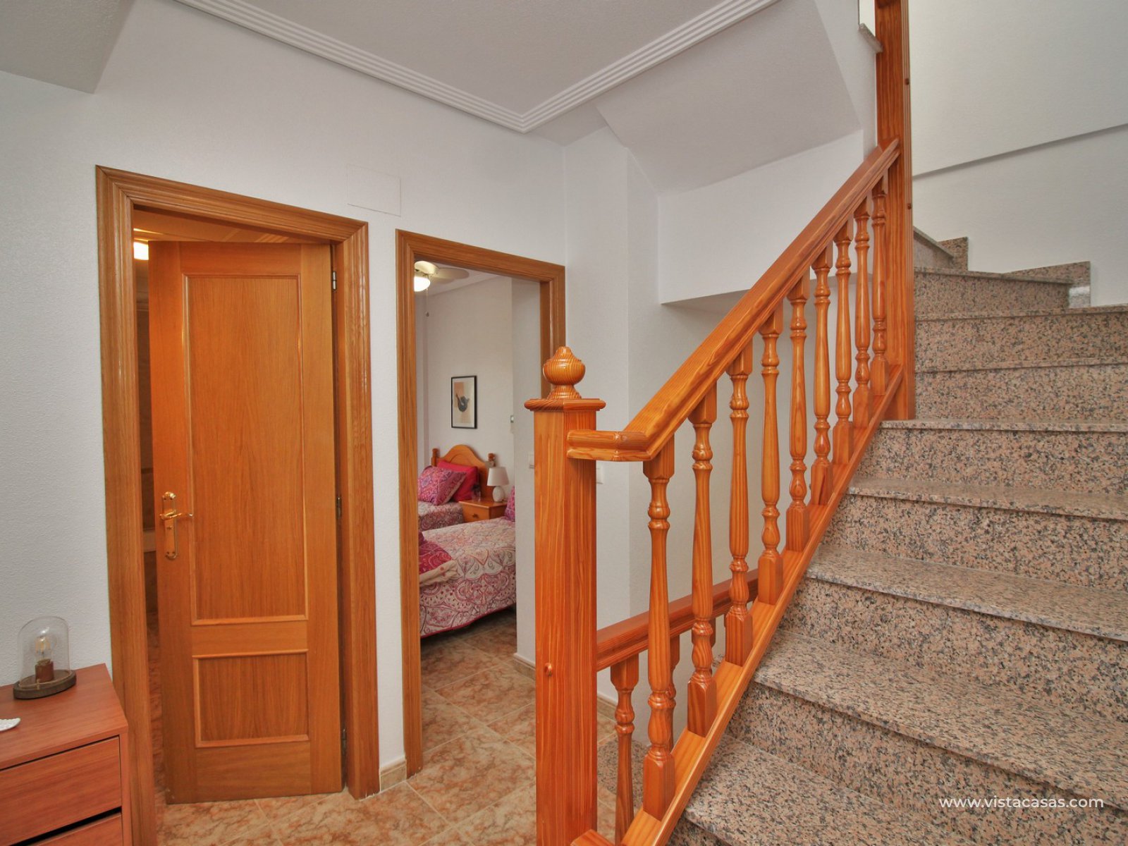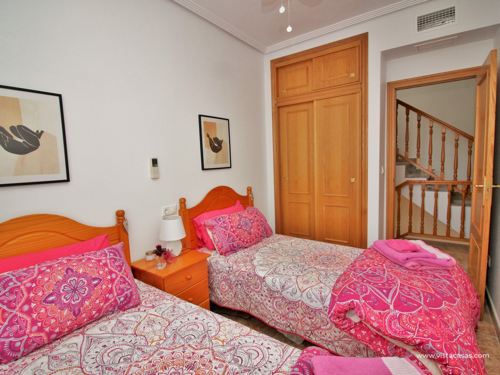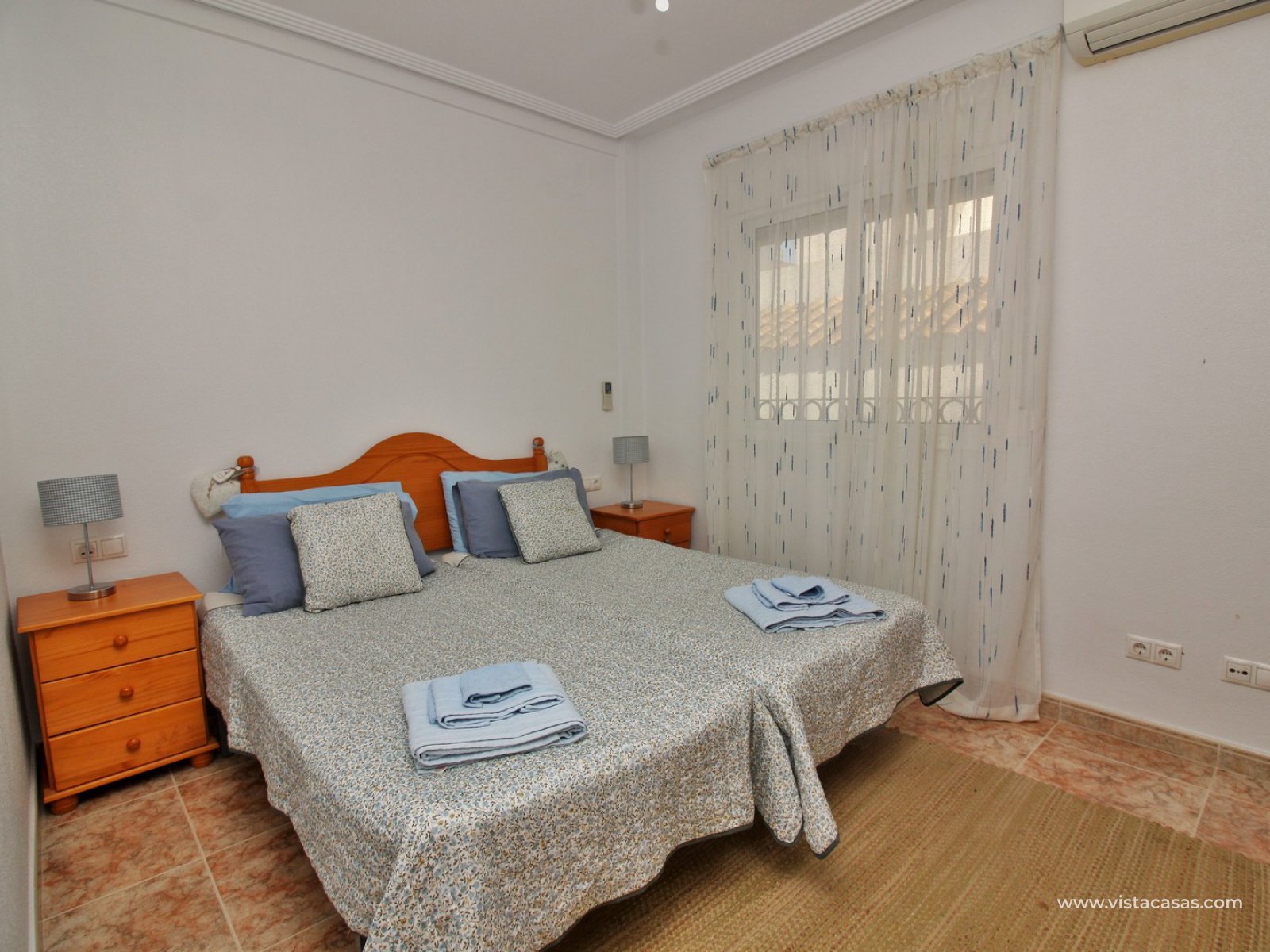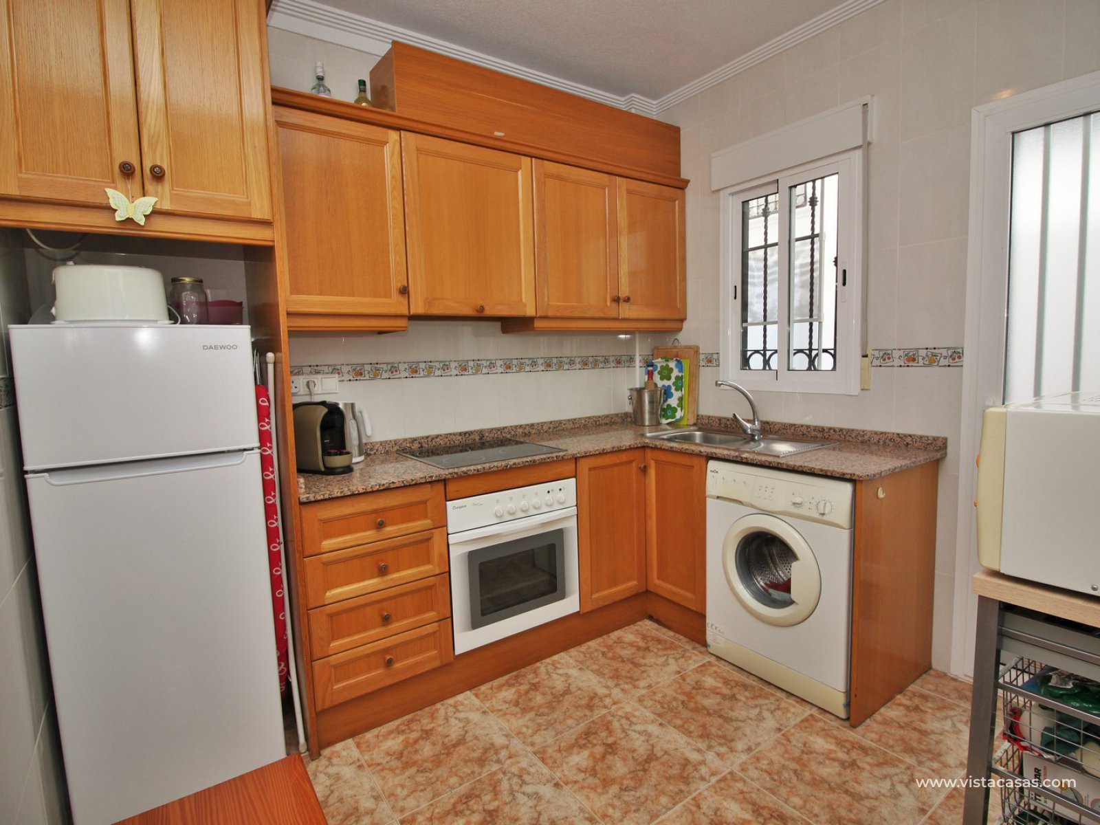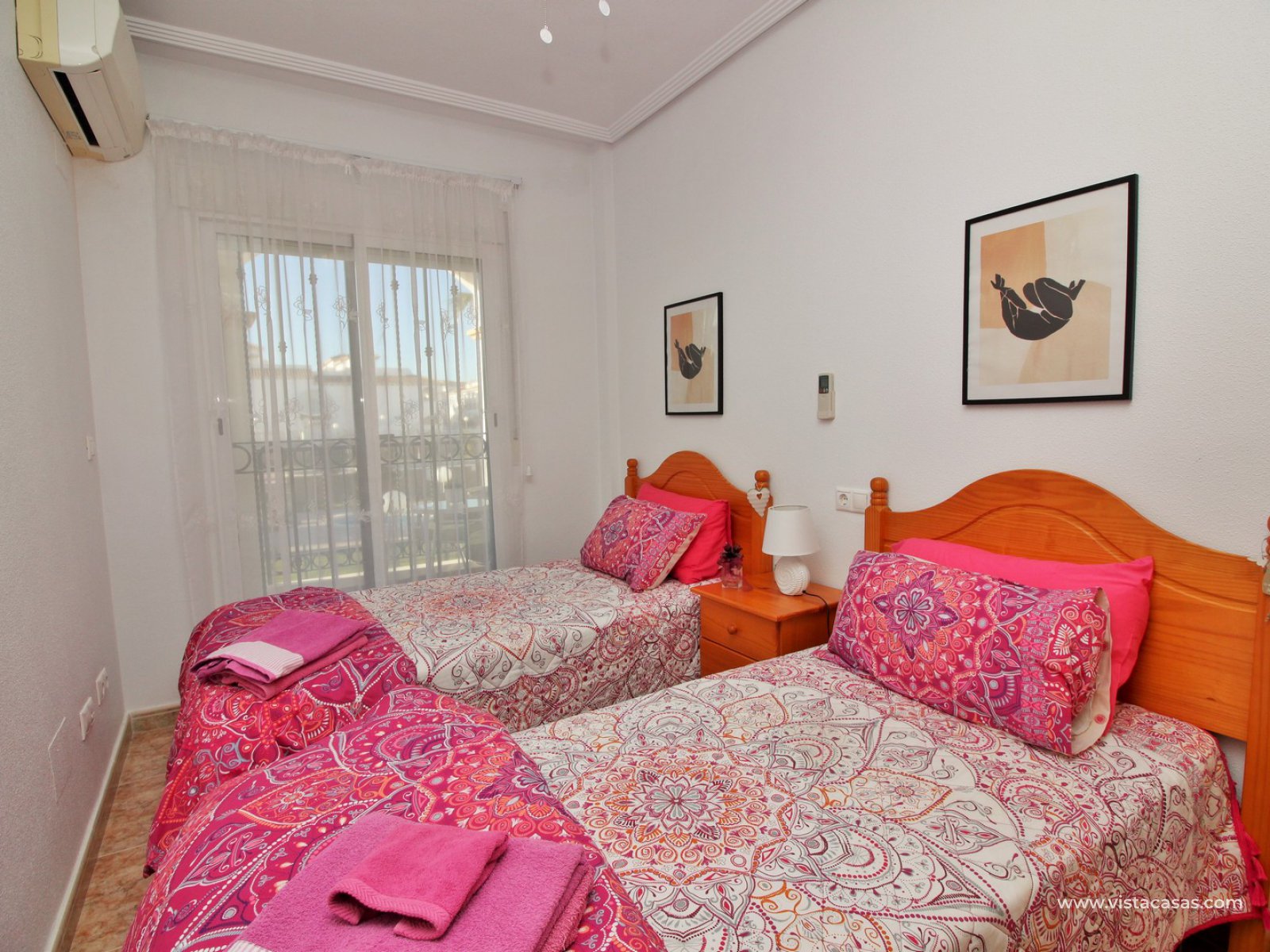 The living accommodation comprises of a lounge-dining area, separate kitchen with outside utility area and a downstairs WC. Upstairs there are 2 bedrooms with fitted wardrobes and a family bathroom. The twin bedroom offers a private balcony which directly overlooks the pools and gardens. Internal stairs from the landing leads up to the wrap around roof solarium, which again offers views towards the pool and garden areas, plus sea views. To the front of the property is a lovely tiled garden area with retractable awning.