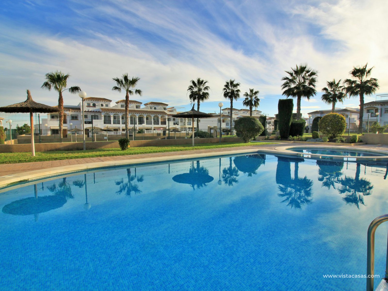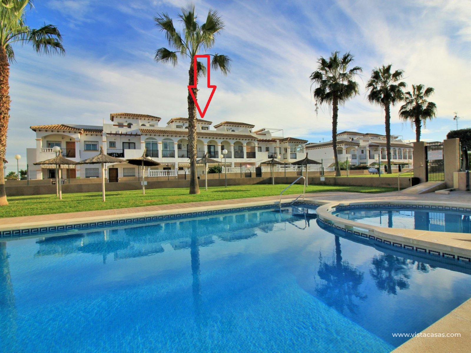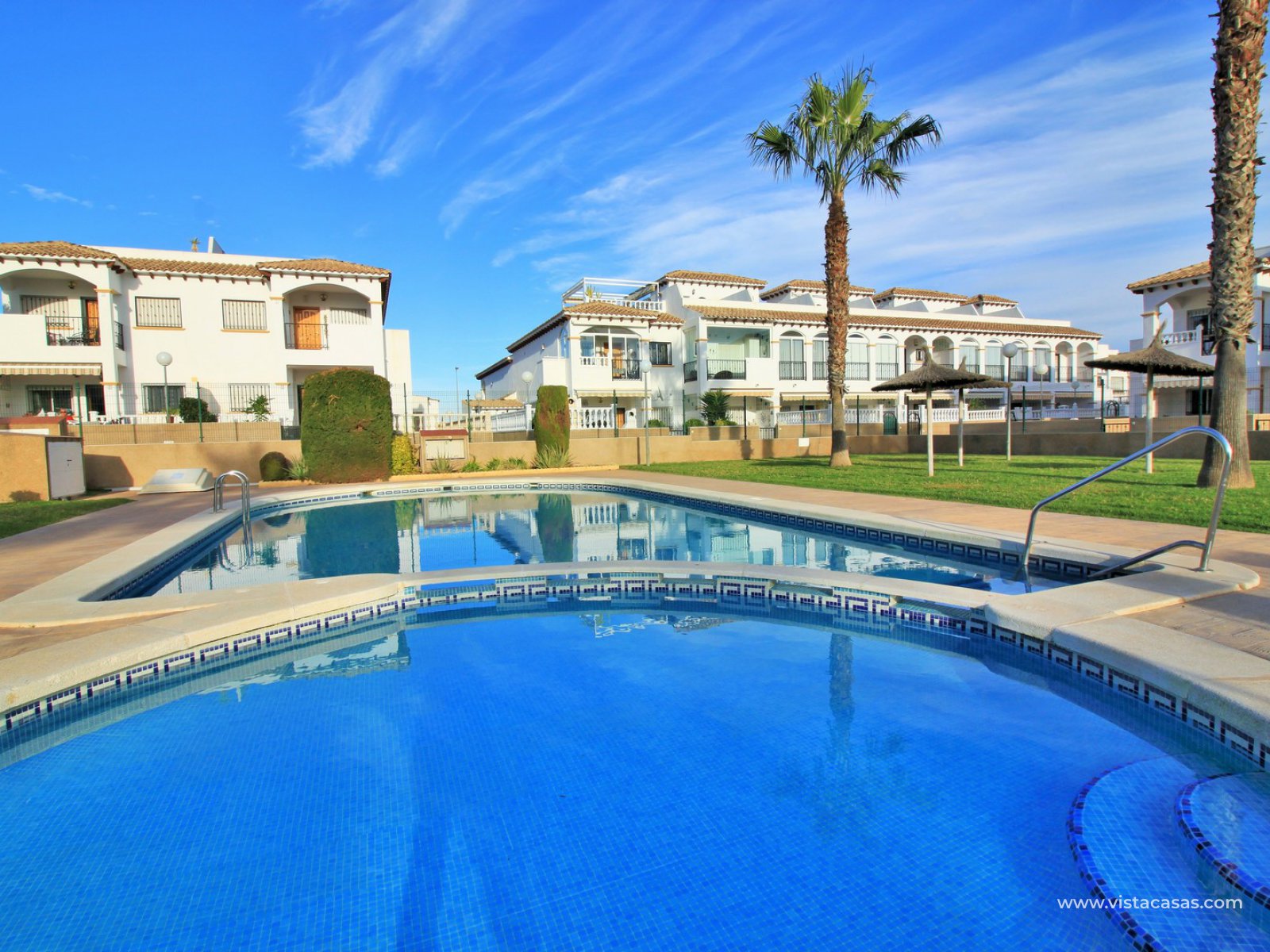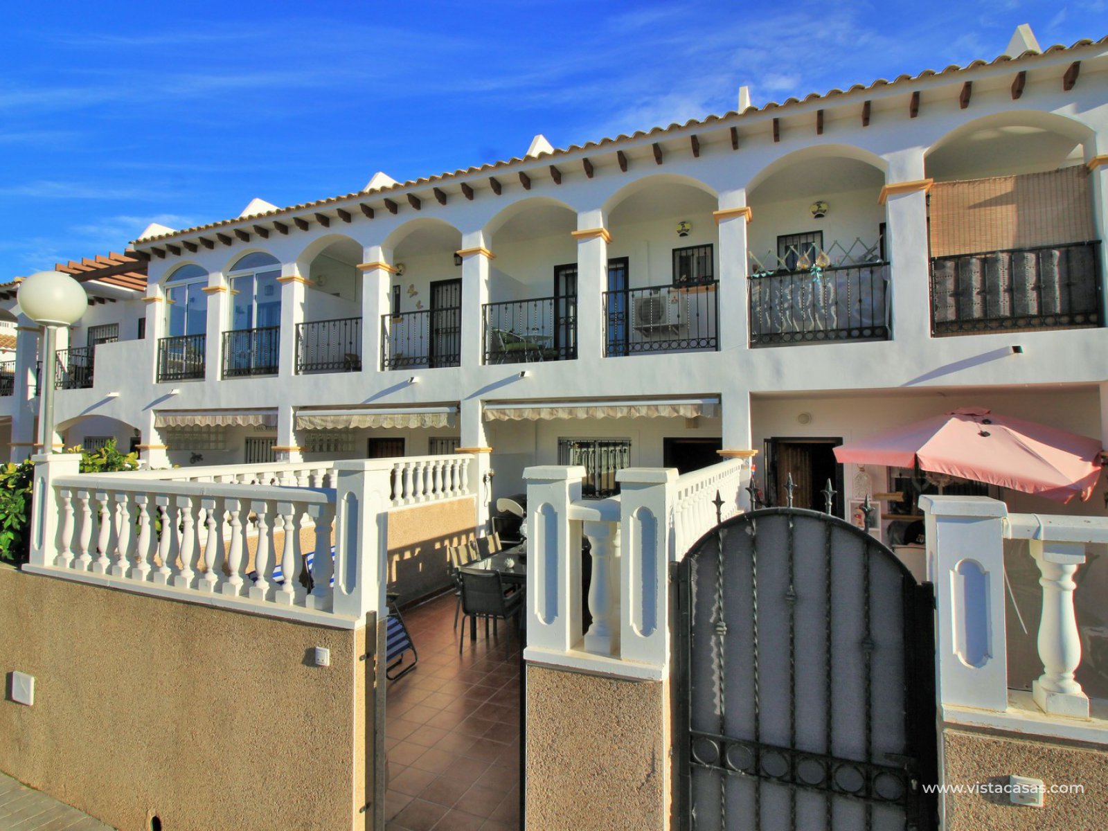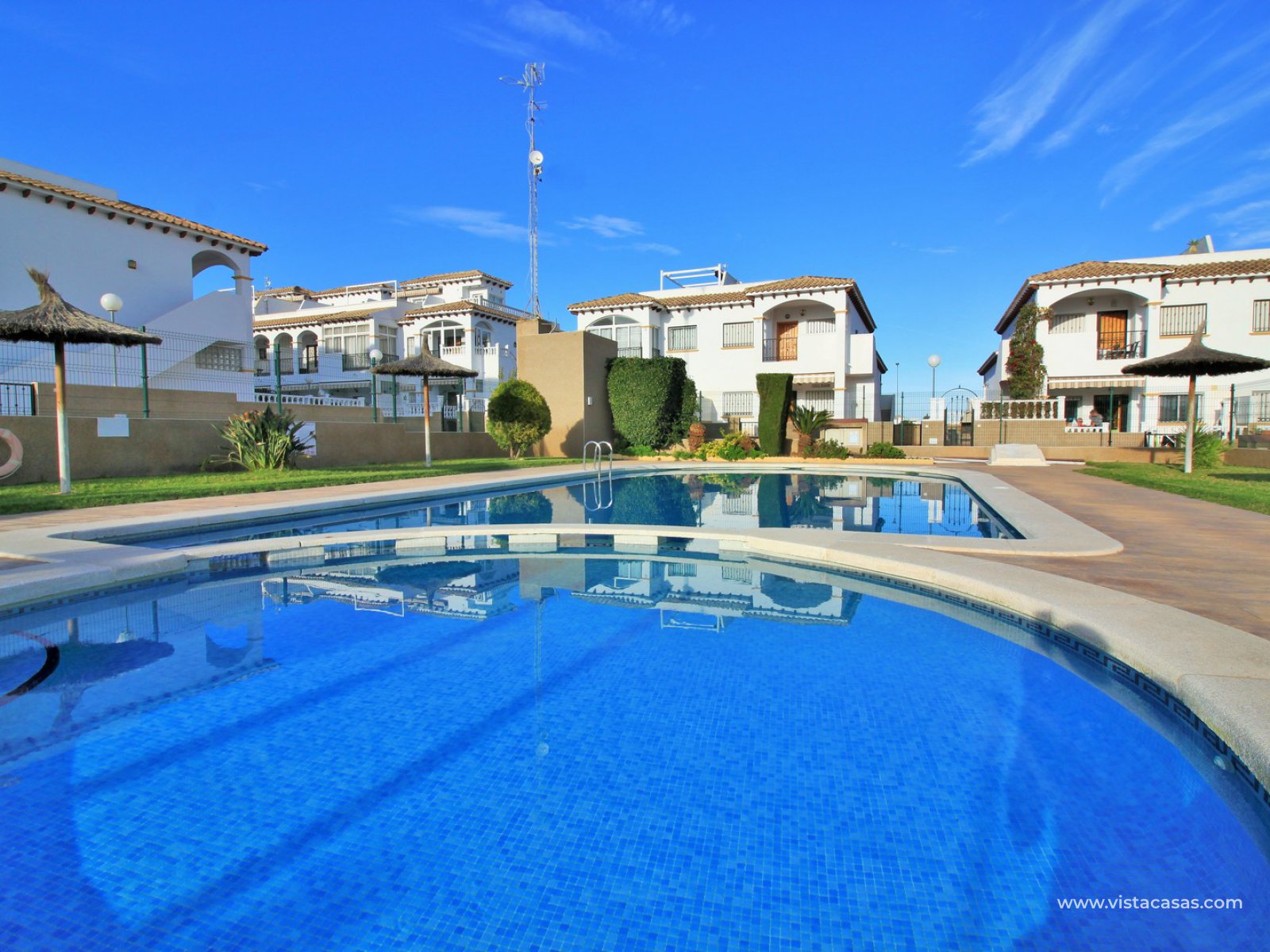 An immaculately presented 2 bedroom townhouse overlooking the pool for sale in R15, La Ciñuelica, Punta Prima. The property is located inside a secure gated community and overlooks the 2 communal pools and beautiful gardens that the community offers. The house is sold fully equipped with furniture, white-goods, air-conditioning, plus a private underground parking space is included in the price!
