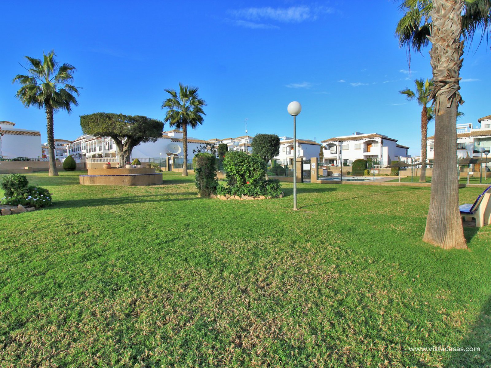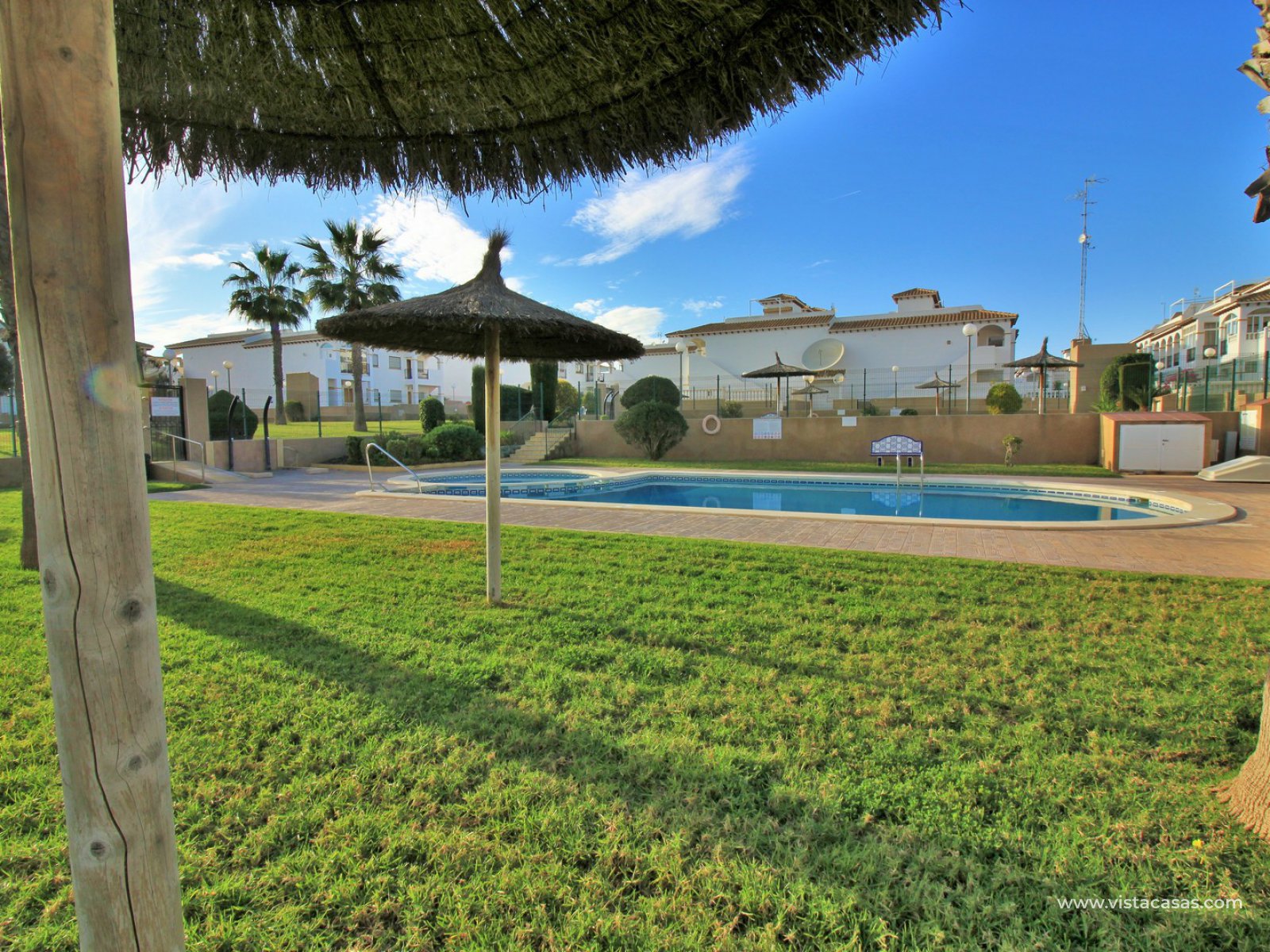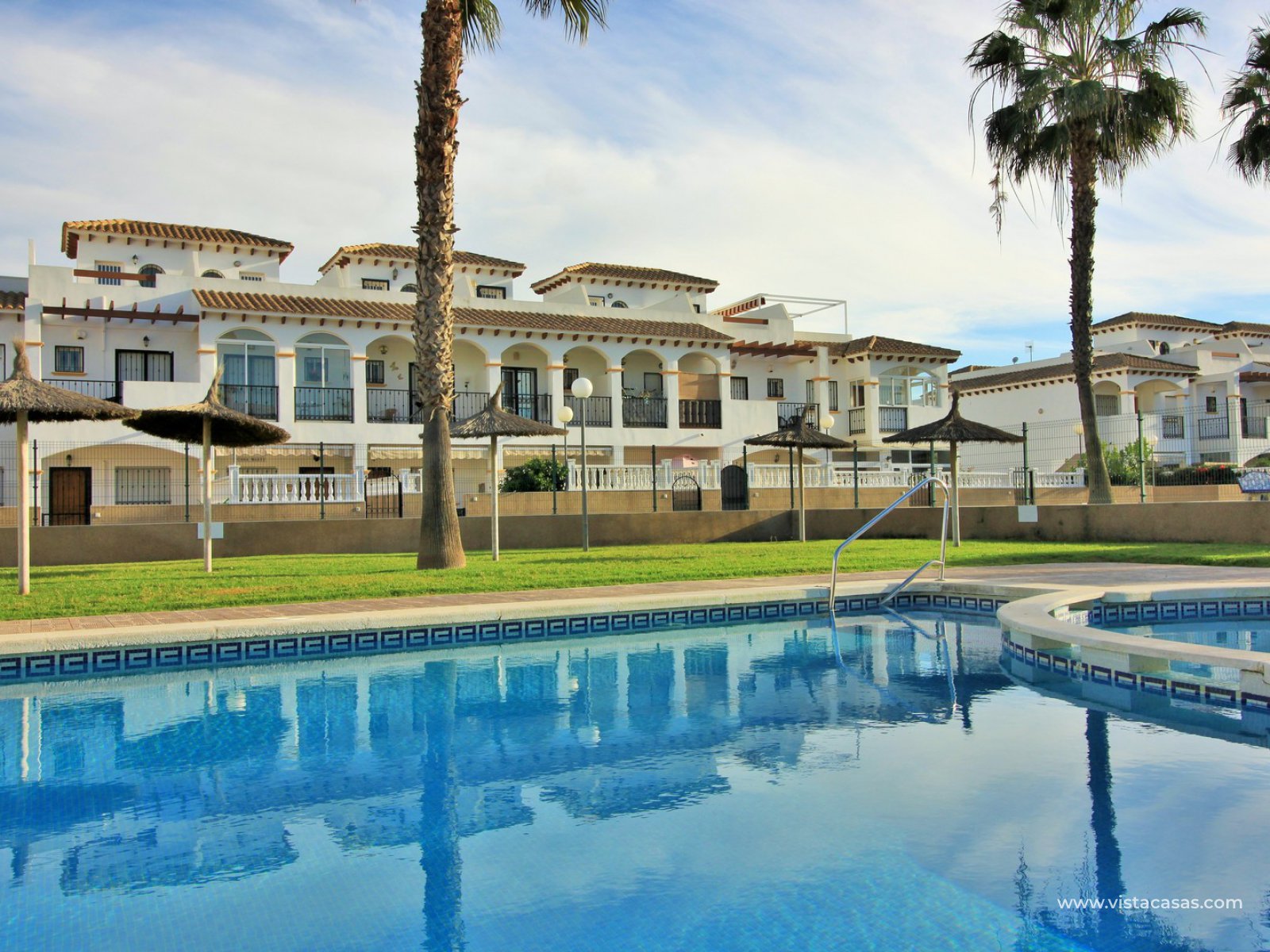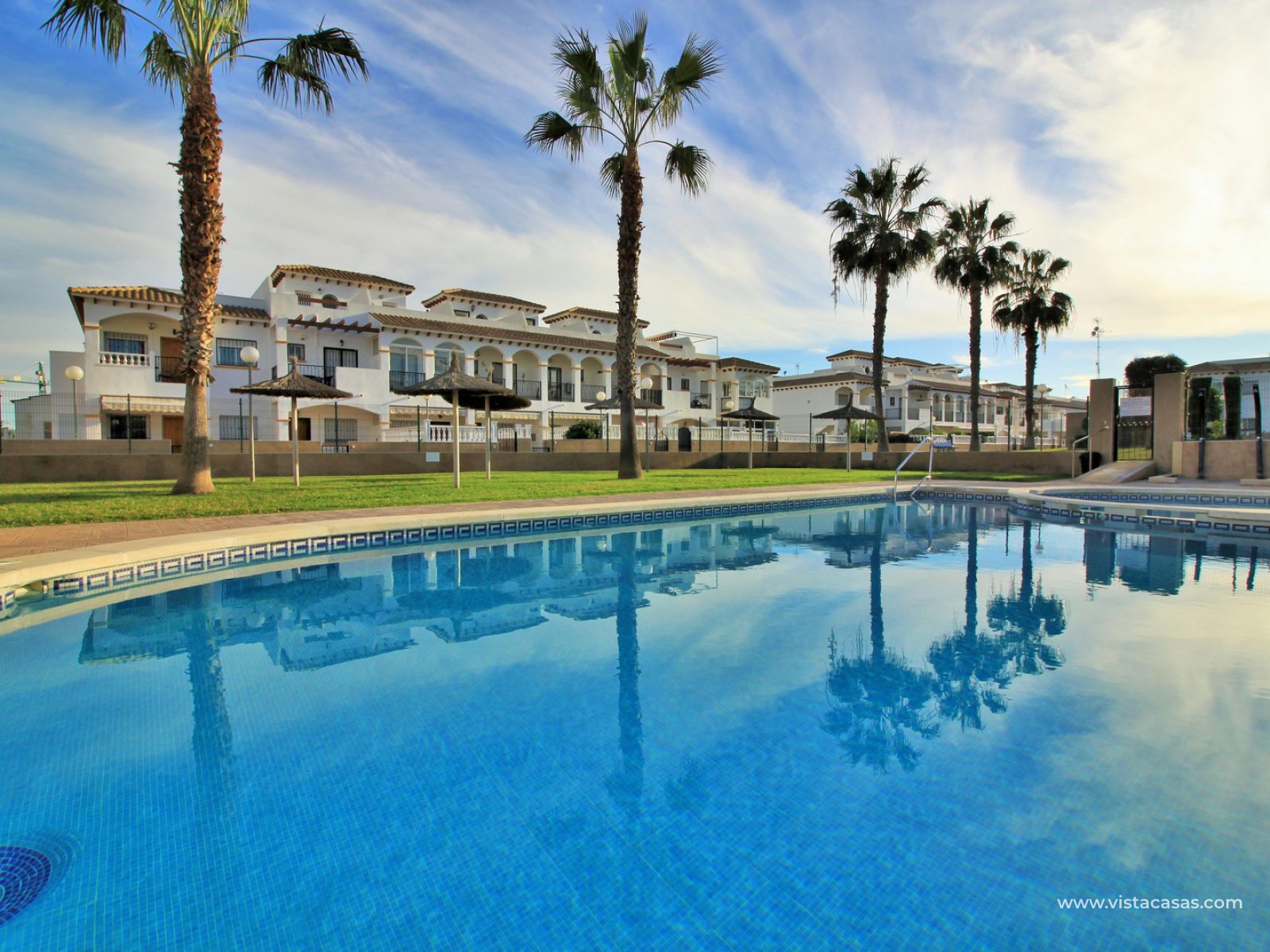 An immaculately presented 2 bedroom townhouse overlooking the pool for sale in R15, La Ciñuelica, Punta Prima. The property is located inside a secure gated community and overlooks the 2 communal pools and beautiful gardens that the community offers. The house is sold fully equipped with furniture, white-goods, air-conditioning, plus a private underground parking space is included in the price!