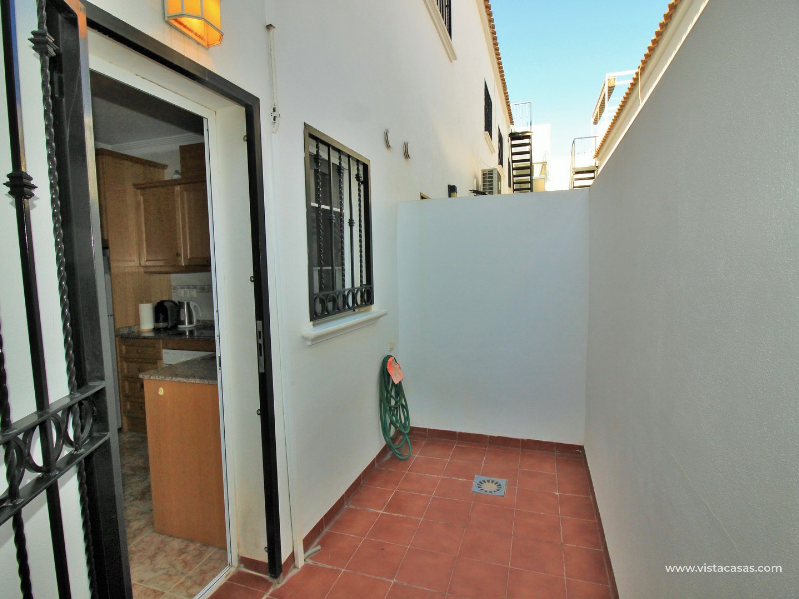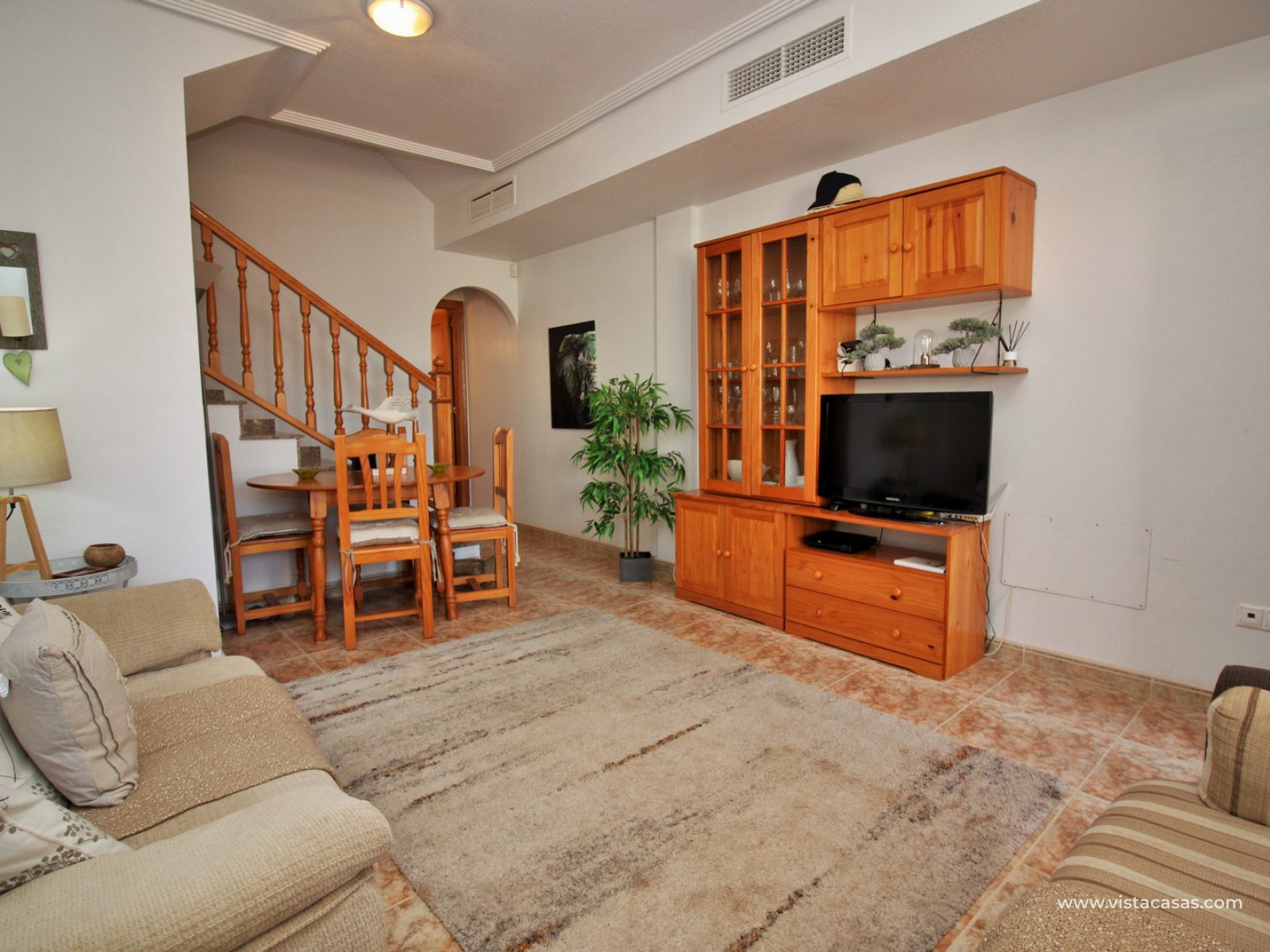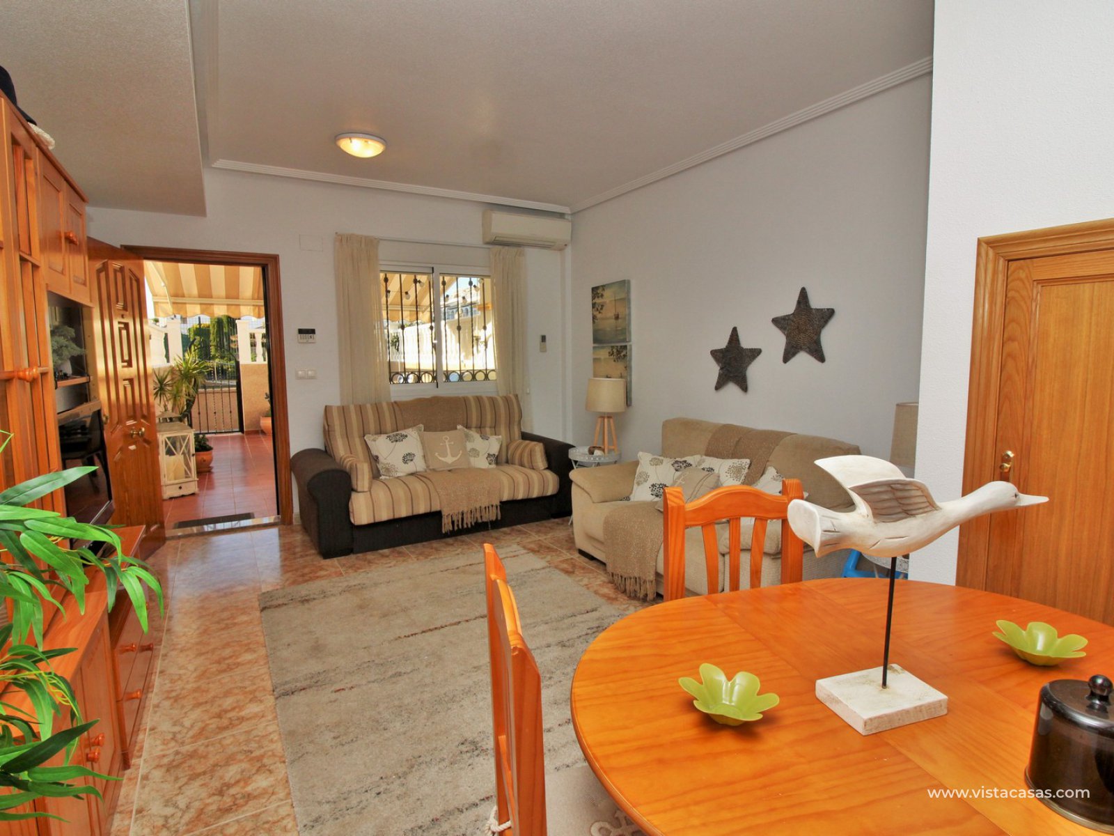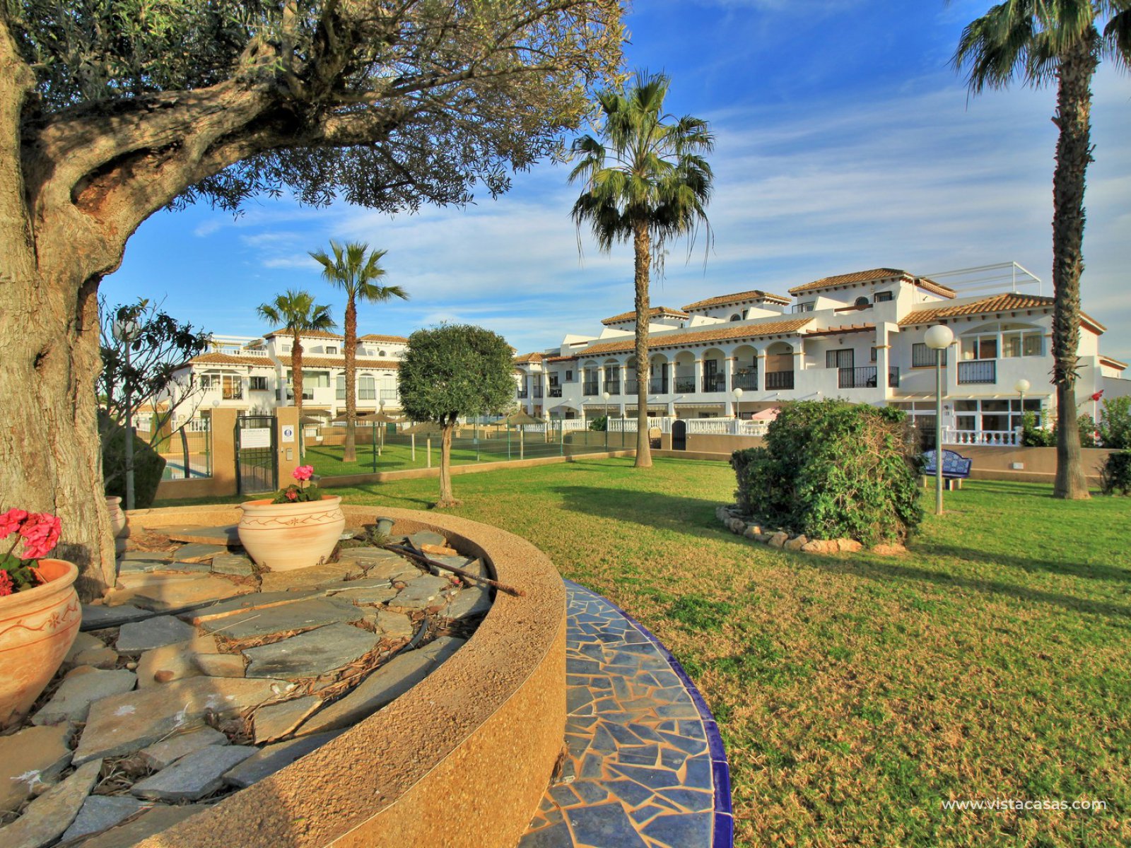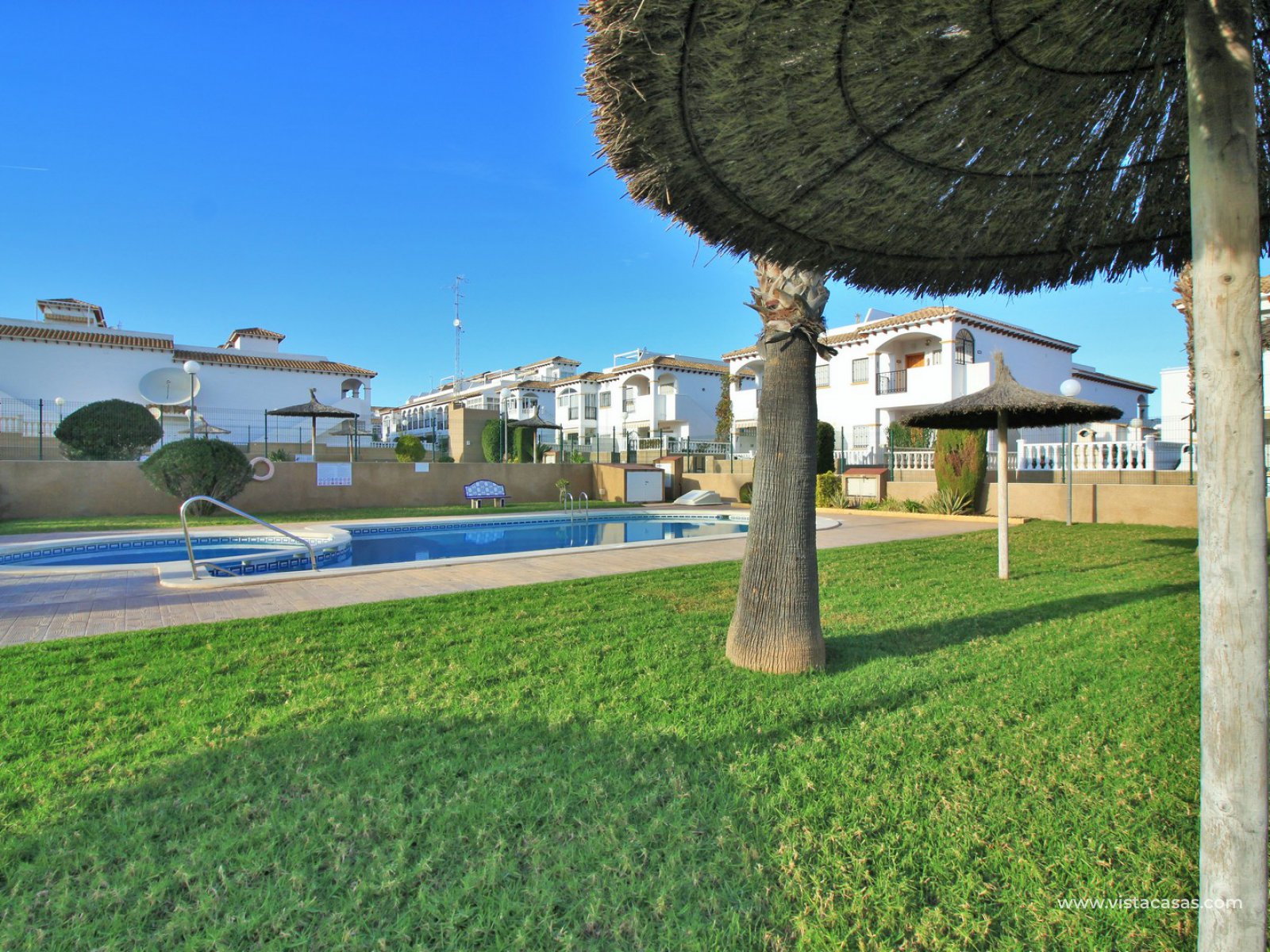 An immaculately presented 2 bedroom townhouse overlooking the pool for sale in R15, La Ciñuelica, Punta Prima. The property is located inside a secure gated community and overlooks the 2 communal pools and beautiful gardens that the community offers. The house is sold fully equipped with furniture, white-goods, air-conditioning, plus a private underground parking space is included in the price!