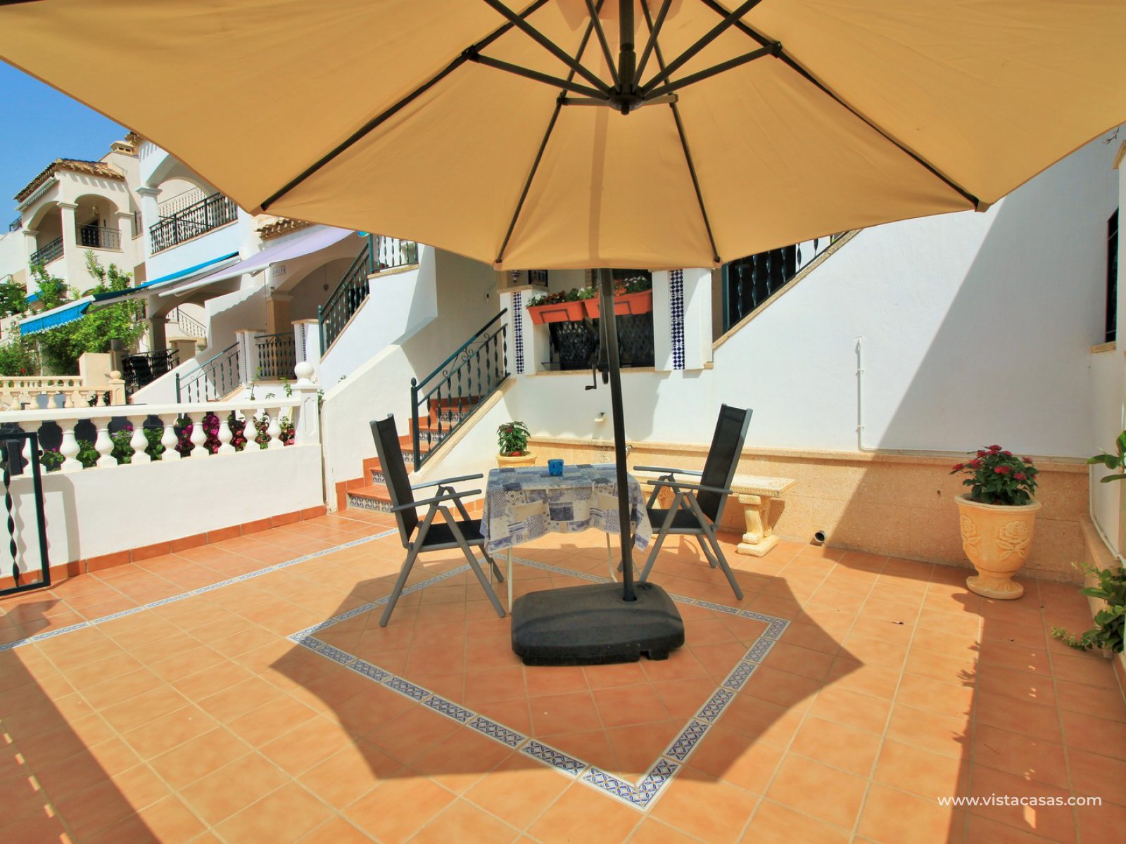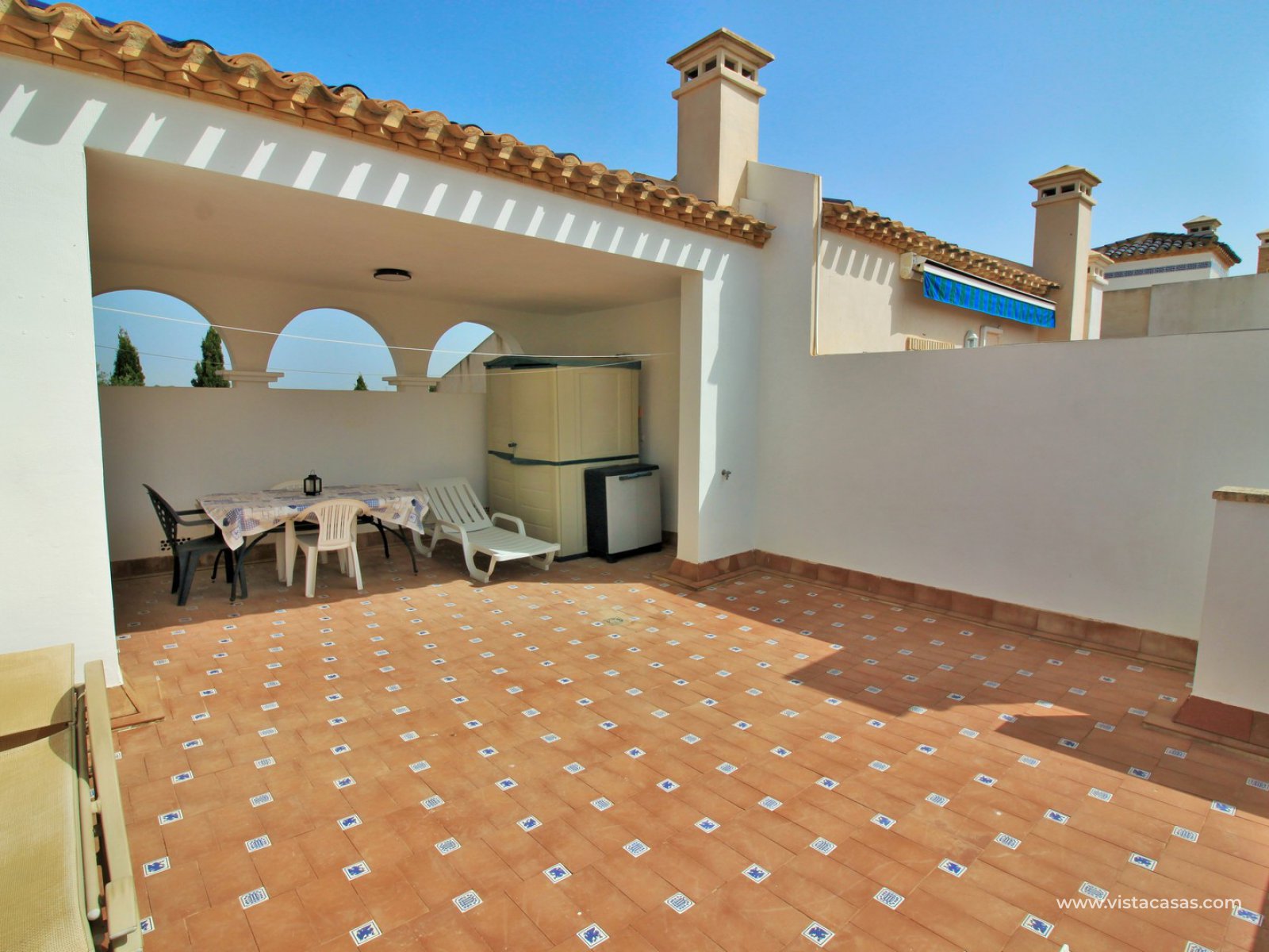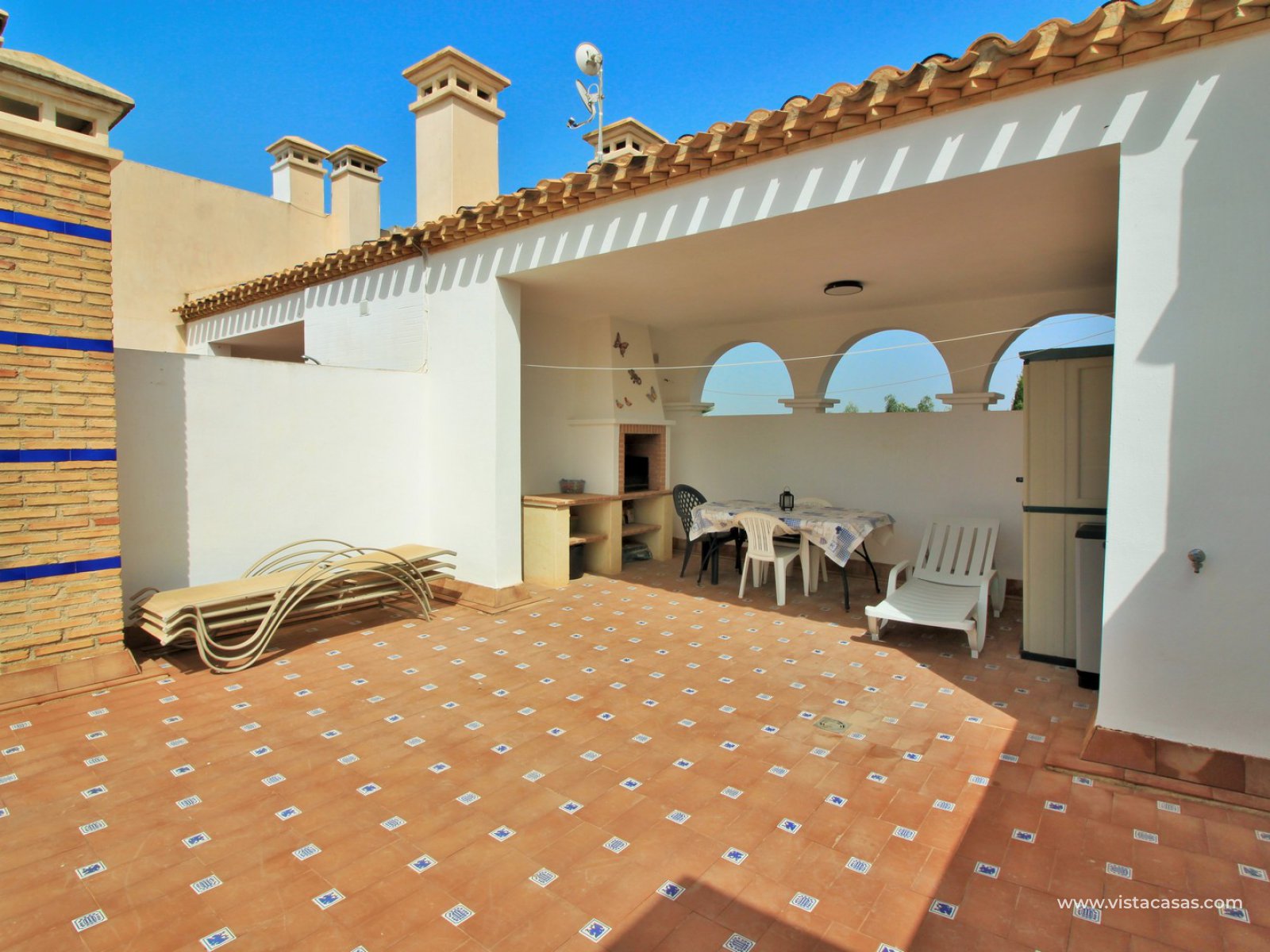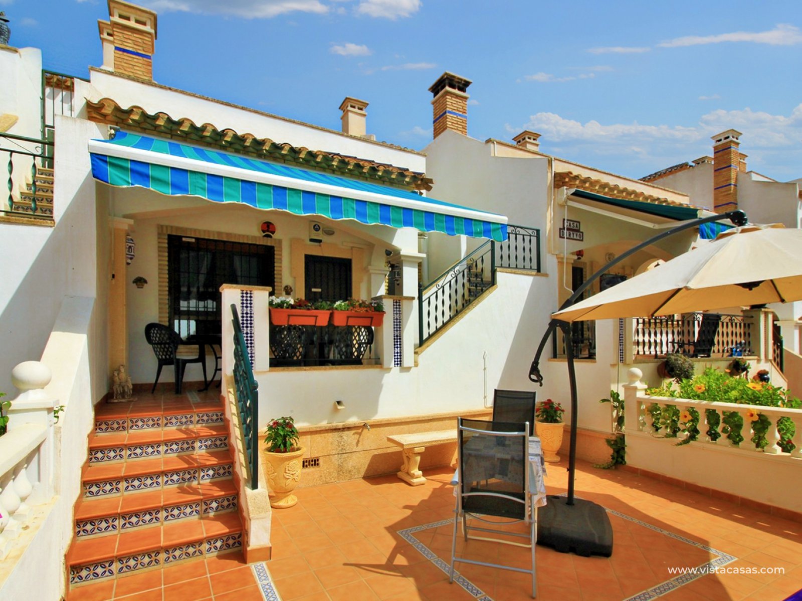 These highly desirable Lola style bungalows are in high demand, so quick viewings are advised! The property has a front and rear garden, with the front section having a covered terrace area. The ground floor comprises of a lounge-dining area with open kitchen to the side, plus a small utility cupboard. To the rear is a family bathroom and 2 bedrooms with fitted wardrobes. The master bedroom has its own en-suite bathroom with walk-in shower. French doors from the master bedroom leads out onto the rear garden area. External stairs from the front terrace leads up to the roof solarium with brick built BBQ. Part of a community with use of a beautiful communal pool and green areas. The property has been well cared for by the current owners and is in great condition including new bathrooms installed. Sold furnished with white goods, and air-conditioning in the lounge.