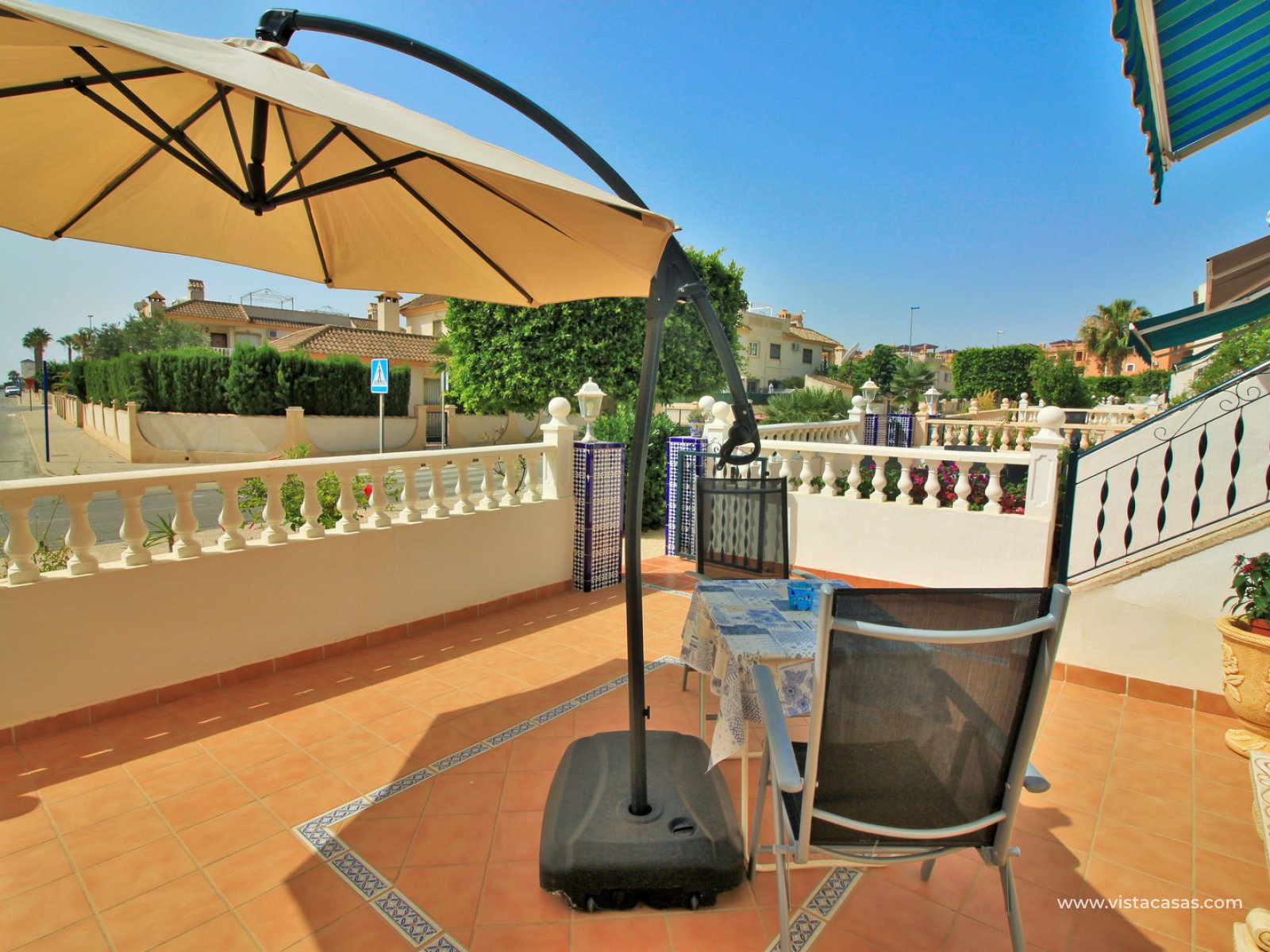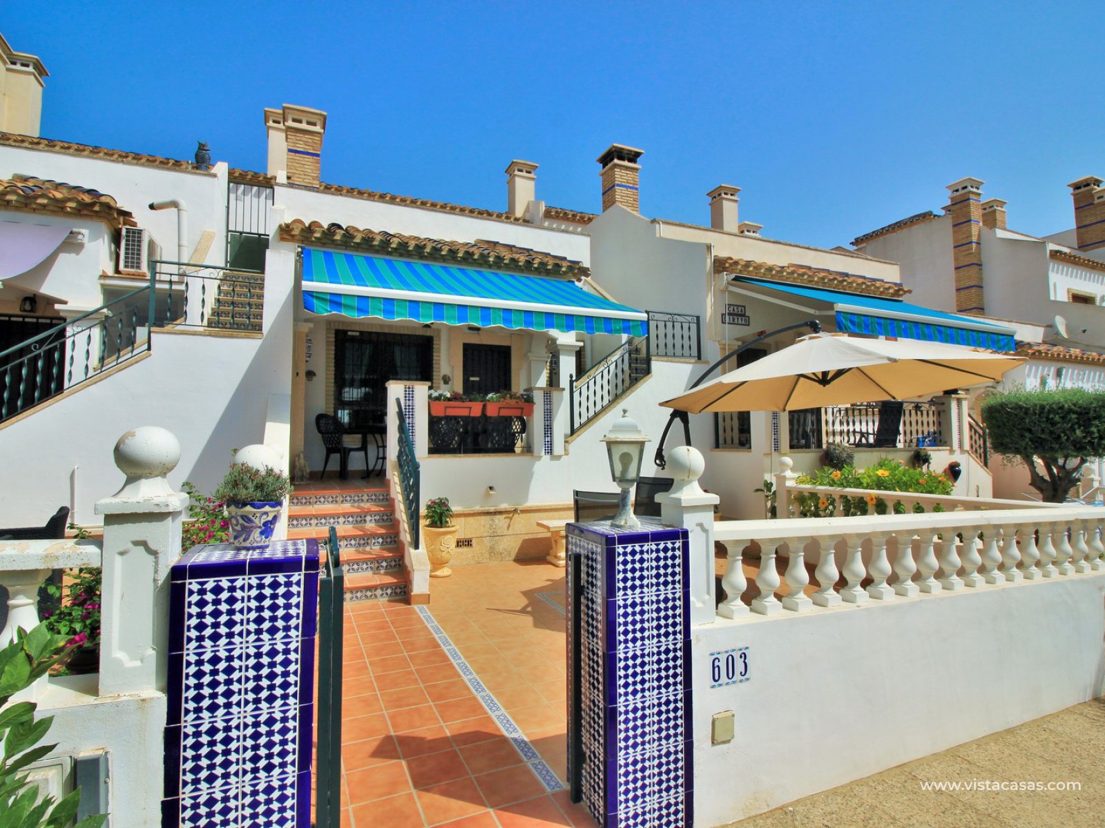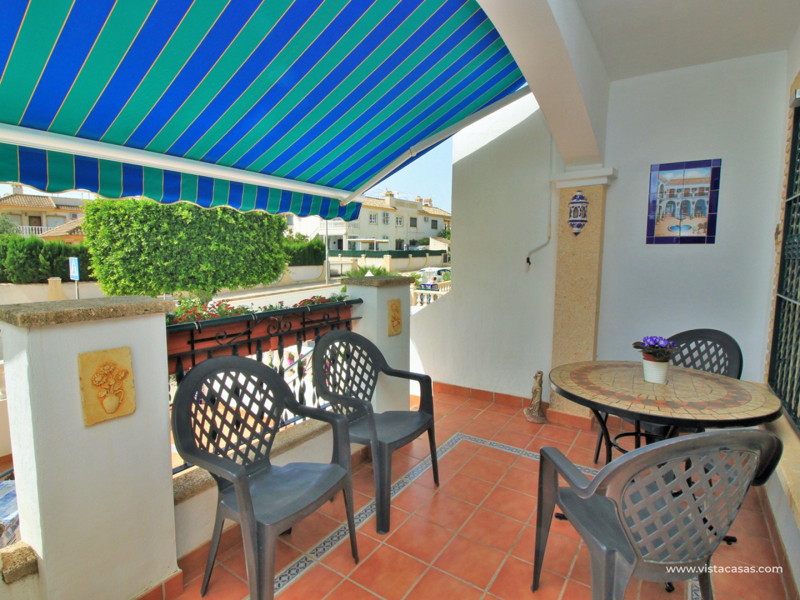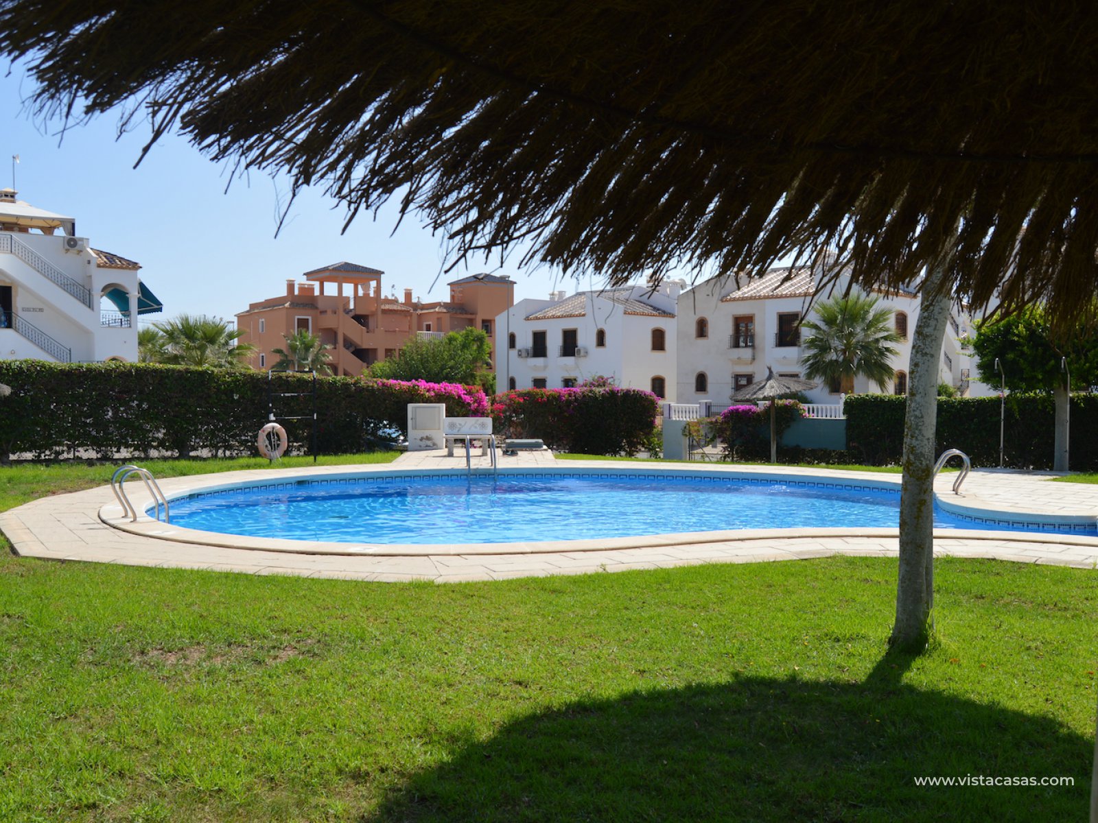 These highly desirable Lola style bungalows are in high demand, so quick viewings are advised! The property has a front and rear garden, with the front section having a covered terrace area. The ground floor comprises of a lounge-dining area with open kitchen to the side, plus a small utility cupboard. To the rear is a family bathroom and 2 bedrooms with fitted wardrobes. The master bedroom has its own en-suite bathroom with walk-in shower. French doors from the master bedroom leads out onto the rear garden area. External stairs from the front terrace leads up to the roof solarium with brick built BBQ. Part of a community with use of a beautiful communal pool and green areas. The property has been well cared for by the current owners and is in great condition including new bathrooms installed. Sold furnished with white goods, and air-conditioning in the lounge.