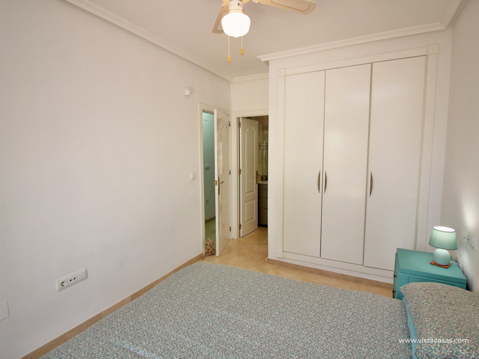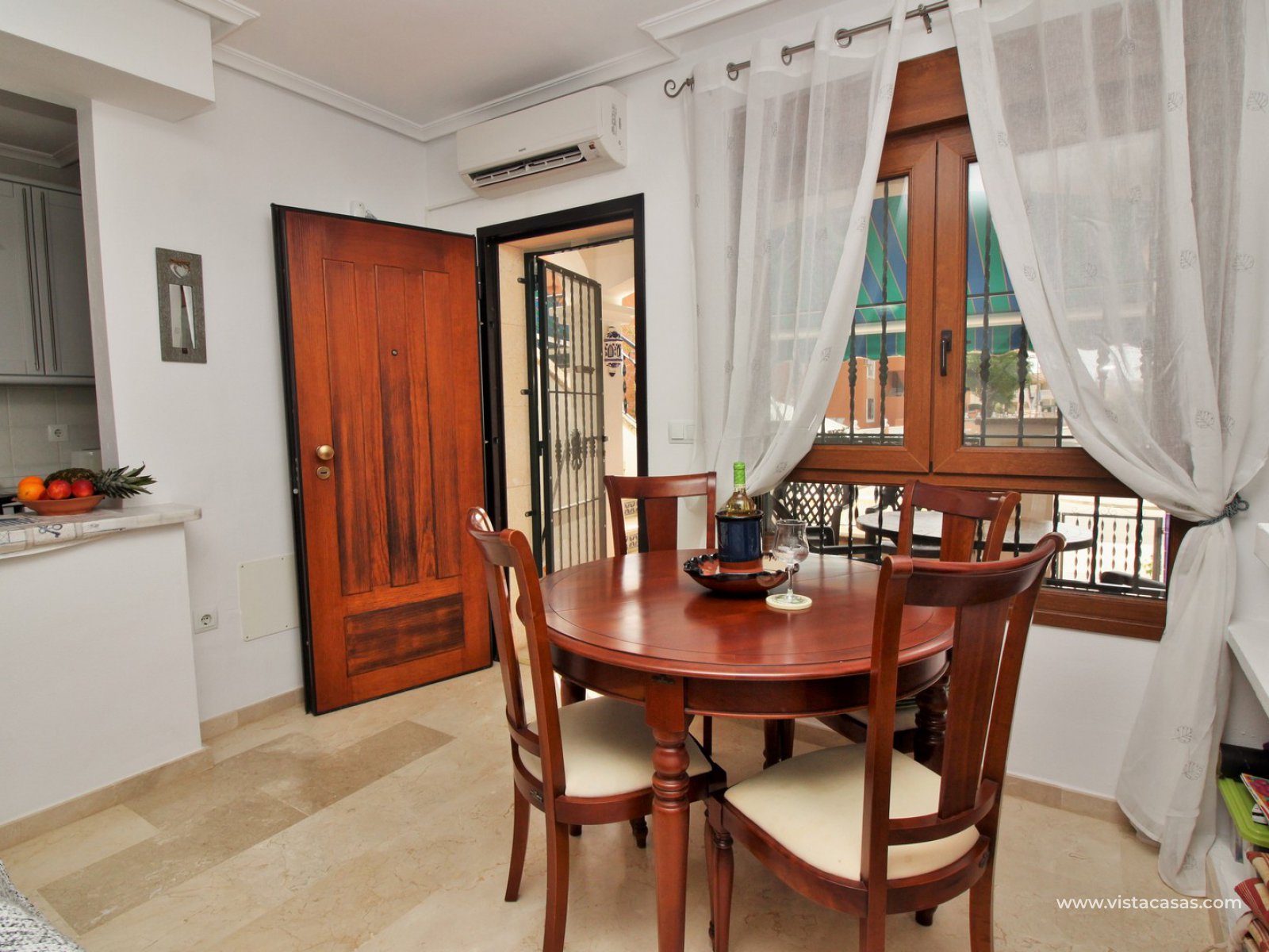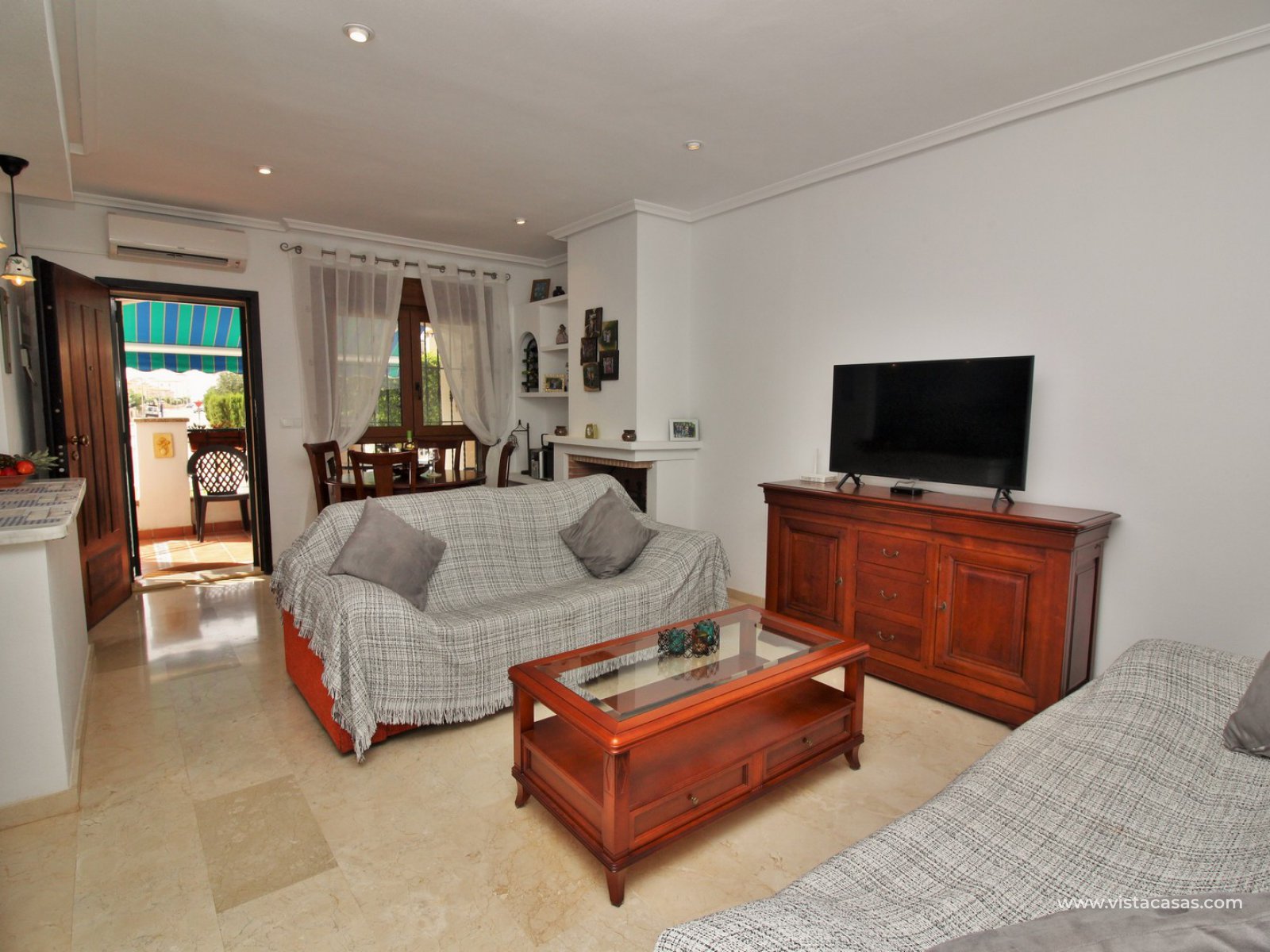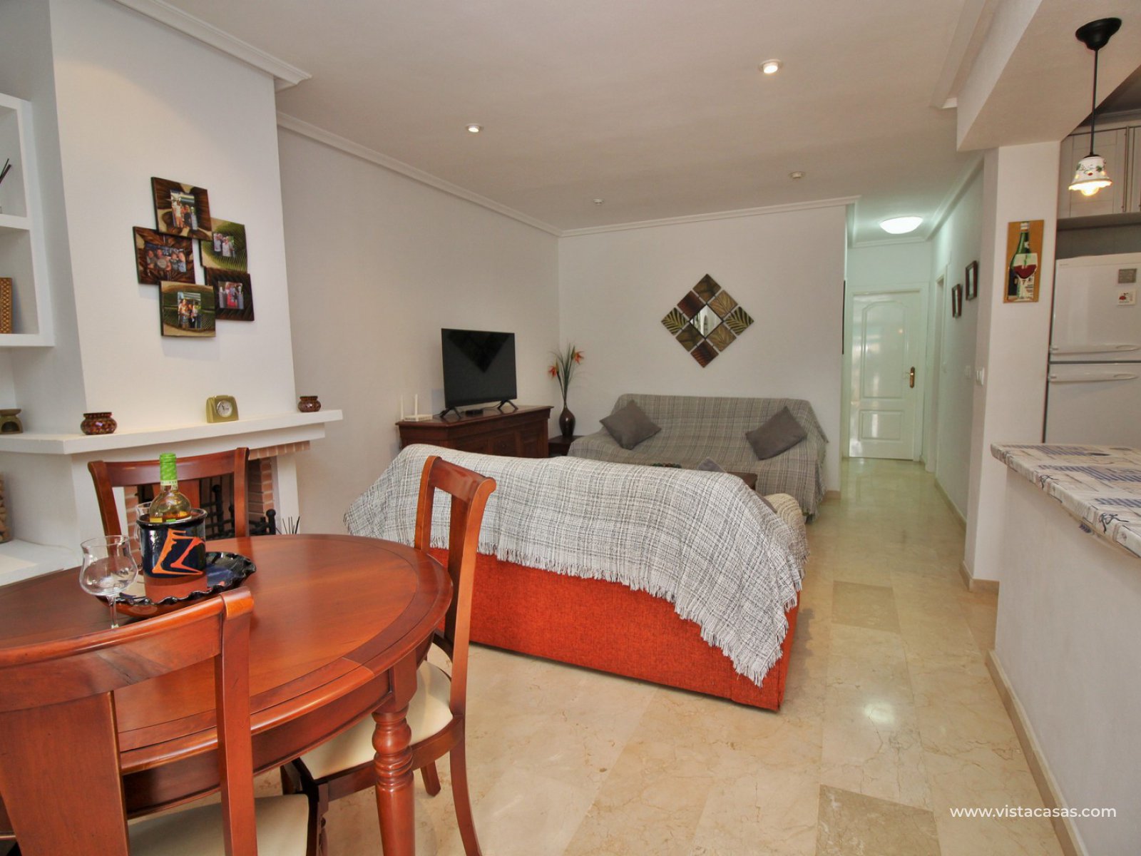 These highly desirable Lola style bungalows are in high demand, so quick viewings are advised! The property has a front and rear garden, with the front section having a covered terrace area. The ground floor comprises of a lounge-dining area with open kitchen to the side, plus a small utility cupboard. To the rear is a family bathroom and 2 bedrooms with fitted wardrobes. The master bedroom has its own en-suite bathroom with walk-in shower. French doors from the master bedroom leads out onto the rear garden area. External stairs from the front terrace leads up to the roof solarium with brick built BBQ. Part of a community with use of a beautiful communal pool and green areas. The property has been well cared for by the current owners and is in great condition including new bathrooms installed. Sold furnished with white goods, and air-conditioning in the lounge.
