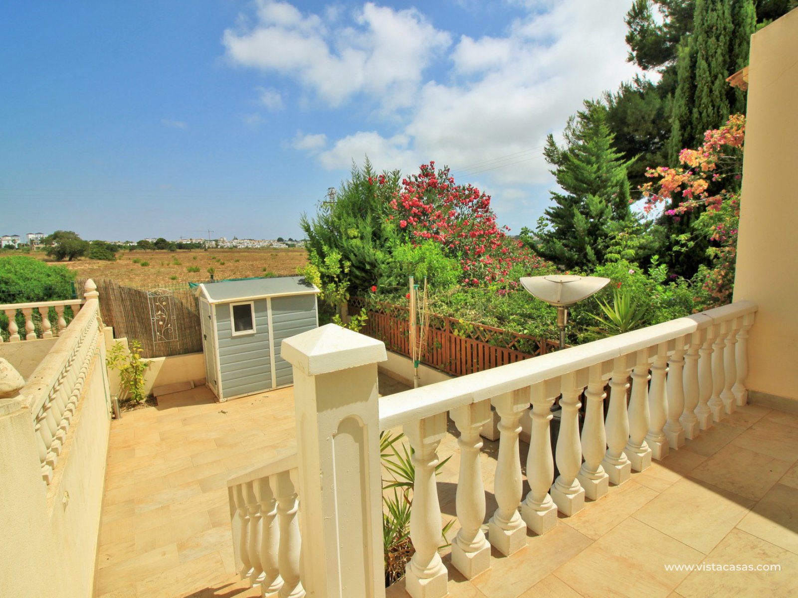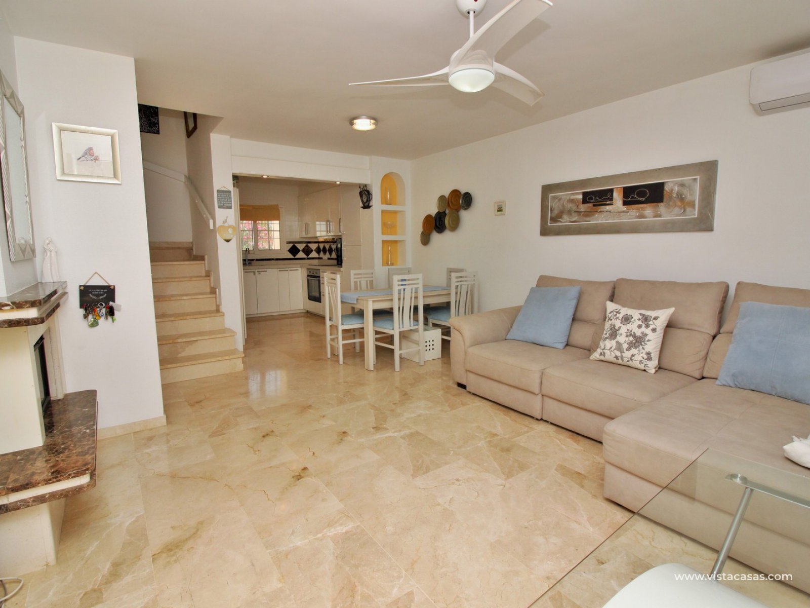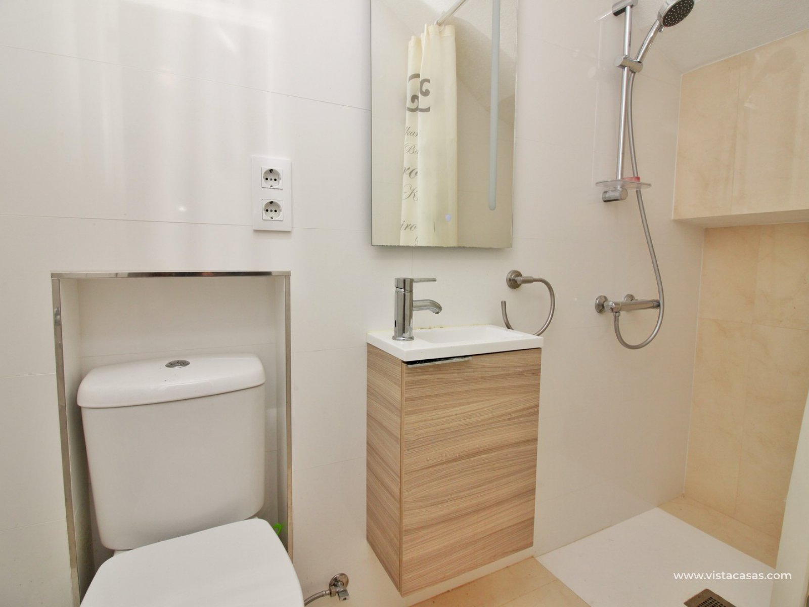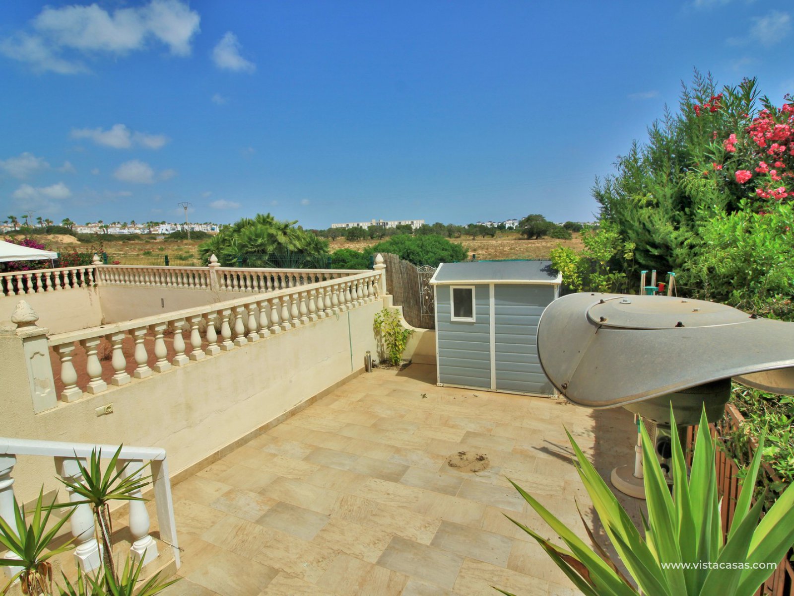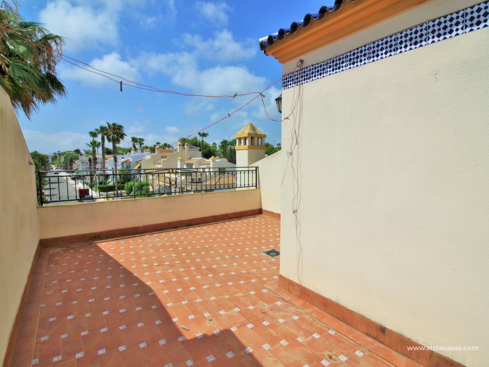 The living accommodation comprises of a good sized lounge-dining area with an open renovated kitchen to the rear and a bathroom with walk-in shower. From the kitchen is a small utility area and a rear door leading out to the back garden which offers a storage shed. Upstairs there are 2 double bedrooms with fitted wardrobes and a family bathroom with walk-in shower which has been renovated. The master bedroom benefits from a private South facing balcony. Internal stairs from the landing leads up to the sunny roof solarium with plenty of space to BBQ and sunbathe. The house is sold furnished with white goods, and has been renovated to a good standard with new kitchen, bathrooms, doors and LED lighting.
