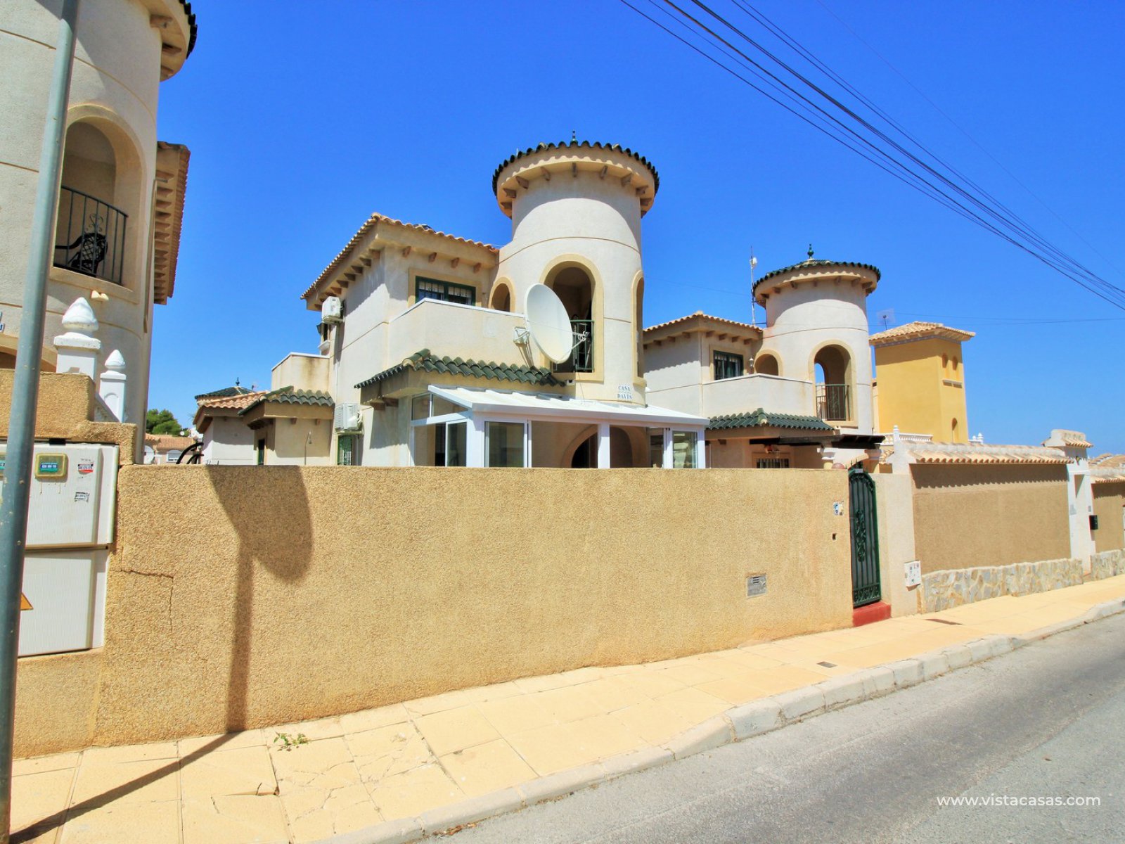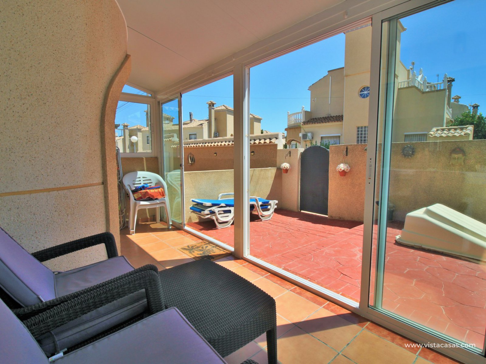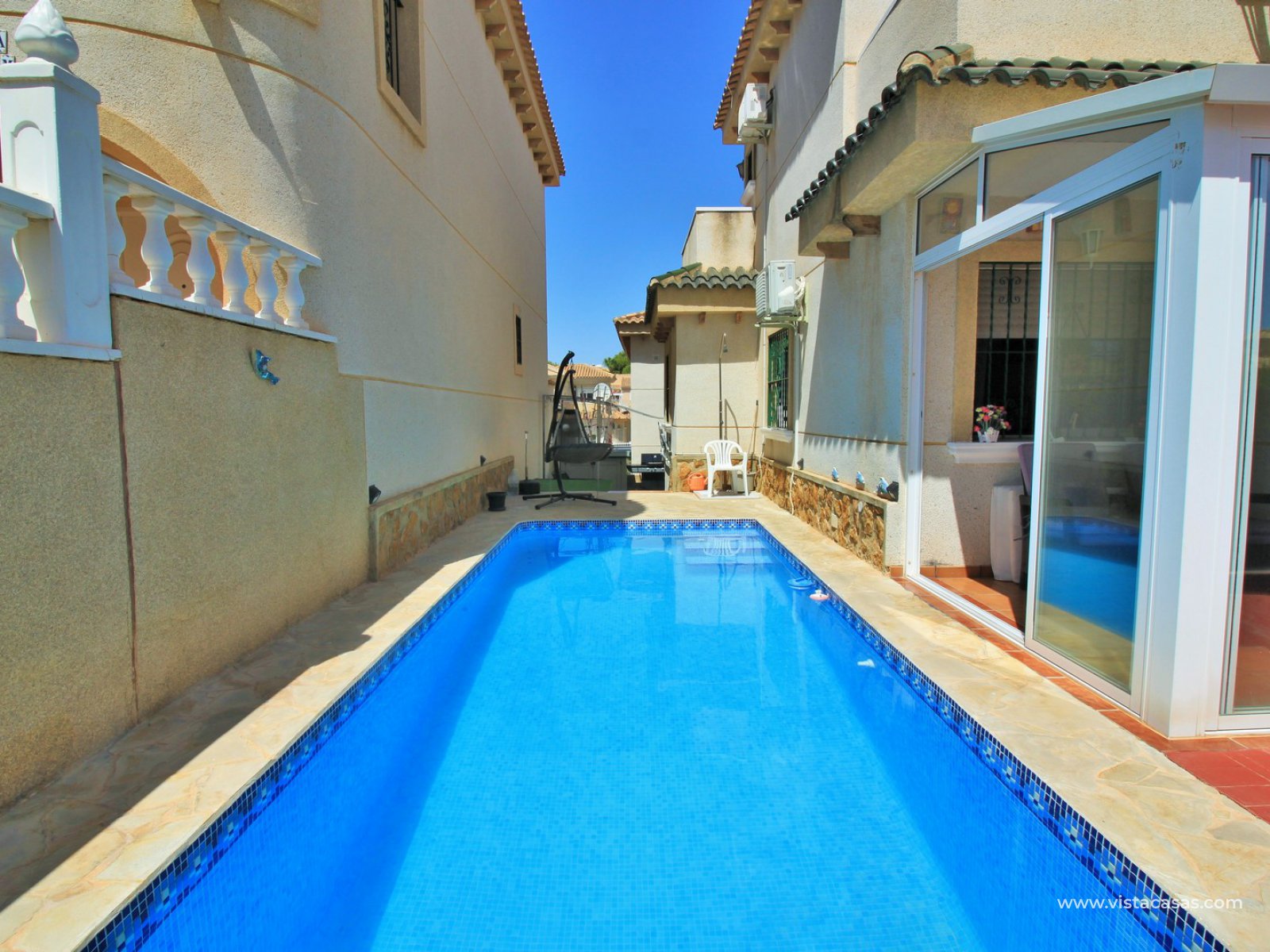 The ground floor living accommodation comprises of a lounge/dining area, renovated separate kitchen, 1 downstairs bedroom and a bathroom with walk-in shower. Upstairs are a further 2 double bedrooms with fitted wardrobes and a family bathroom. Both upstairs bedrooms offer private balconies, with the master bedroom offering a South facing balcony that is partially covered. Outside there is a front conservatory with sliding doors leading out to the private garden and pool area. Sold furnished with air-conditioning and solar panels for hot water.