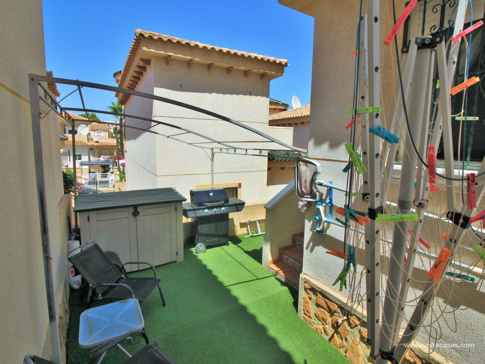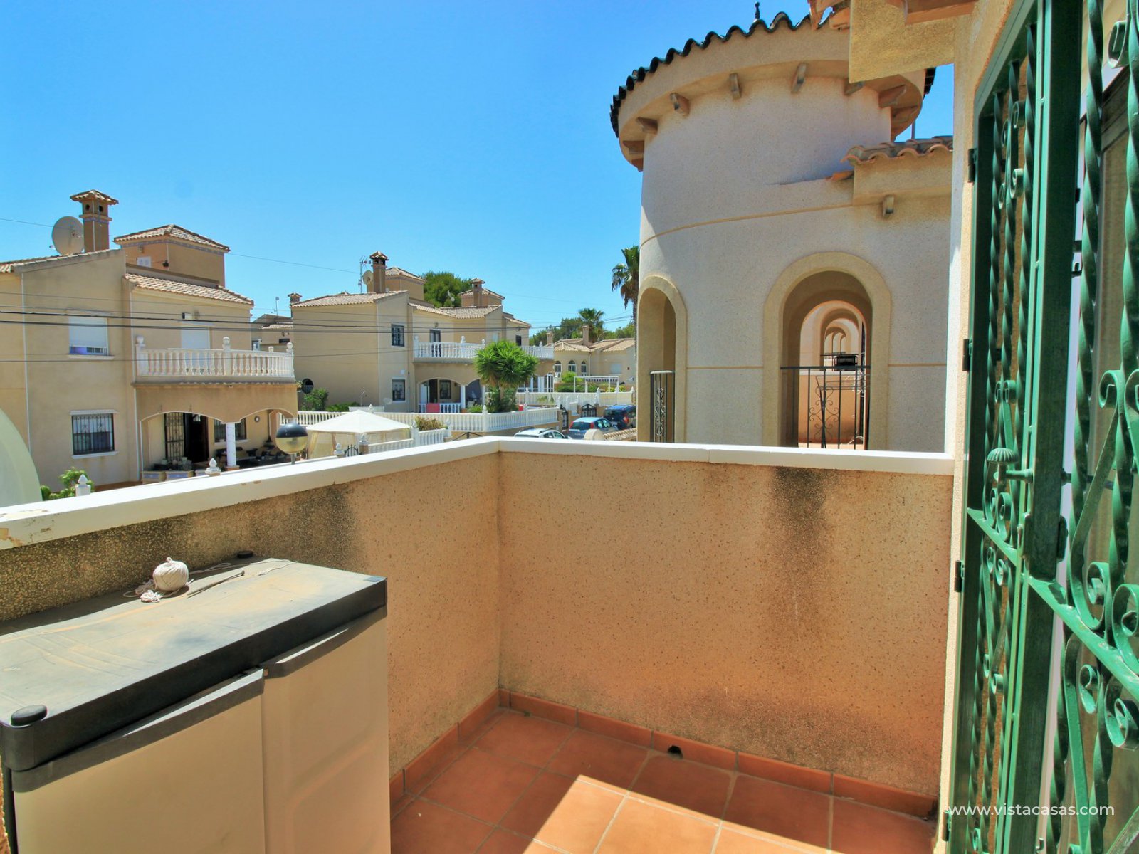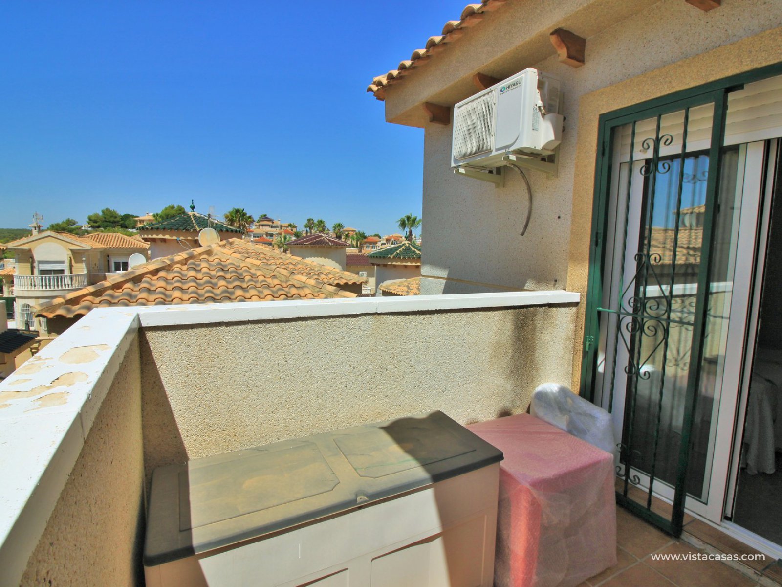 The ground floor living accommodation comprises of a lounge/dining area, renovated separate kitchen, 1 downstairs bedroom and a bathroom with walk-in shower. Upstairs are a further 2 double bedrooms with fitted wardrobes and a family bathroom. Both upstairs bedrooms offer private balconies, with the master bedroom offering a South facing balcony that is partially covered. Outside there is a front conservatory with sliding doors leading out to the private garden and pool area. Sold furnished with air-conditioning and solar panels for hot water.
